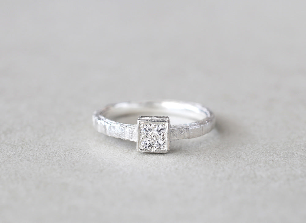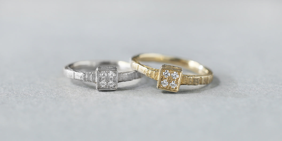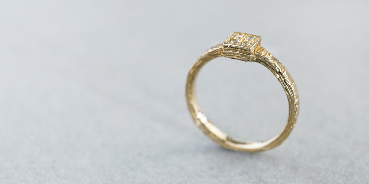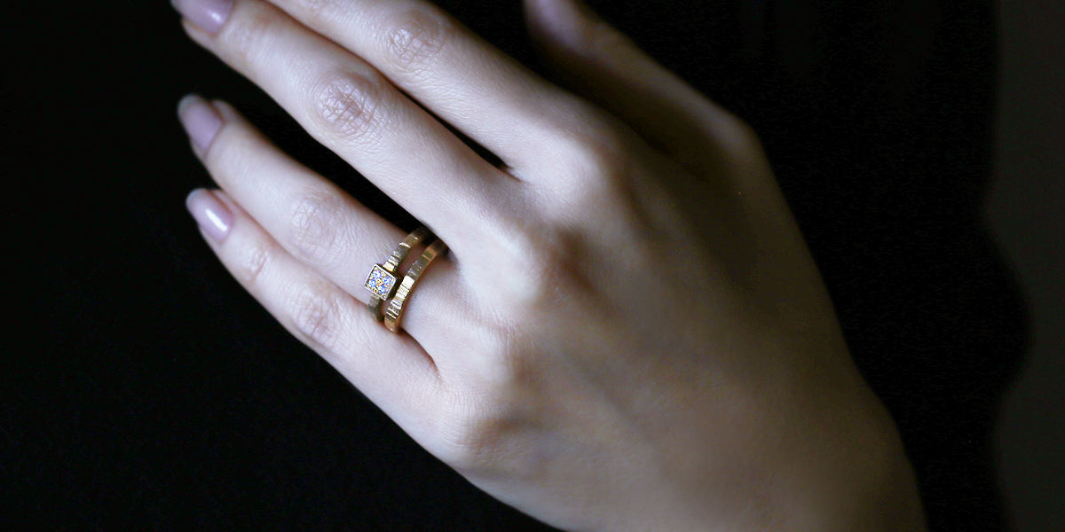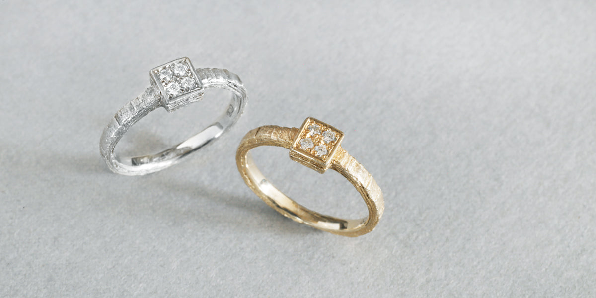 Eon -quatre- ( イエン クアトロ )時の重なりをイメージした、幾重にもなる層から作られたエンゲージリング ( 婚約指輪 ) 。スクエアトップに4石彫り留められたダイヤモンドが、穏やかで複雑な表情をしたリングにささやかに煌めきます。