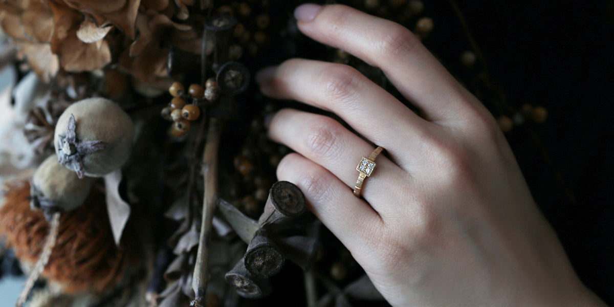 ※マリッジリングとエンゲージリングをRyuiであわせてオーダーいただいた方へ、祝福の気持ちを込めたささやかなギフトとして、幸運を運ぶとされる鳥をモチーフにした「渡り鳥のピンブローチ」をプレゼントいたします(写真8枚目/真鍮製)。