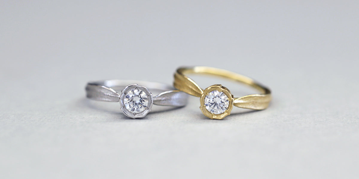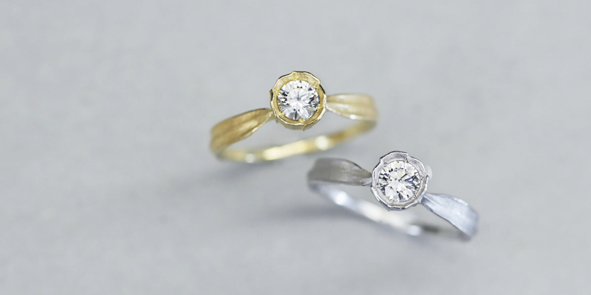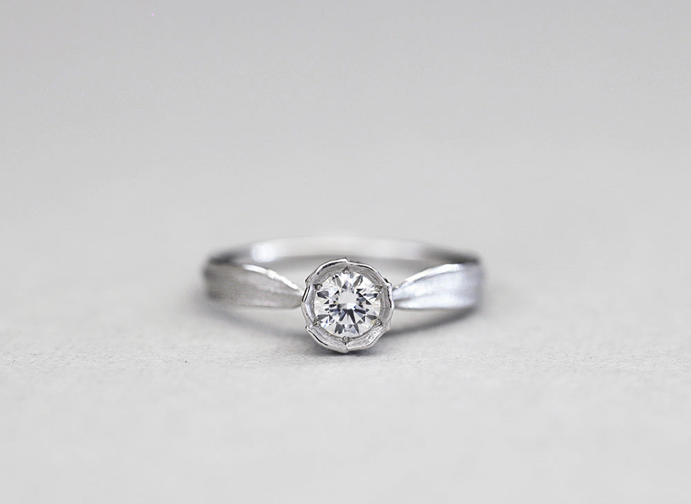 Tulip ( チューリップ )"思いやり"という花言葉を持つチューリップ。つつましく飾らない一輪の花に、これからも続くお互いへの思いやりの気持ちを込めて。緻密に表現された花びらの1枚1枚が澄んだ輝きを放つダイヤモンドをやわらかく包み込み、リングには柔らかな2枚の葉をあしらった、可憐で凛とした印象のエンゲージリング ( 婚約指輪 ) です。