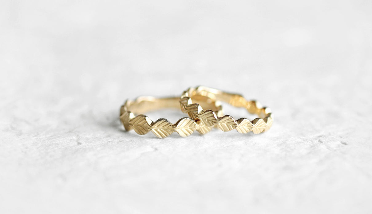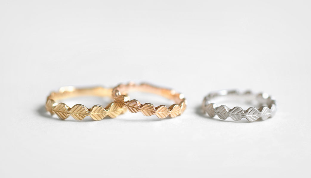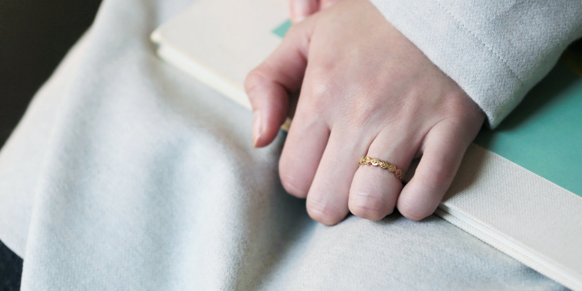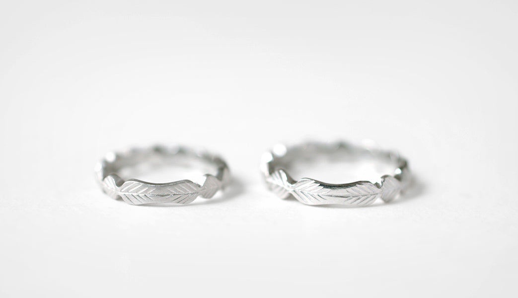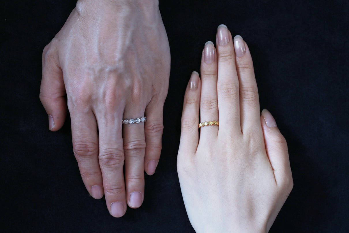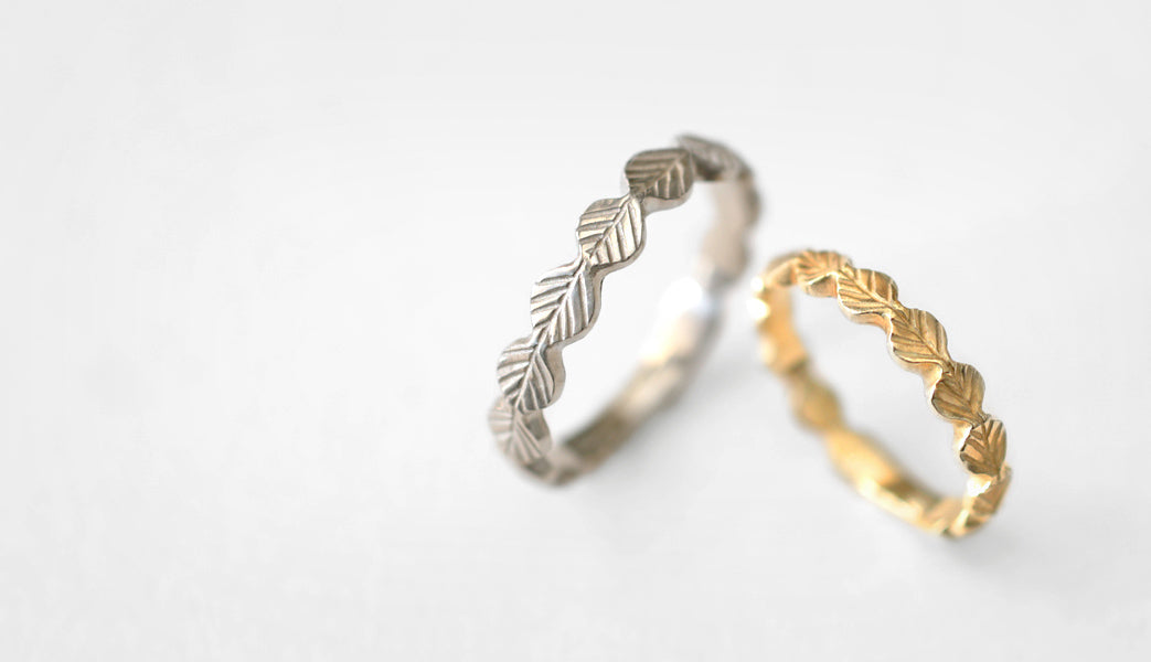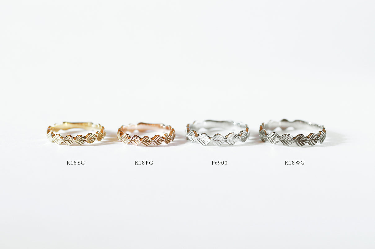 Leaf ( リーフ ) いくつも連なる葉っぱをモチーフとし、一枚いち枚わずかに異なる表情に遊び心を感じるマリッジリング ( 結婚指輪 ) 。 光を仰ぐ瑞々しい新緑の若葉のように 気持ち新たなお二人の想いを形に込めました。緩急の個性引き立つやわらかな葉のフォルムがさりげなく華やかに手元を飾ります。
