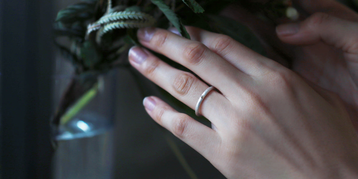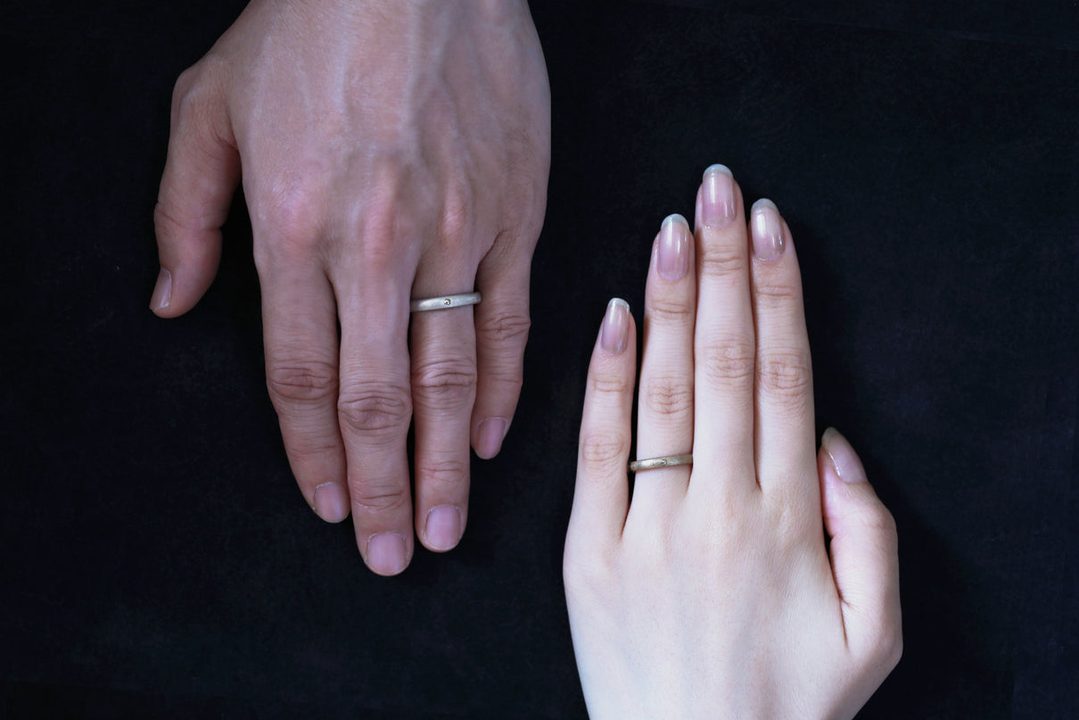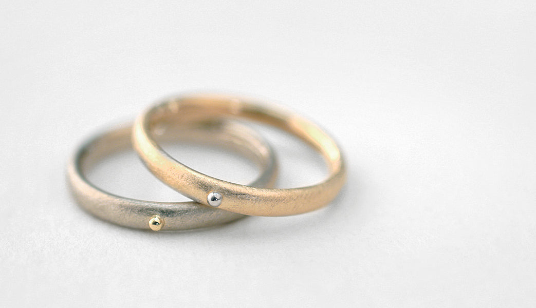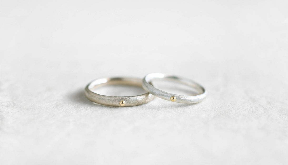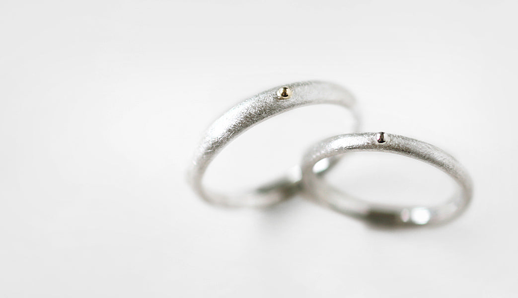 Dot ( ドット ) 二つのそれぞれの時の流れが混ざり合う最初の点 。そんな情景を想いデザインされたマリッジリング ( 結婚指輪 ) 。プレーンな表情に、対になるリングの地金の粒がちょこんと艶めき、シンプルながらもさりげない個性が光ります。眺めるたび、いつも初心に帰るように、共に歩み出すお二人の出発点のシンボルにふさわしい粒="Dot"です。