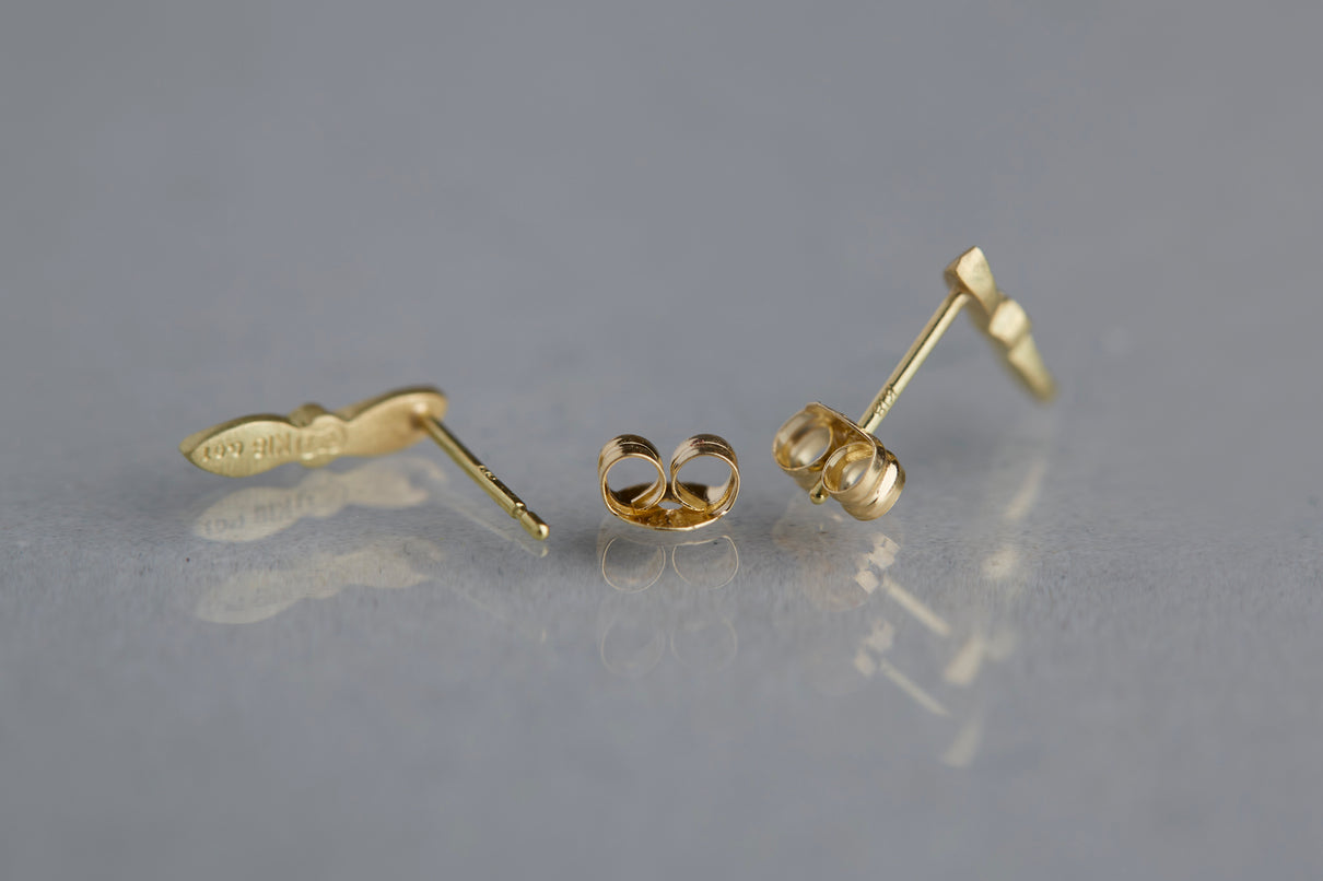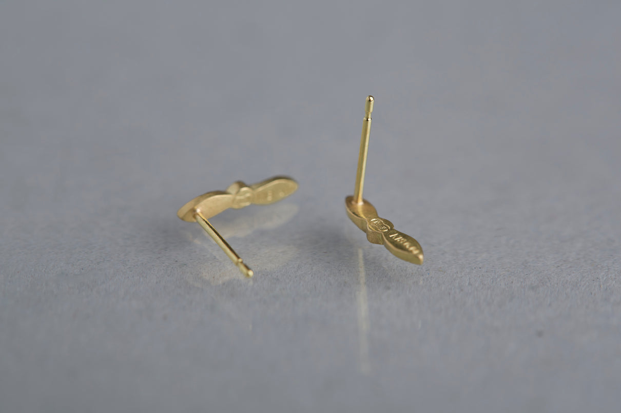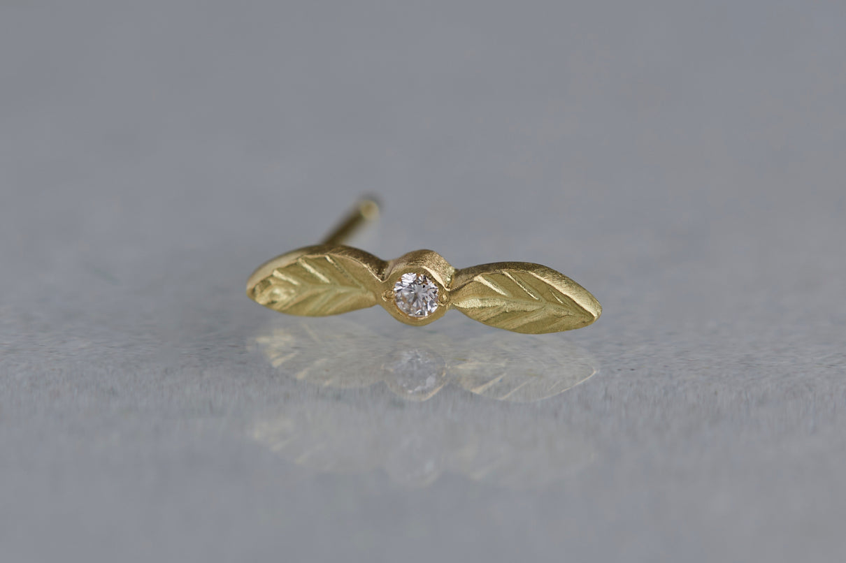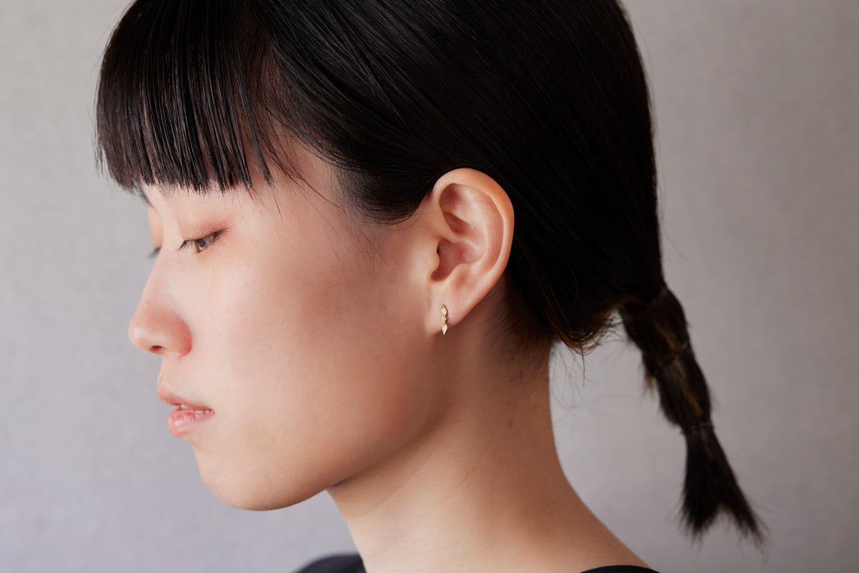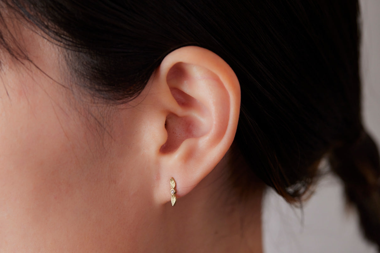 開花の季節を待つ小さな蕾をモチーフにした " Bloom " コレクションから誕生したスタッドピアス。瑞々しい蕾に見立てたダイヤモンドに寄り添う繊細な2枚の葉に宿る手彫りの表情に、小さい中にも生命の息吹を感じさせます。眩い煌めきを放つクリアカラーのダイヤモンドの輝きと、1枚1枚わずかに異なる表情を持つイエローゴールドの葉の艶めきが響き合い、耳元にささやかな華やぎをもたらします。小ぶりなモチーフで、耳からさりげなく溢れるよう儚げに留まります。