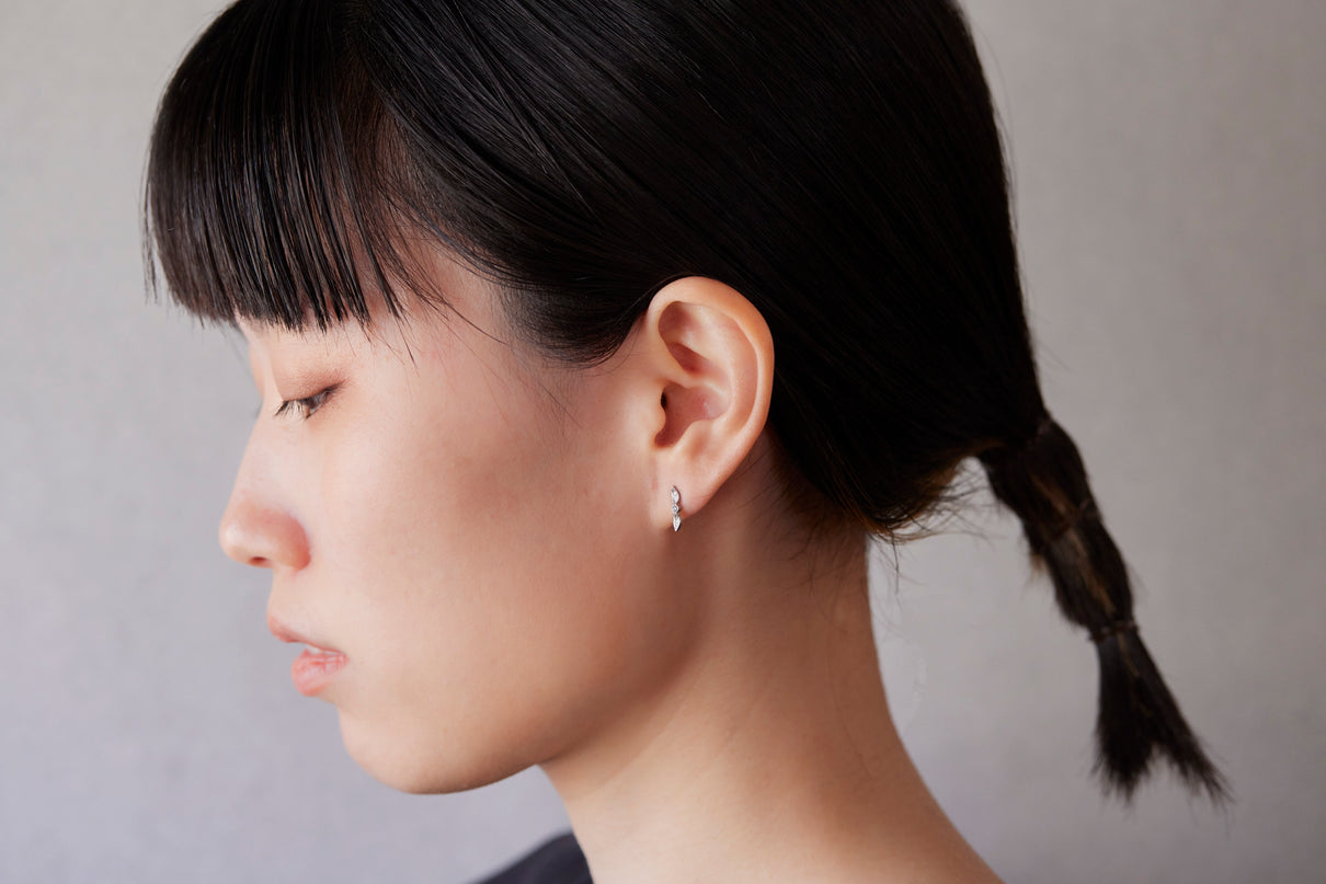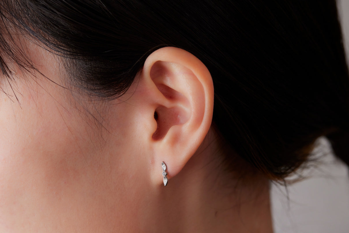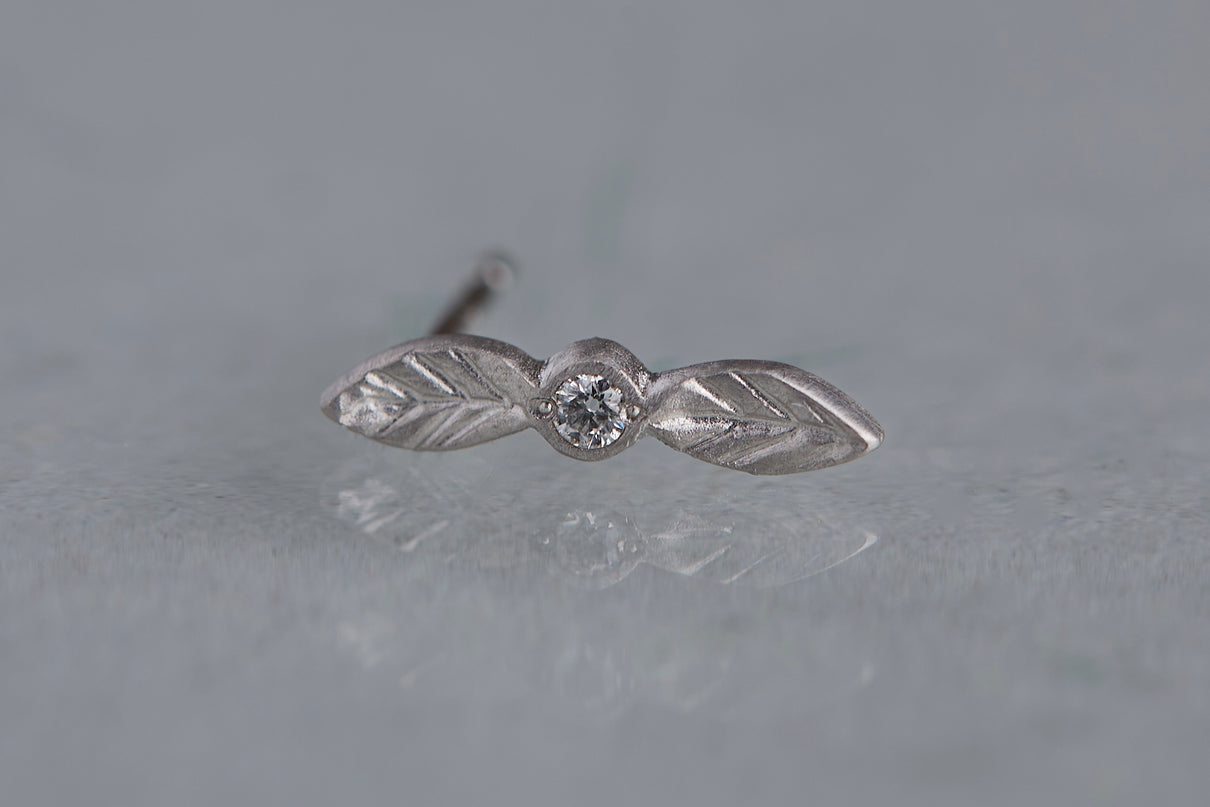 開花の季節を待つ小さな蕾をモチーフにした " Bloom " コレクションから誕生したスタッドピアス。瑞々しい蕾に見立てたダイヤモンドに寄り添う繊細な2枚の葉に宿る手彫りの表情は、小さい中にも生命の息吹を感じさせます。眩い煌めきを放つクリアカラーのダイヤモンドの輝きと、1枚1枚わずかに異なる表情を持つプラチナの葉の艶めきが響き合い、耳元にささやかな華やぎをもたらします。小ぶりなモチーフで、耳からさりげなく溢れるよう儚げに留まります。