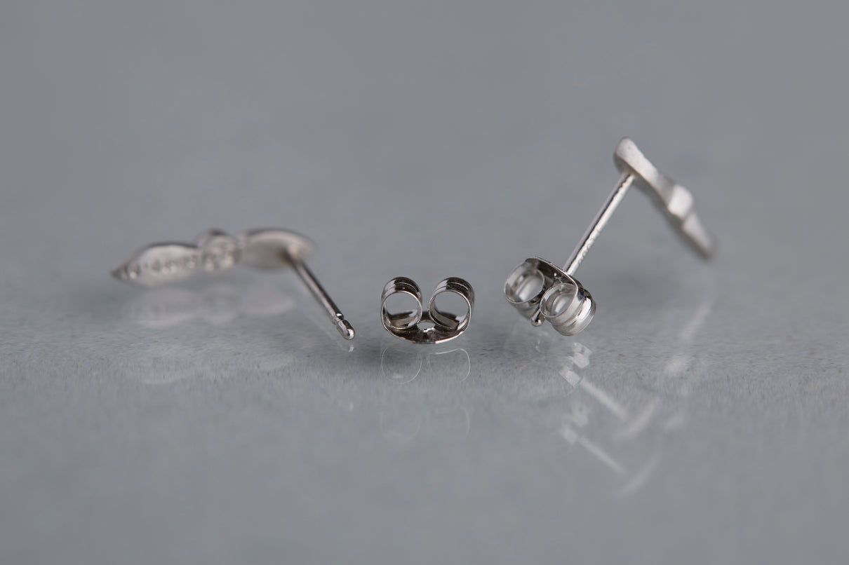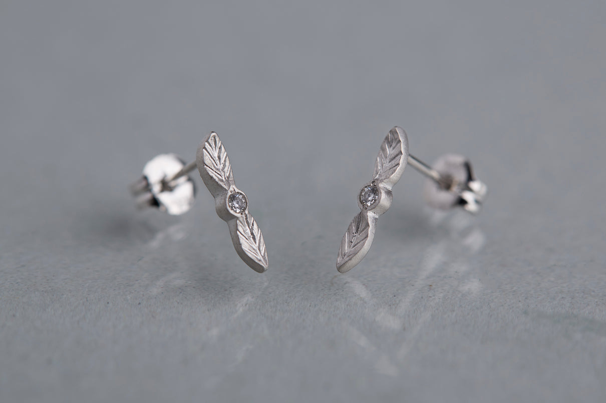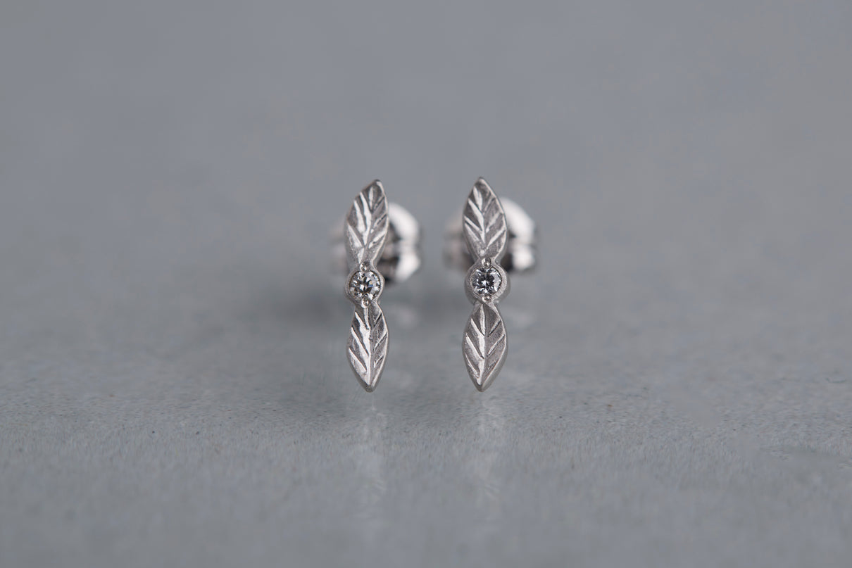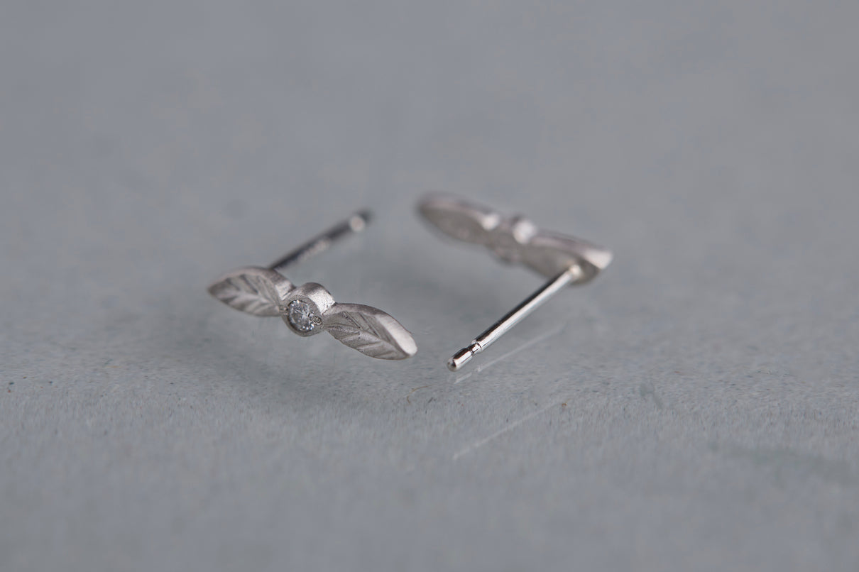 開花の季節を待つ小さな蕾をモチーフにした " Bloom " コレクションから誕生したスタッドピアス。瑞々しい蕾に見立てたダイヤモンドに寄り添う繊細な2枚の葉に宿る手彫りの表情は、小さい中にも生命の息吹を感じさせます。眩い煌めきを放つクリアカラーのダイヤモンドの輝きと、1枚1枚わずかに異なる表情を持つプラチナの葉の艶めきが響き合い、耳元にささやかな華やぎをもたらします。小ぶりなモチーフで、耳からさりげなく溢れるよう儚げに留まります。