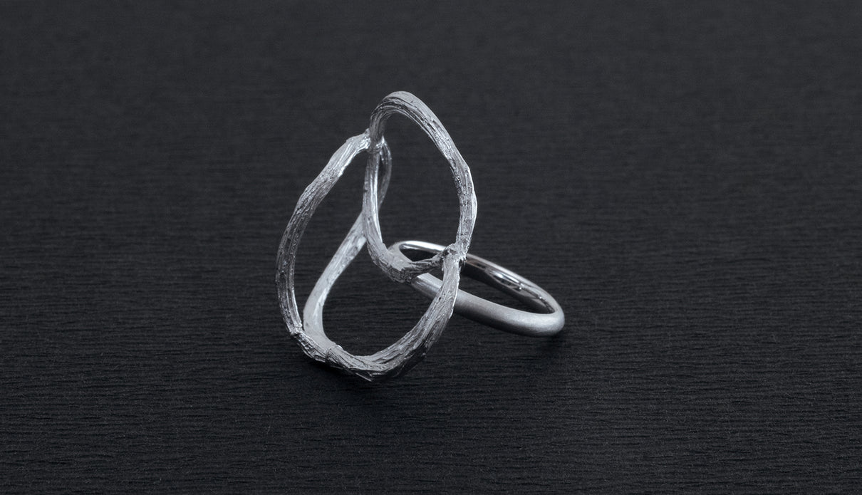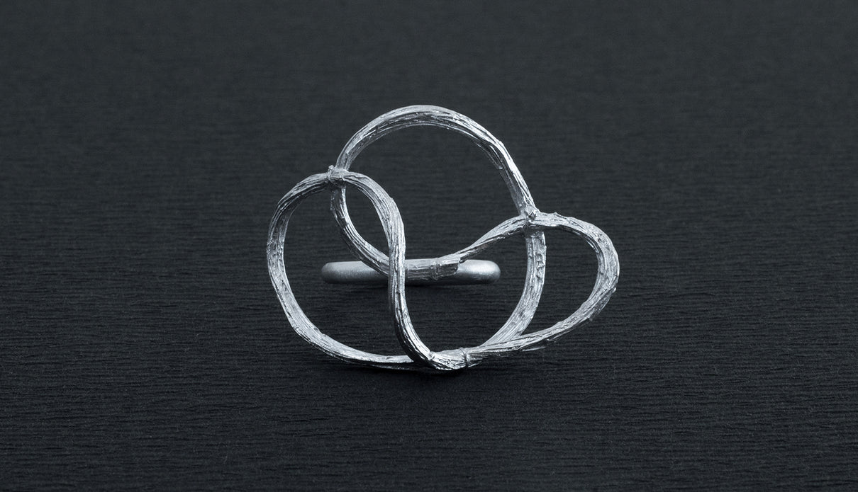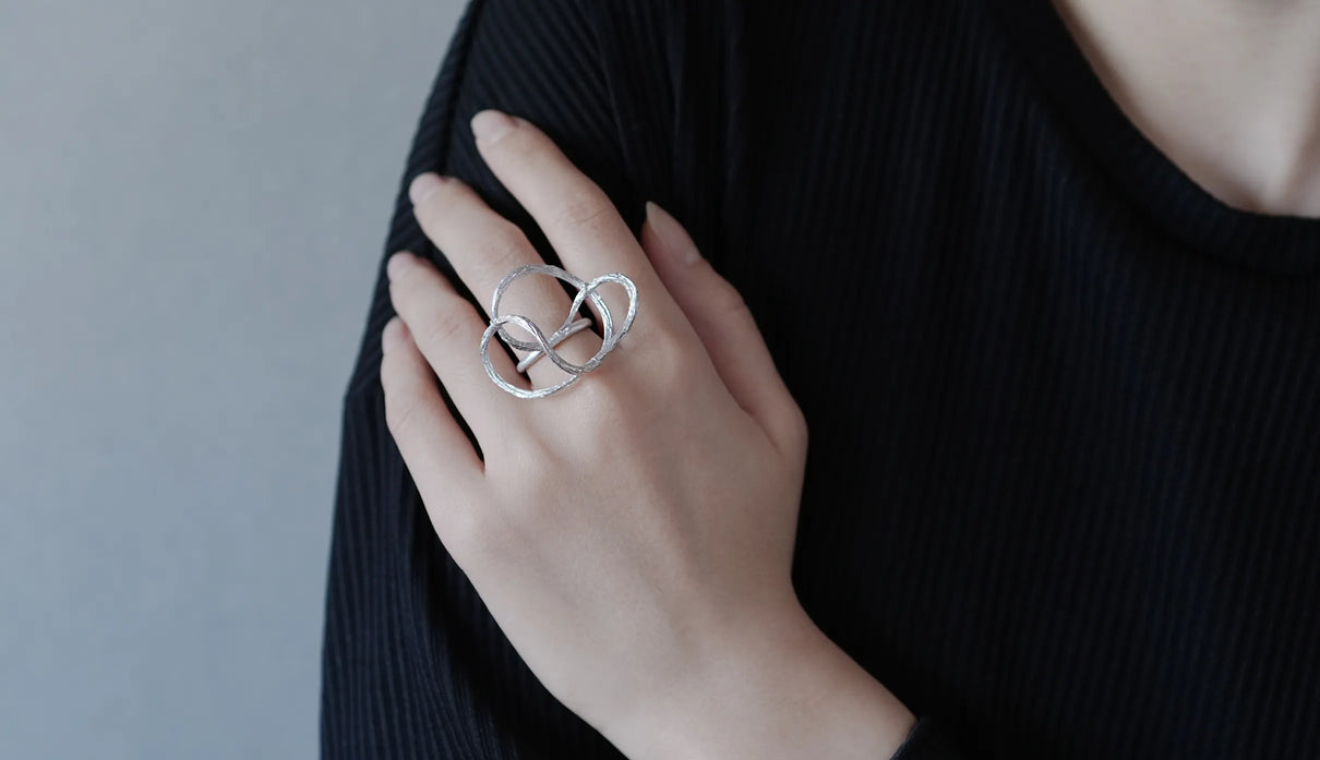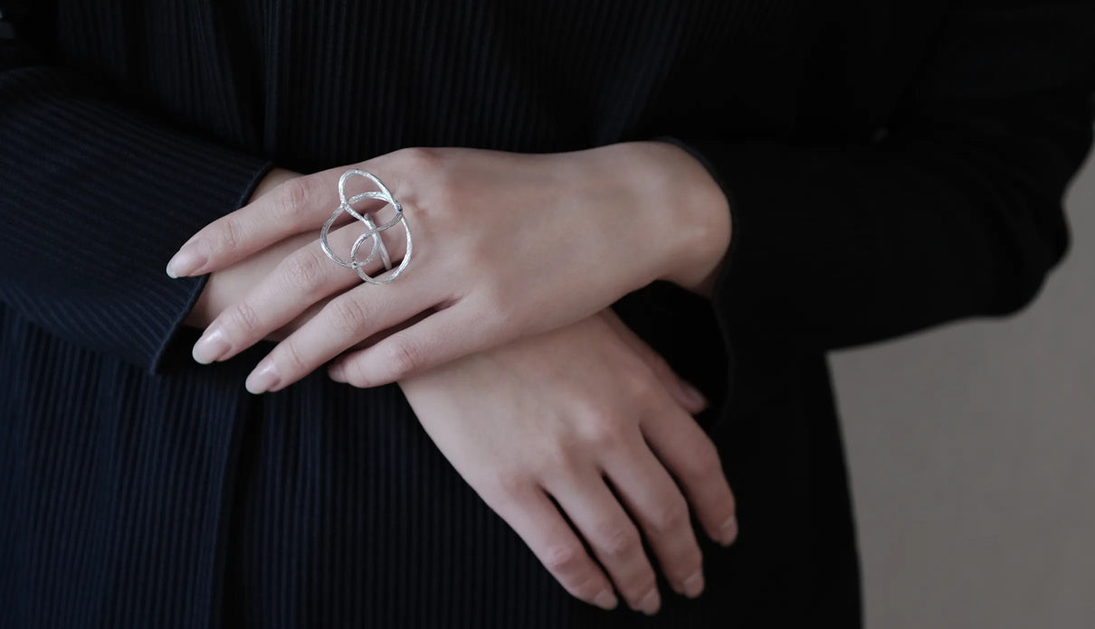 2025 Collection "Nexus −つながり−" シリーズのシルバーリング。わたしはわたし以外であるー。わたしというひとつの小さな点はわたし以外の全てとつながっていて、循環する輪のようなひとつの形となっている様子を表現したデザインです。複雑にうねる有機的な形状は、見る角度によって異なる数多くの表情を見せます。立体的に仕立てた構造で、柔らかな光を伴う半光沢の質感で仕上げた表面からは落ち着きのある佇まいを感じられます。たおやかなカーブを描くモチーフは指元に浮かぶようにとどまり、その付け心地はとても軽やか。形容しがたい不思議な姿形が装いを引き立て、唯一無二の個性を放ちます。