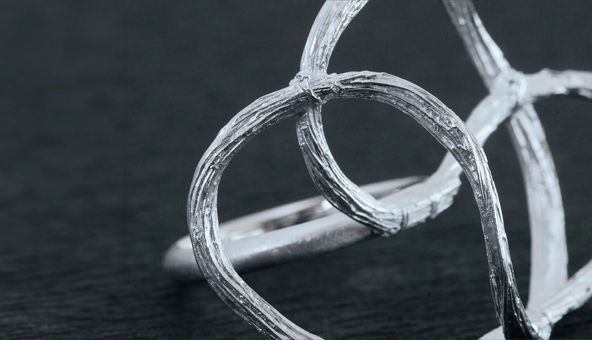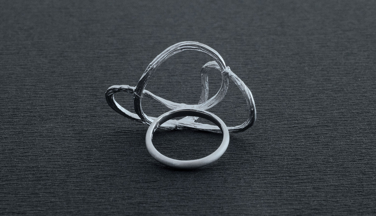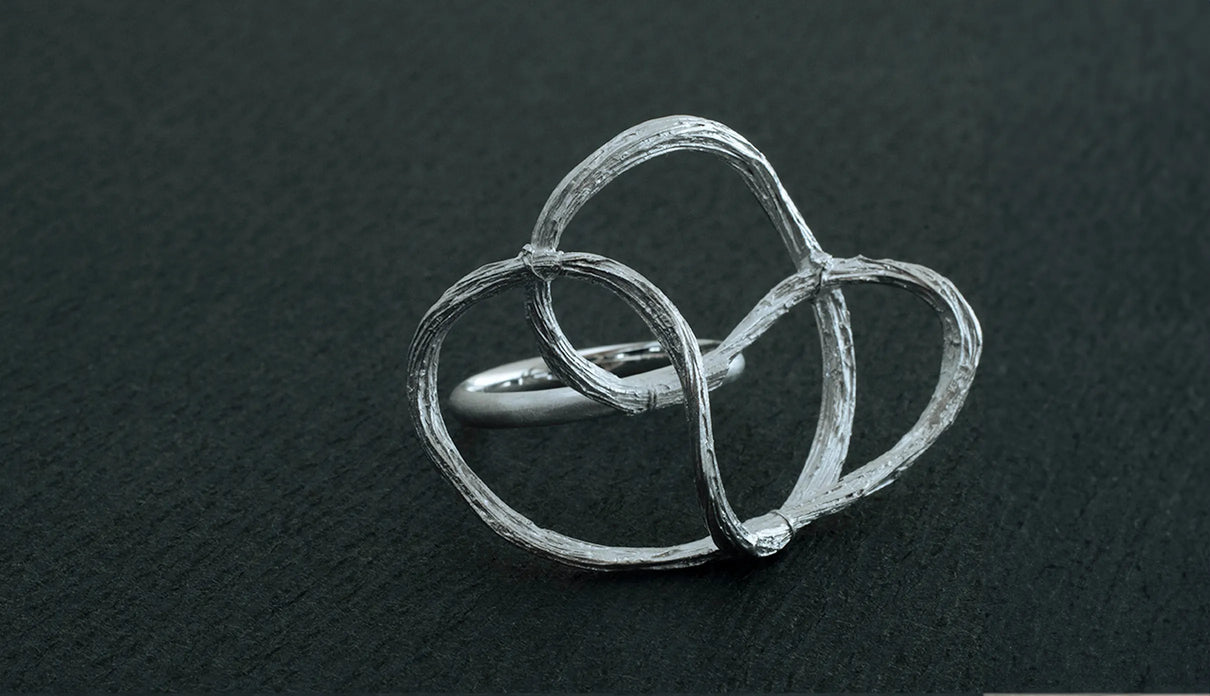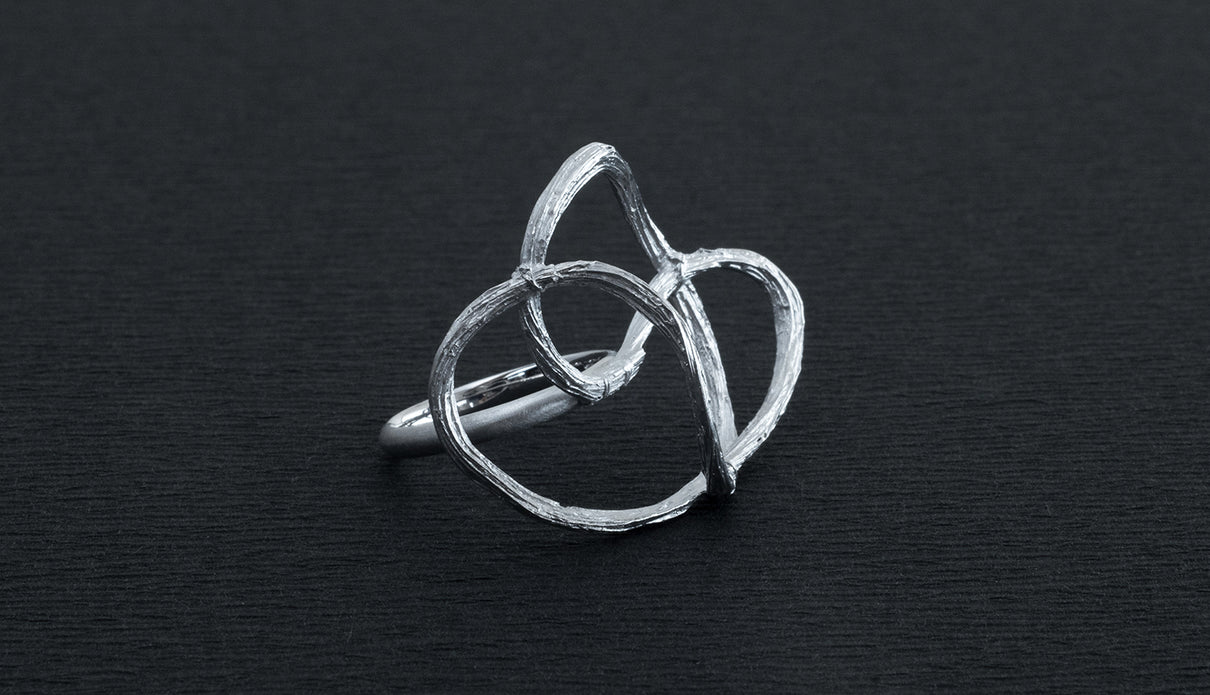 2025 Collection "Nexus −つながり−" シリーズのシルバーリング。わたしはわたし以外であるー。わたしというひとつの小さな点はわたし以外の全てとつながっていて、循環する輪のようなひとつの形となっている様子を表現したデザインです。複雑にうねる有機的な形状は、見る角度によって異なる数多くの表情を見せます。立体的に仕立てた構造で、柔らかな光を伴う半光沢の質感で仕上げた表面からは落ち着きのある佇まいを感じられます。たおやかなカーブを描くモチーフは指元に浮かぶようにとどまり、その付け心地はとても軽やか。形容しがたい不思議な姿形が装いを引き立て、唯一無二の個性を放ちます。