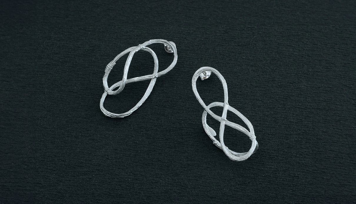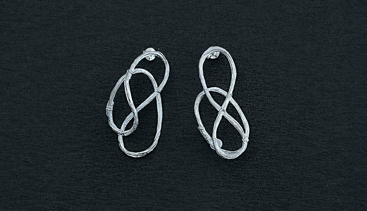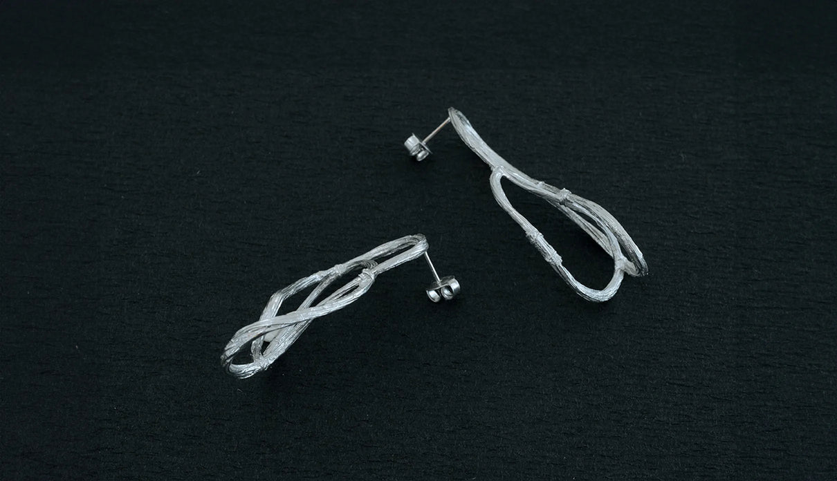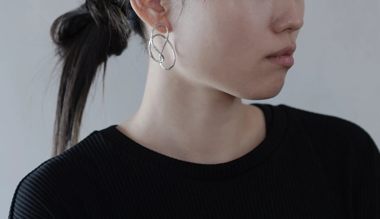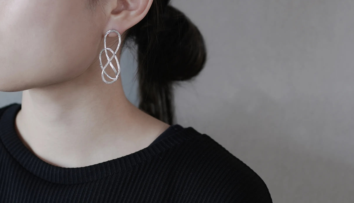 2025 Collection "Nexus −つながり−" シリーズのシルバーピアス。わたしはわたし以外であるー。わたしというひとつの小さな点はわたし以外の全てとつながっていて、循環する輪のようなひとつの形となっている様子を表現したデザインです。複雑にうねる有機的な形状は、見る角度によって異なる数多くの表情を見せます。柔らかな光を伴う半光沢の質感で仕上げた表面からは、落ち着きのある佇まいを感じられます。あえて左右非対称の姿形のデザインで抜けのある構造のために、見た目の印象よりも軽やかな付け心地です。耳たぶからこぼれ落ちるようにつく不思議な姿形は装いの主役として唯一無二の個性を放ちます。