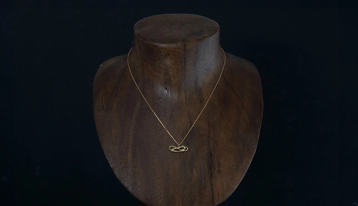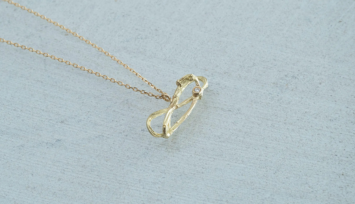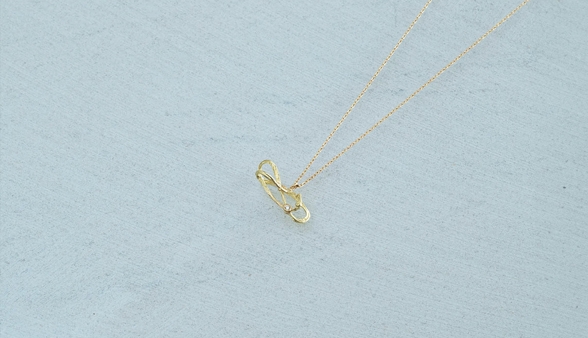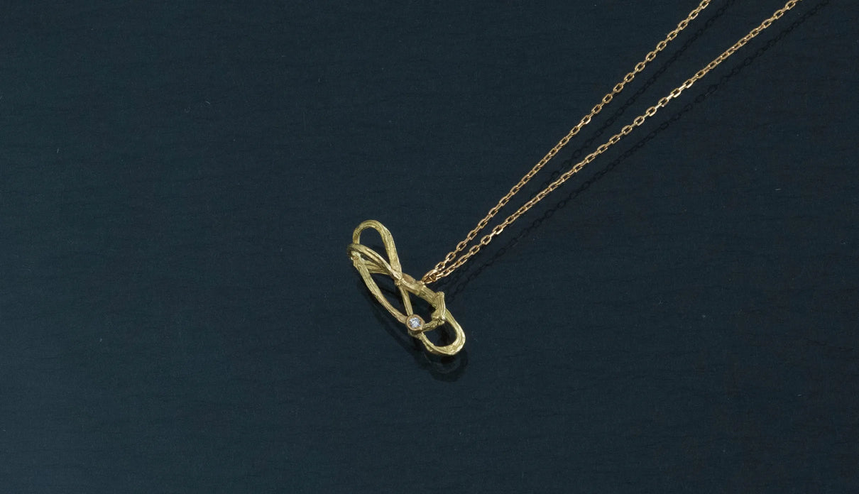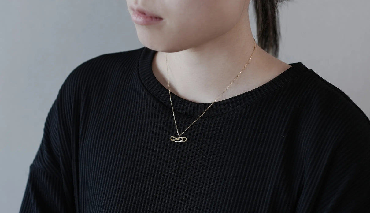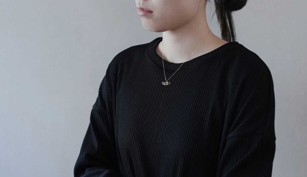2025 Collection "Nexus −つながり−" シリーズのK18イエローゴールドネックレス。わたしはわたし以外であるー。わたしというひとつの小さな点はわたし以外の全てとつながっていて、循環する輪のようなひとつの形となっている様子を表現したデザインです。複雑にうねる有機的な形状は、見る角度によって異なる数多くの表情を見せます。つながりの中に配した一石のメレダイヤモンドは、柔らかな光を伴う半光沢の質感で仕上げたイエローゴールドの中で、然りげなく煌めきを湛えます。シンプルながら立体的な構造を持ち、さりげなくも個性を放つアイテムです。軽やかな付け心地は装いを選ばず、日常的に身に着けていただけます。大切な方への贈り物にもおすすめのネックレスです。