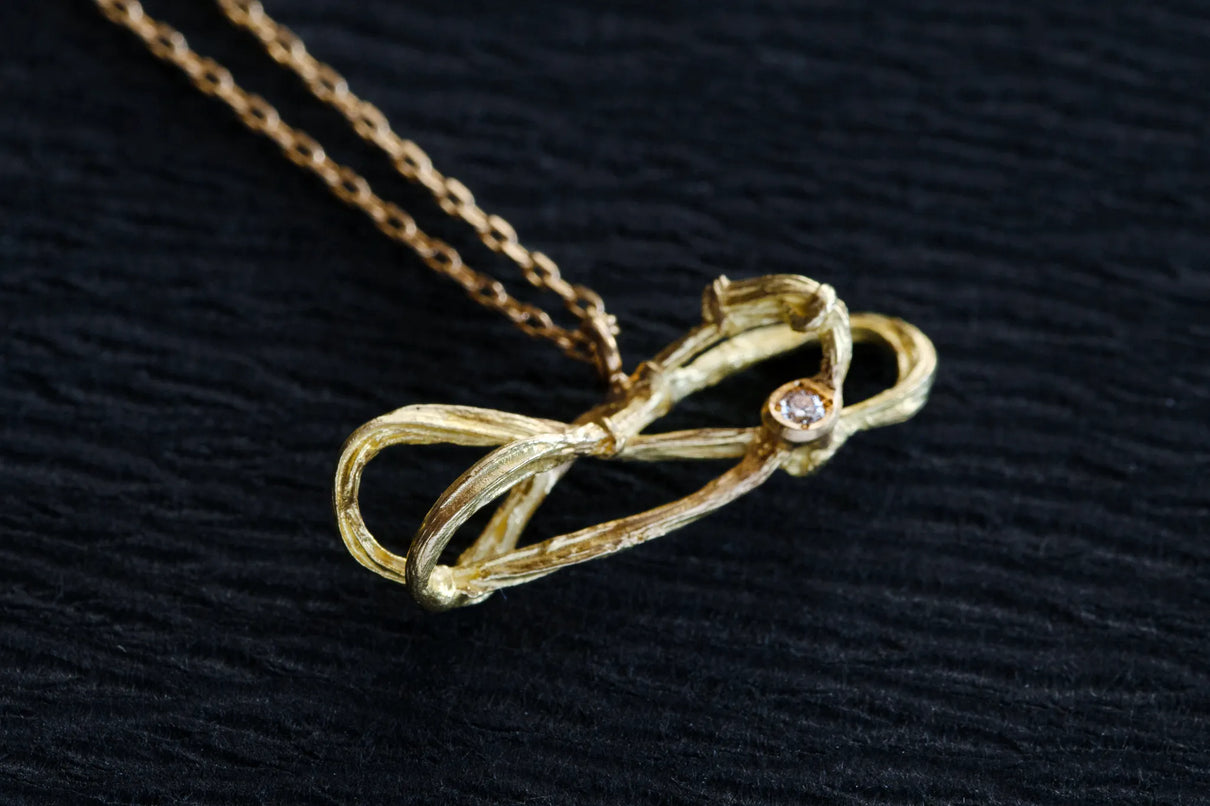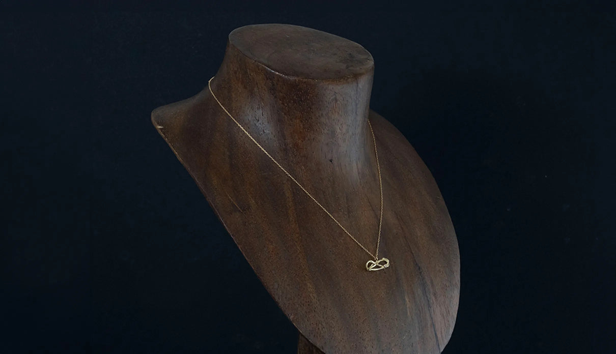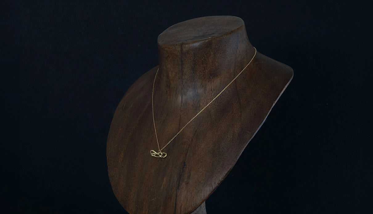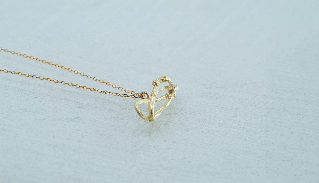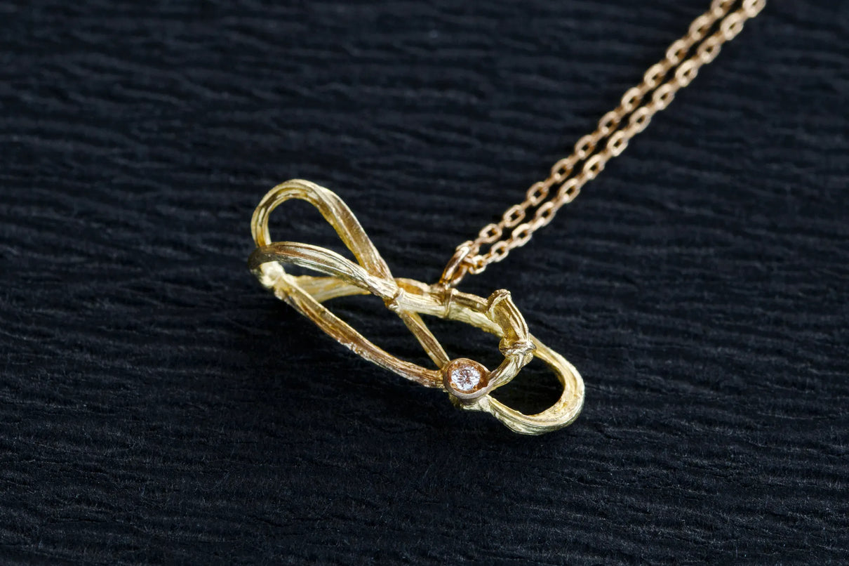 2025 Collection "Nexus −つながり−" シリーズのK18イエローゴールドネックレス。わたしはわたし以外であるー。わたしというひとつの小さな点はわたし以外の全てとつながっていて、循環する輪のようなひとつの形となっている様子を表現したデザインです。複雑にうねる有機的な形状は、見る角度によって異なる数多くの表情を見せます。つながりの中に配した一石のメレダイヤモンドは、柔らかな光を伴う半光沢の質感で仕上げたイエローゴールドの中で、然りげなく煌めきを湛えます。シンプルながら立体的な構造を持ち、さりげなくも個性を放つアイテムです。軽やかな付け心地は装いを選ばず、日常的に身に着けていただけます。大切な方への贈り物にもおすすめのネックレスです。