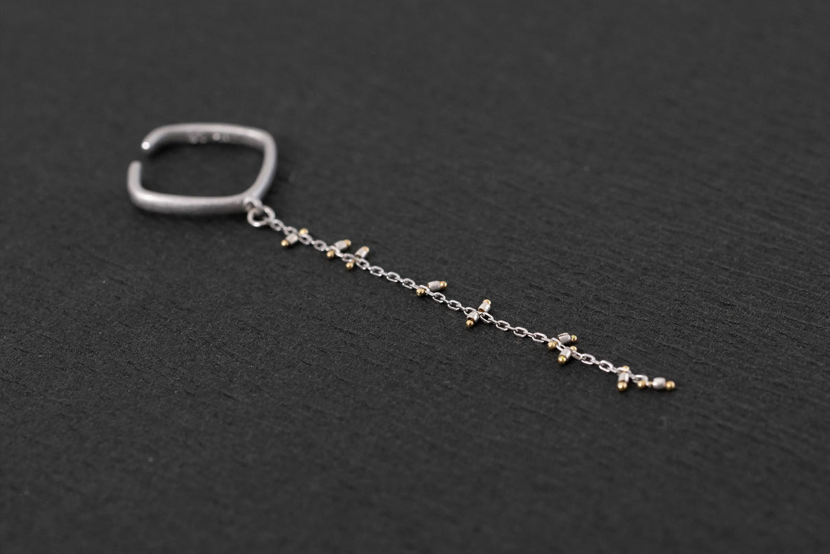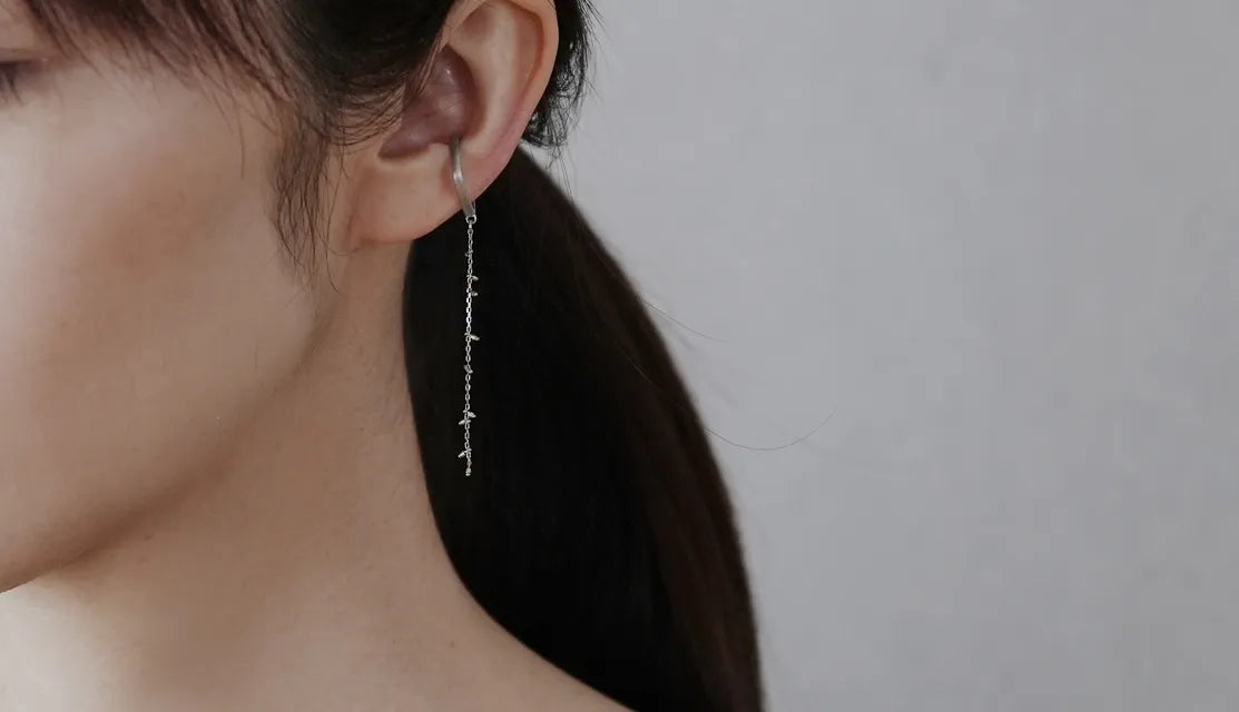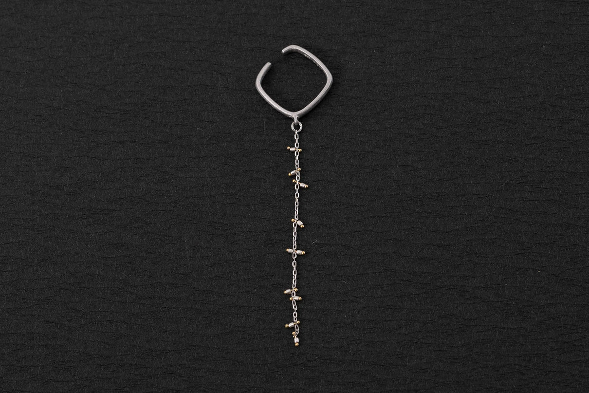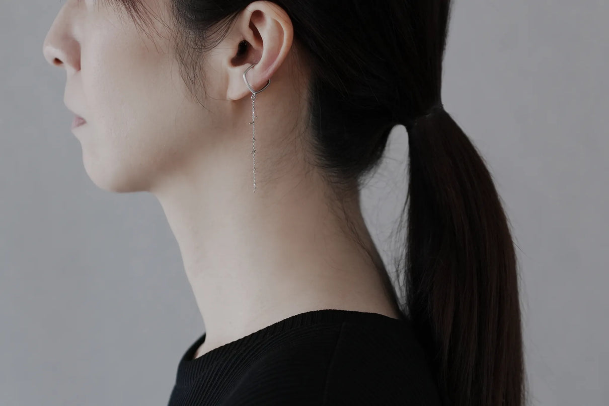 三味線の形から着想を得て作られたSyamiシリーズのイヤーカフに、小ぶりなサイズのSyami little ear cuffが登場。人気のSlight scentのチェーンが寄り添い、体の動きに合わせて繊細に揺れる姿をお愉しみいただけます。細めのチェーンにランダムに付いた銀色の繊細なカレンシルバービーズ。光の加減でさり気なく輝きます。一つでもバランスが取りやすいアイテムですが、スタッドピアスなどとのコーディネートもおすすめです。
