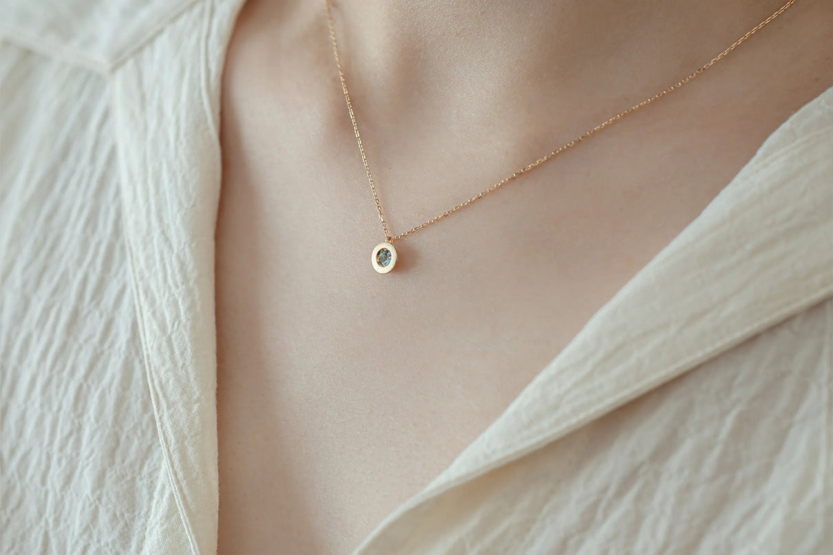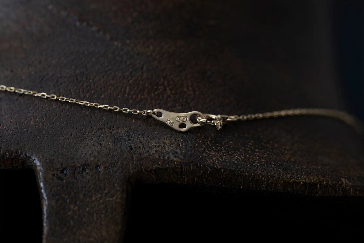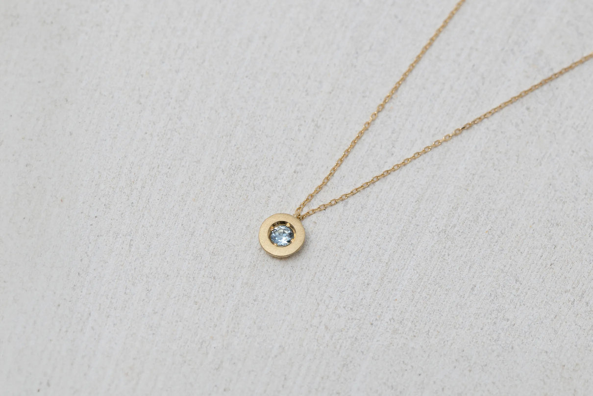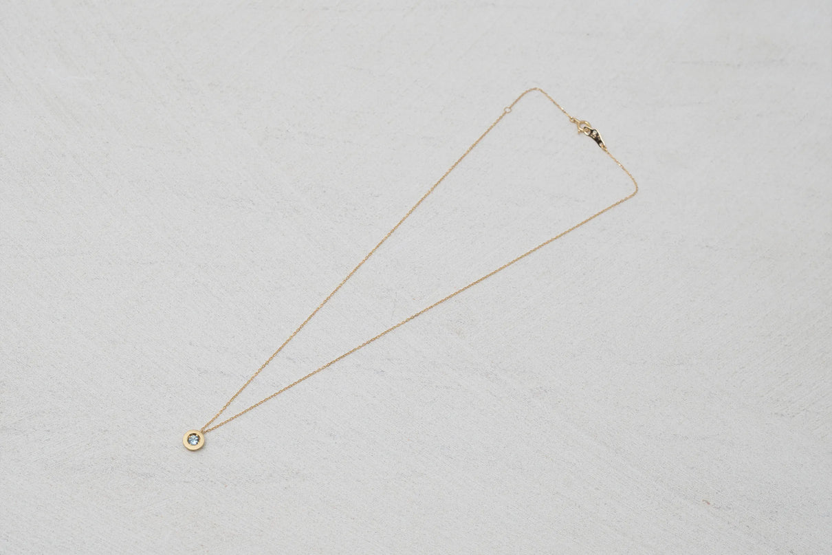 鮮やかな水色を呈するアクアマリンを上下左右の4点で留めたネックレス。" Enfold "=「包み込む」を意味する名の通り、アクアマリンがK18イエローゴールドのフレームを纏うようにあしらい、トップの裏は荒く削りだしたような面が織りなすラフカットのテクスチャーを施しました。瑞々しく輝くアクアマリンが揺れるたびに首元で華やかな煌めきを放ちます。3月の誕生石としても親しまれているアクアマリン。3月生まれの方の特別なお守りとしてもお勧めです。