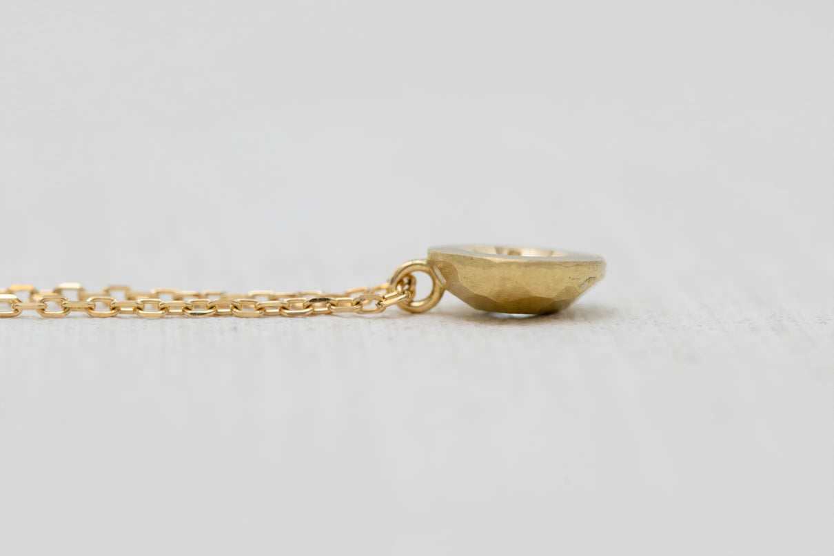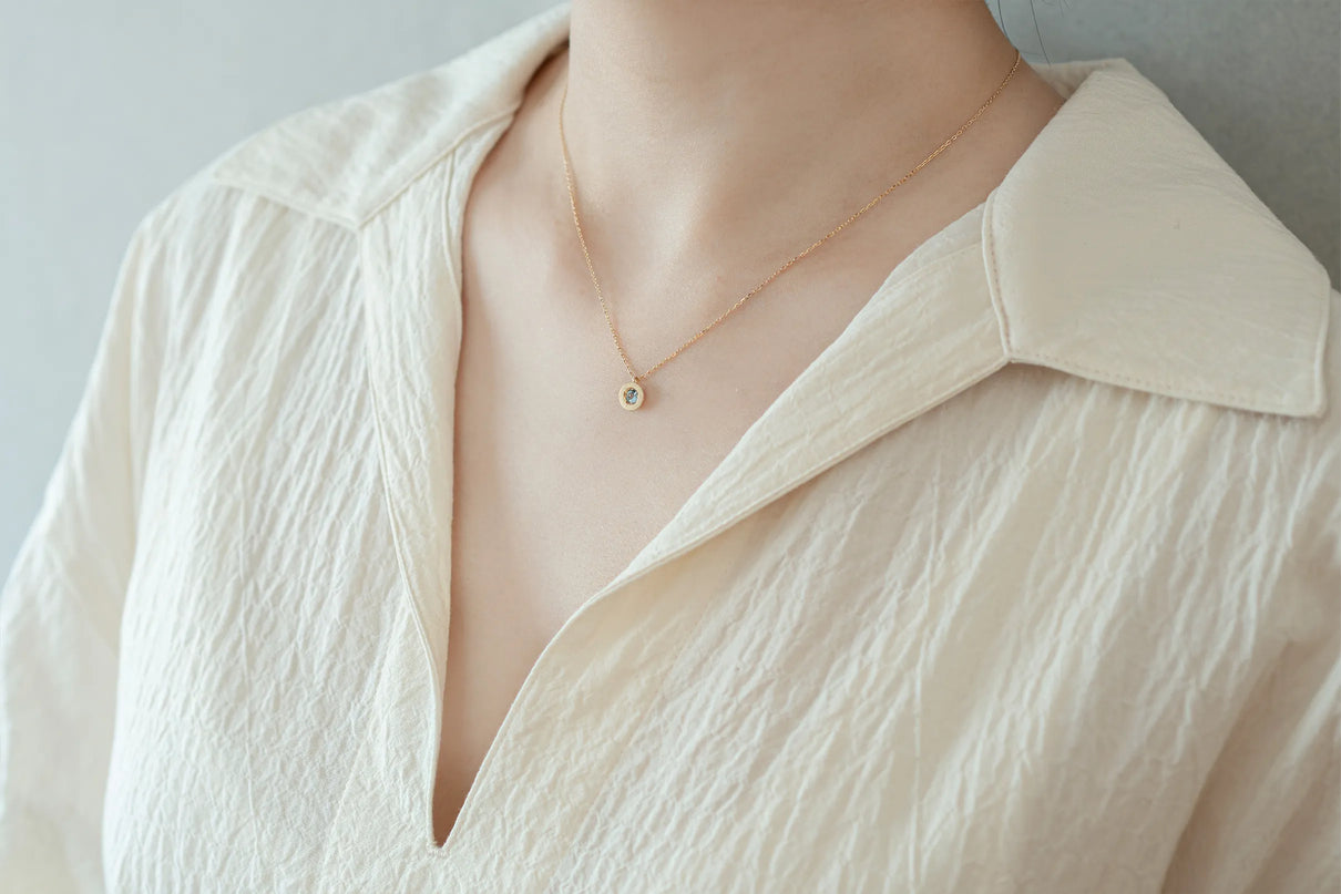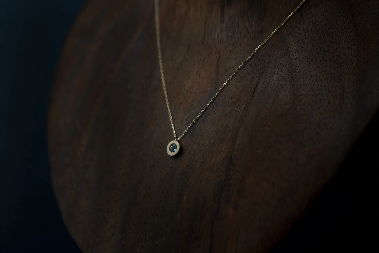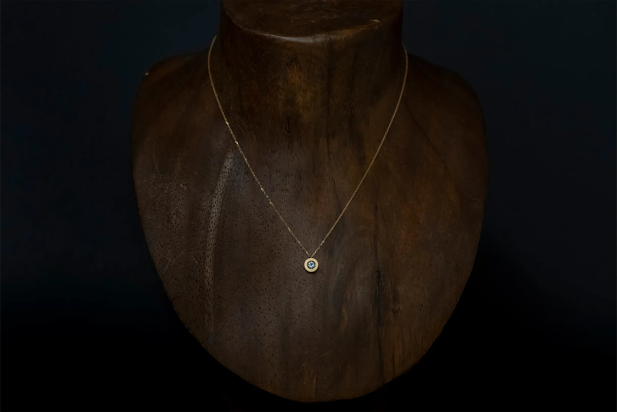 鮮やかな水色を呈するアクアマリンを上下左右の4点で留めたネックレス。" Enfold "=「包み込む」を意味する名の通り、アクアマリンがK18イエローゴールドのフレームを纏うようにあしらい、トップの裏は荒く削りだしたような面が織りなすラフカットのテクスチャーを施しました。瑞々しく輝くアクアマリンが揺れるたびに首元で華やかな煌めきを放ちます。3月の誕生石としても親しまれているアクアマリン。3月生まれの方の特別なお守りとしてもお勧めです。