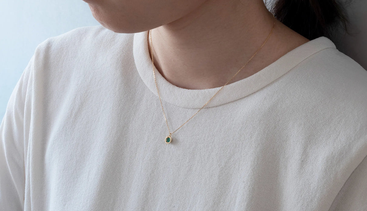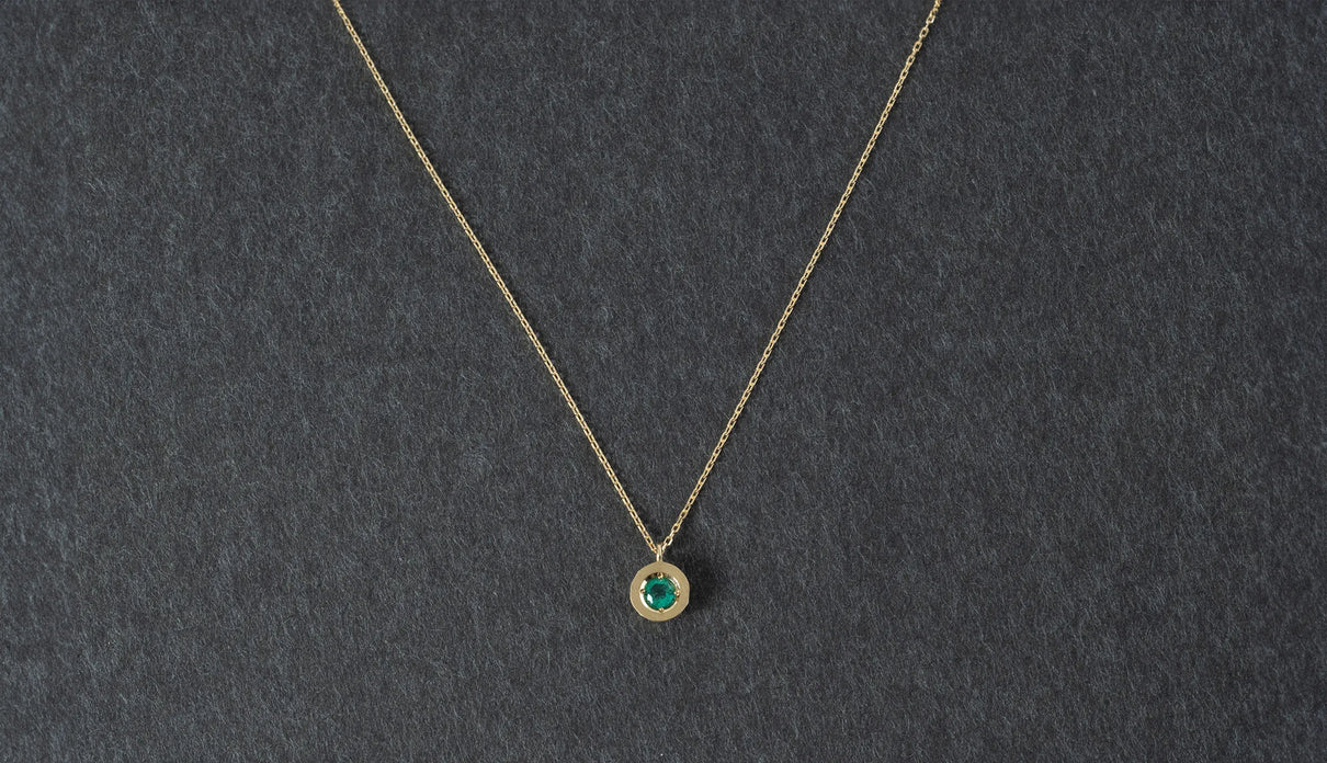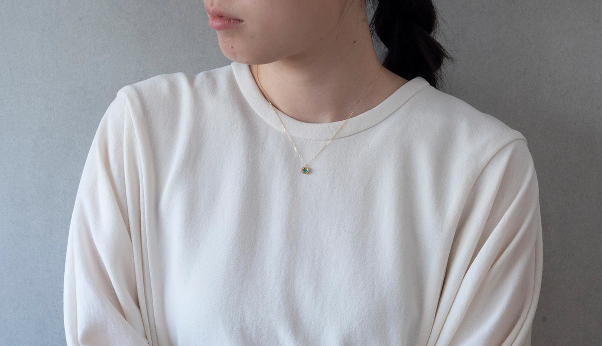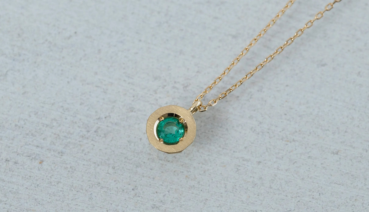 高い透明度を誇る色鮮やかなグリーンを呈するエメラルドを上下左右の4点で留めたネックレス。" Enfold " =「包み込む」を意味する名の通り、エメラルドがK18イエローゴールドのフレームを纏うようにあしらい、トップの裏は荒く削りだしたような面が織りなすラフカットのテクスチャーを施しました。瑞々しく輝くエメラルドが揺れるたびに首元で華やかな煌めきを放ちます。5月の誕生石エメラルドは、5月生まれの方の特別なお守りとして贈りものにも最適なアイテムです。