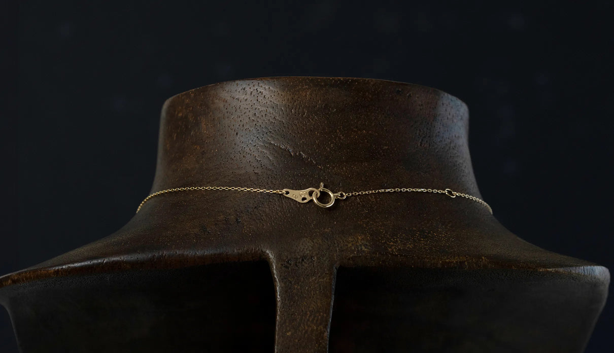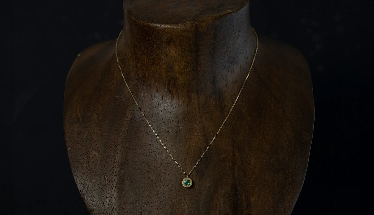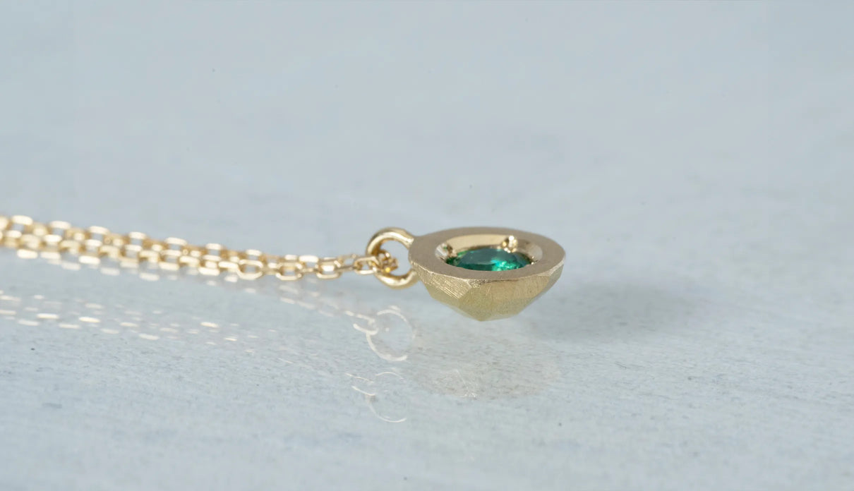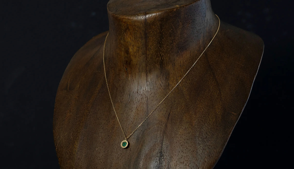 高い透明度を誇る色鮮やかなグリーンを呈するエメラルドを上下左右の4点で留めたネックレス。" Enfold " =「包み込む」を意味する名の通り、エメラルドがK18イエローゴールドのフレームを纏うようにあしらい、トップの裏は荒く削りだしたような面が織りなすラフカットのテクスチャーを施しました。瑞々しく輝くエメラルドが揺れるたびに首元で華やかな煌めきを放ちます。5月の誕生石エメラルドは、5月生まれの方の特別なお守りとして贈りものにも最適なアイテムです。