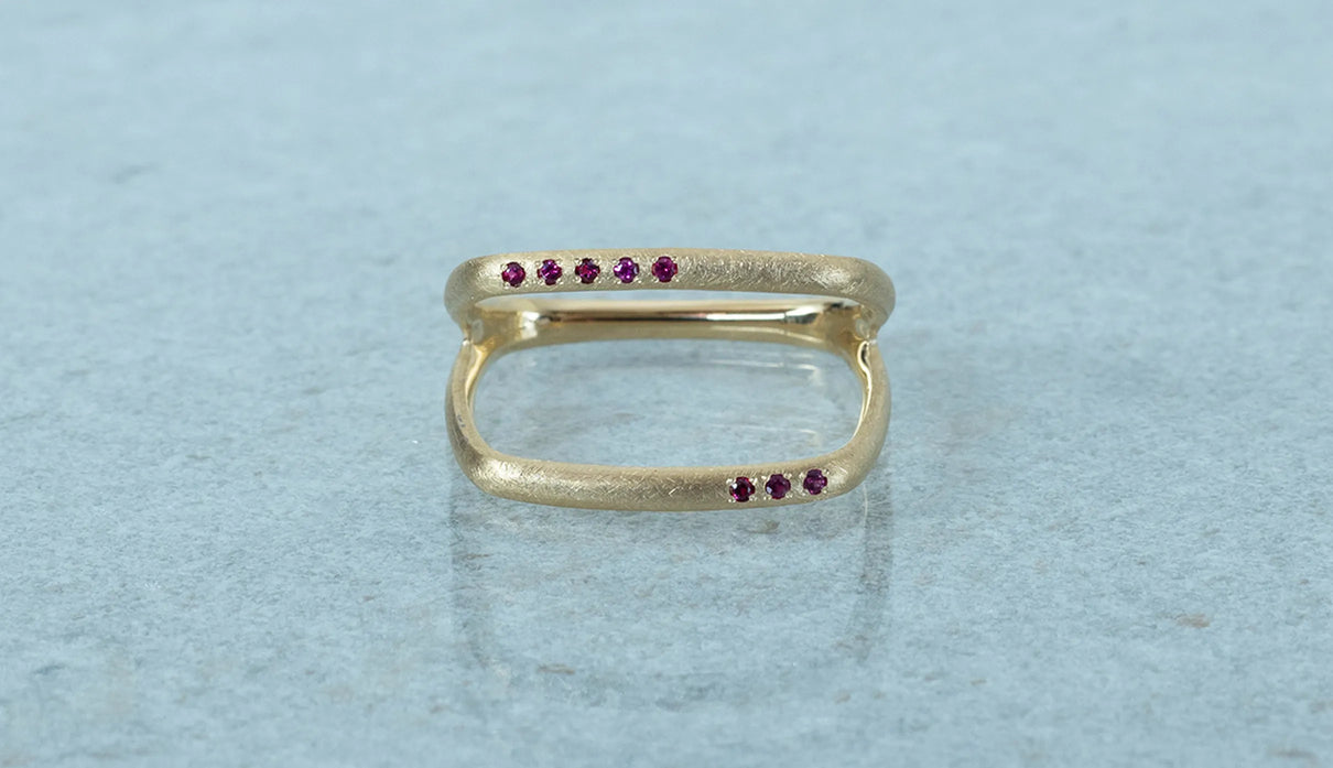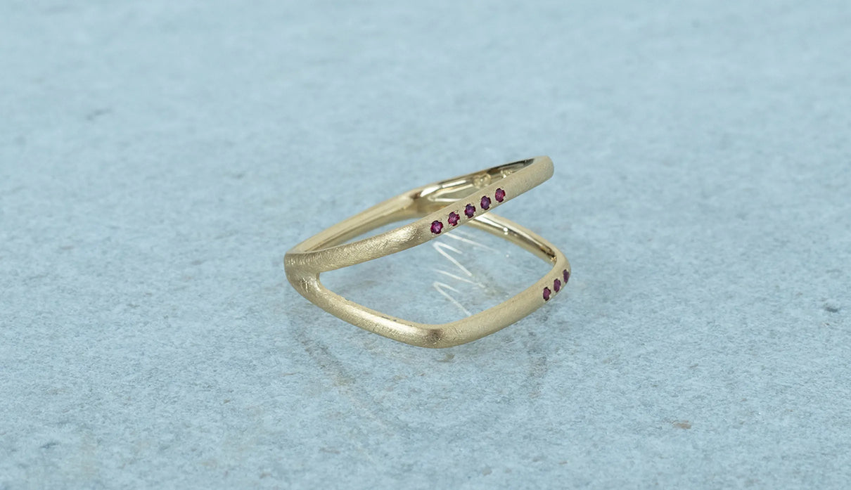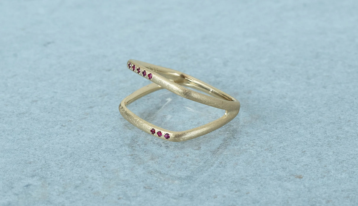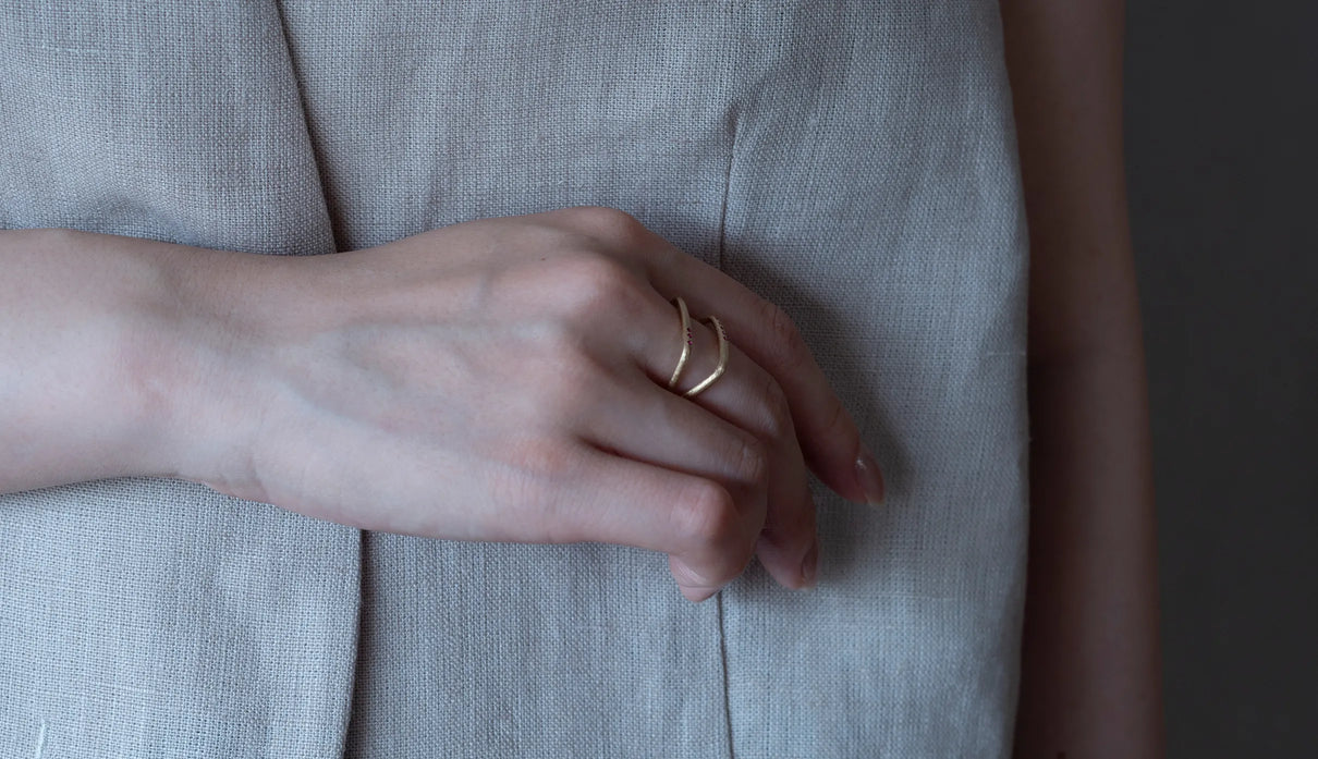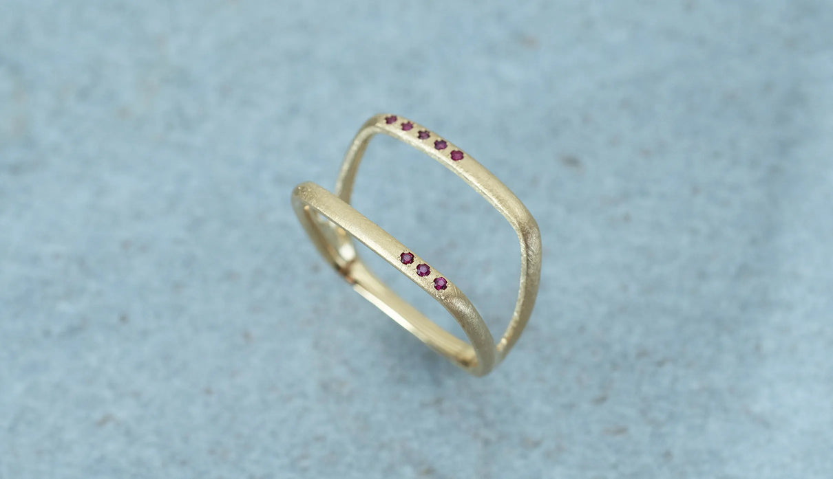 Syami ringのフォルムを生かし、軽やかなダブルアームに仕立てたリング。新たにルビーをお留めしたデザインができました。身に着けると2本のリングを纏っているような空間が生まれる、建築的な構造が魅力です。表面はマットテクスチャーを施した柔らかな仕上げで、トップにはアシンメトリーに留めた8石のメレダイヤモンドが繊細に煌めき個性を放ちます。四角いフォルムのリングは回りにくく、また光沢仕上げをした内側は指に沿うよう緩やかなカーブを描いており、そのなめらかなフィット感は身に着けるのが楽しみになるほど。日常を飾るジュエリーとして日々の装いにそっと寄り添います。7月の誕生石としても親しまれているルビーは、7月生まれの方の特別なお守りとして贈りものにも最適なアイテムです。