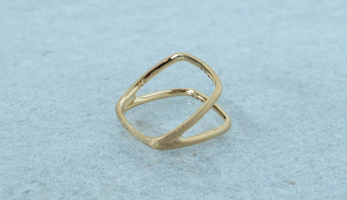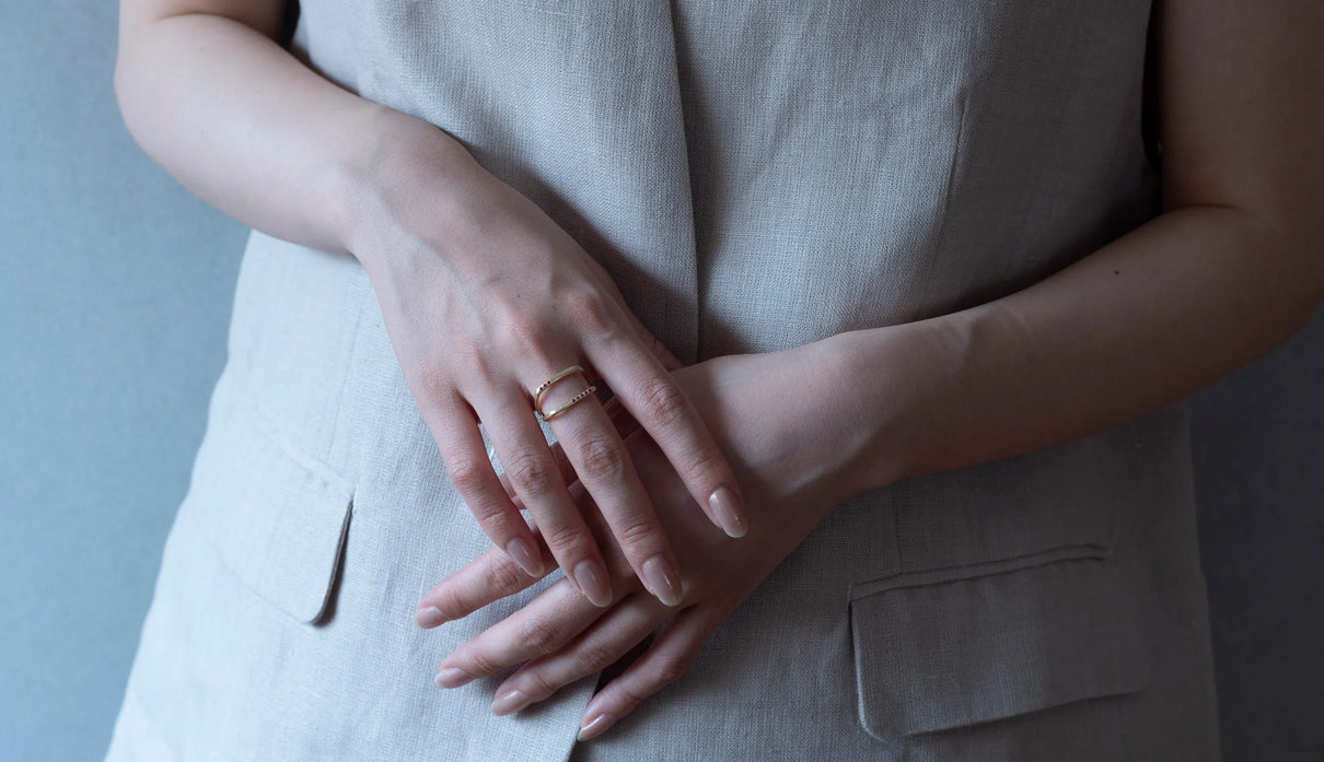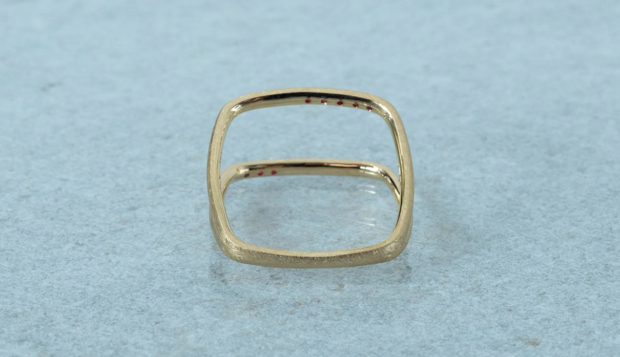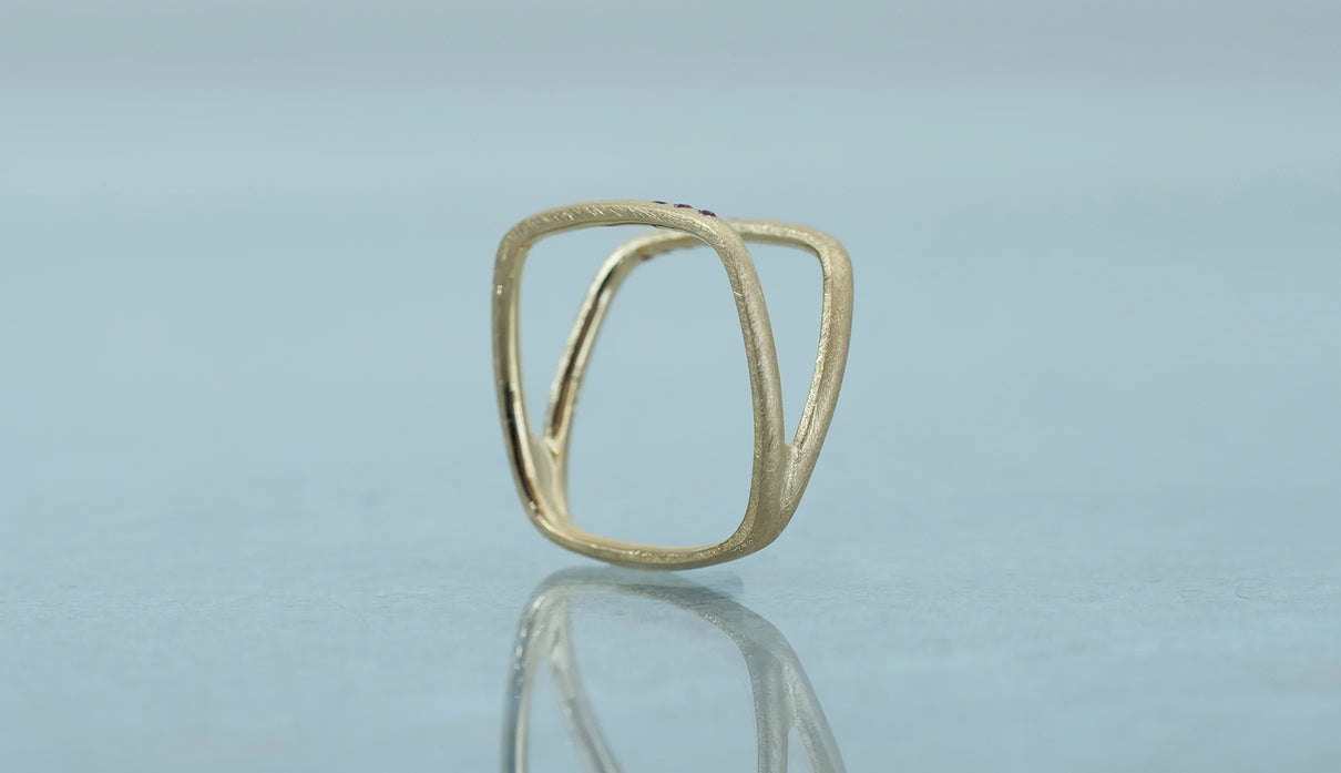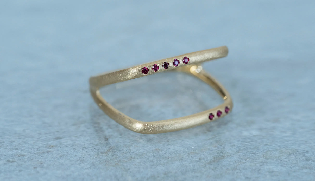 Syami ringのフォルムを生かし、軽やかなダブルアームに仕立てたリング。新たにルビーをお留めしたデザインができました。身に着けると2本のリングを纏っているような空間が生まれる、建築的な構造が魅力です。表面はマットテクスチャーを施した柔らかな仕上げで、トップにはアシンメトリーに留めた8石のメレダイヤモンドが繊細に煌めき個性を放ちます。四角いフォルムのリングは回りにくく、また光沢仕上げをした内側は指に沿うよう緩やかなカーブを描いており、そのなめらかなフィット感は身に着けるのが楽しみになるほど。日常を飾るジュエリーとして日々の装いにそっと寄り添います。7月の誕生石としても親しまれているルビーは、7月生まれの方の特別なお守りとして贈りものにも最適なアイテムです。