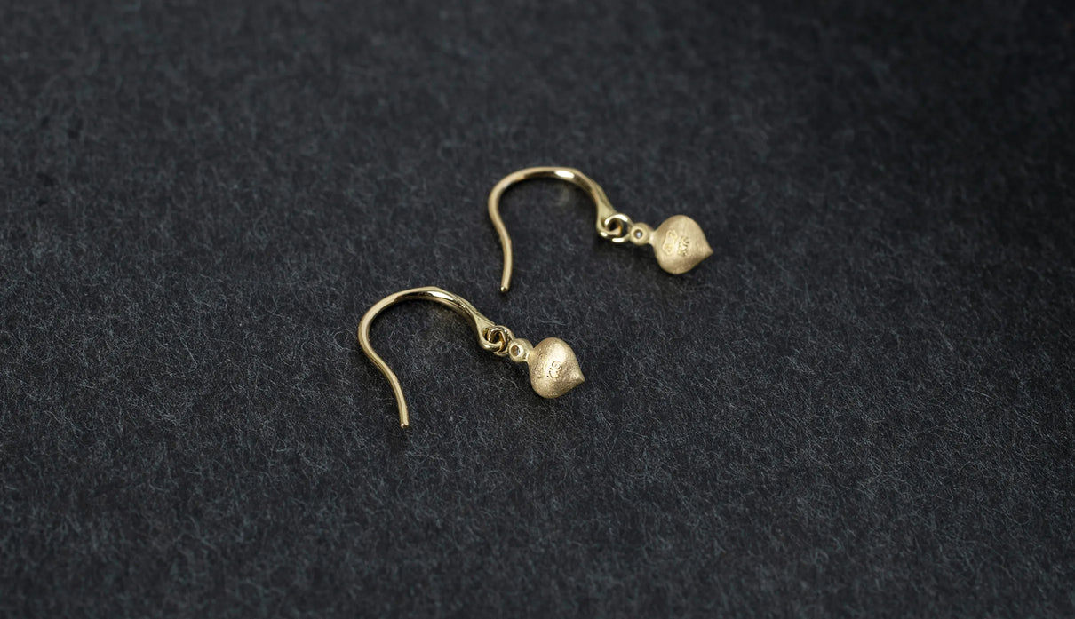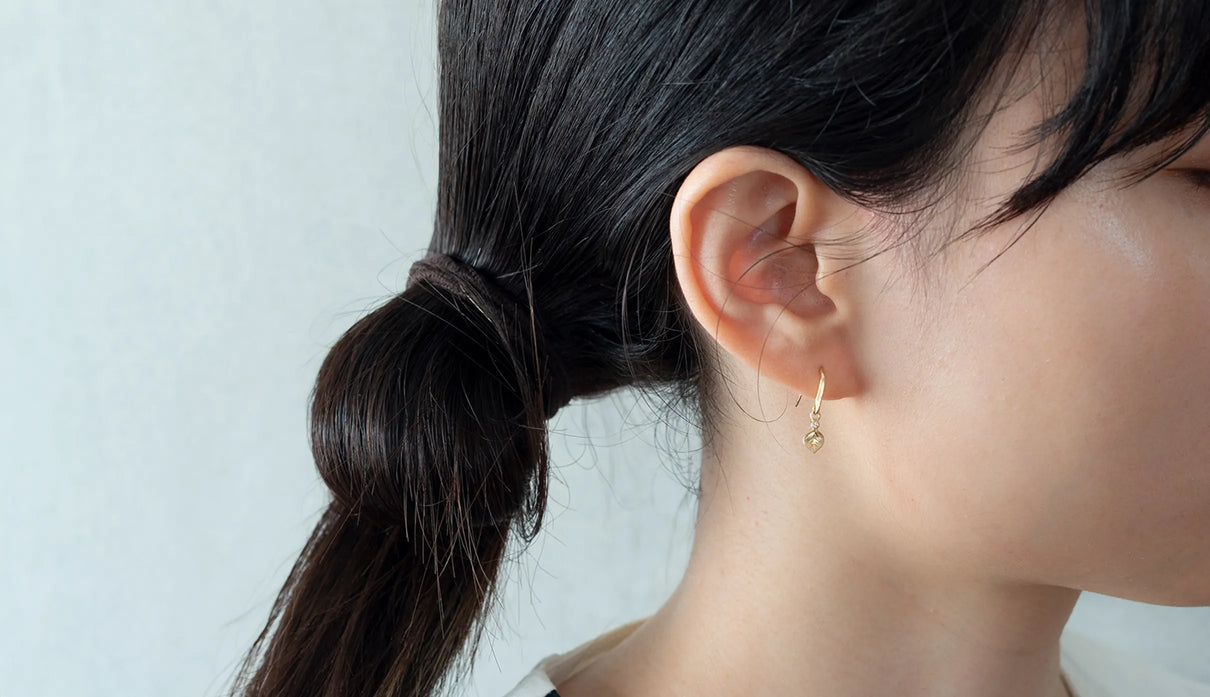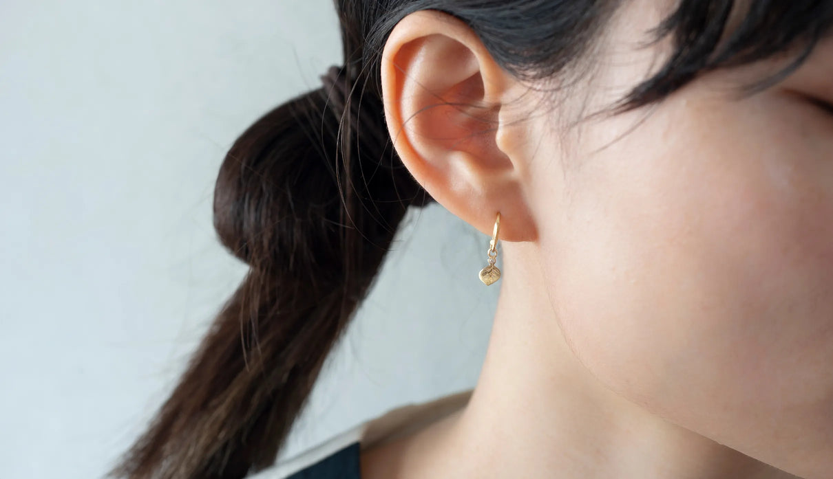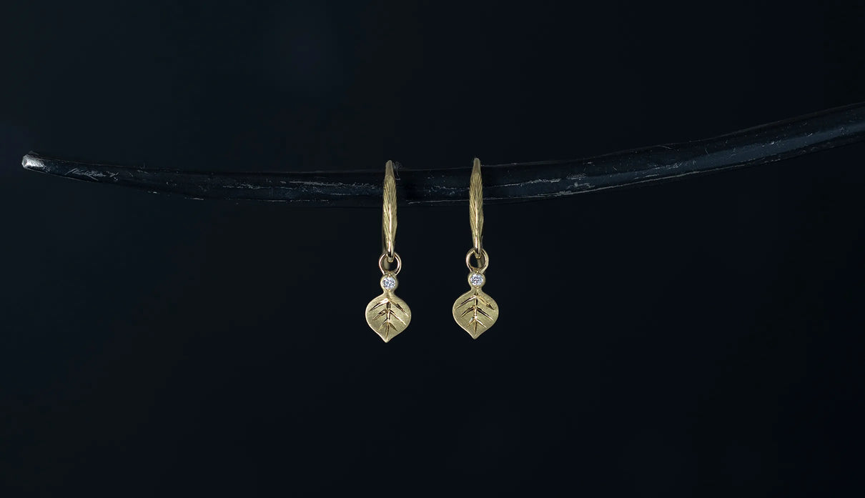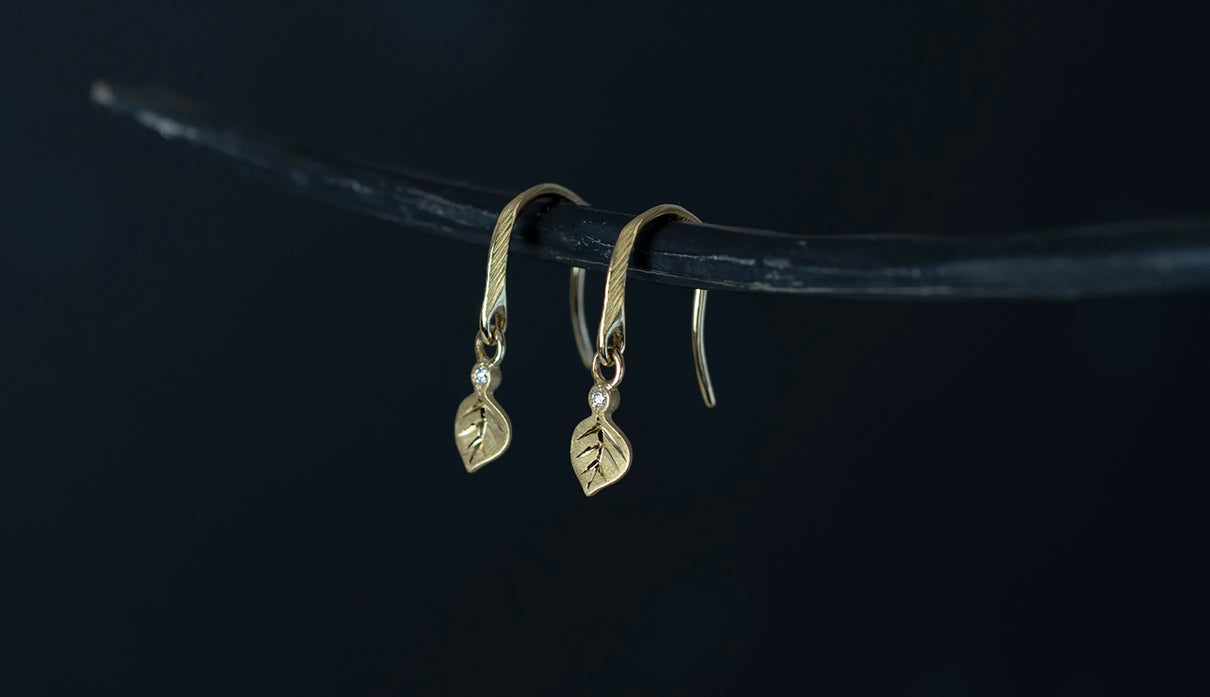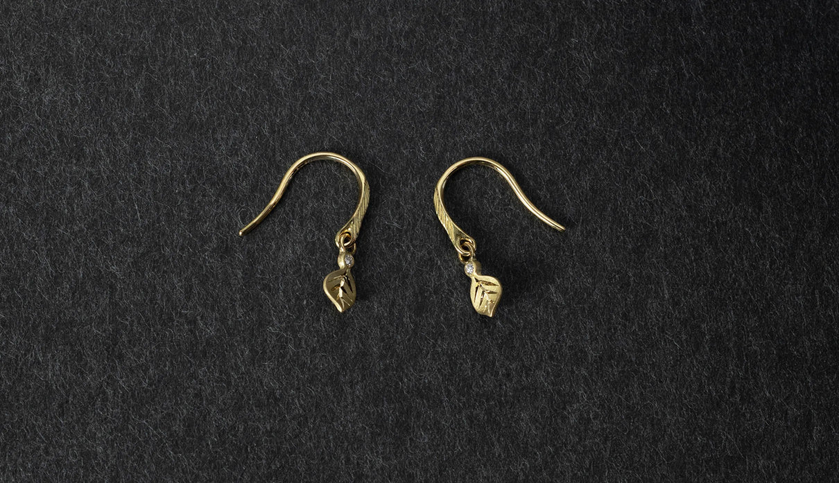 小さな葉をかたどったゴールドモチーフに、澄んだ輝きを宿すメレダイヤモンドを添えたピアス。動きに合わせて軽やかに揺れるダイヤモンドが光を受け、耳元に繊細なきらめきをもたらします。フック部分には葉脈を思わせる細やかな模様を刻み、わずかな中にも職人の手仕事が息づいています。日常の装いに自然に溶け込みながら、そっと彩りを添える小さな存在です。