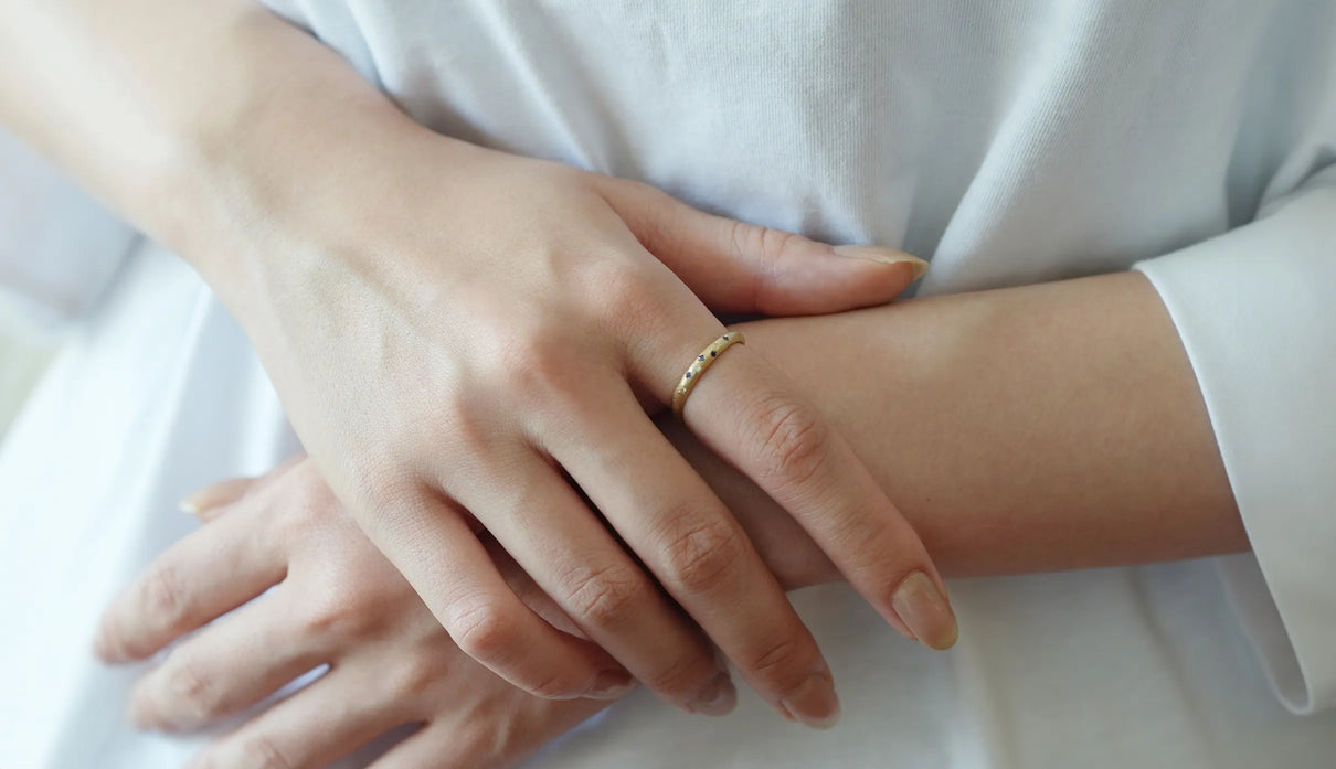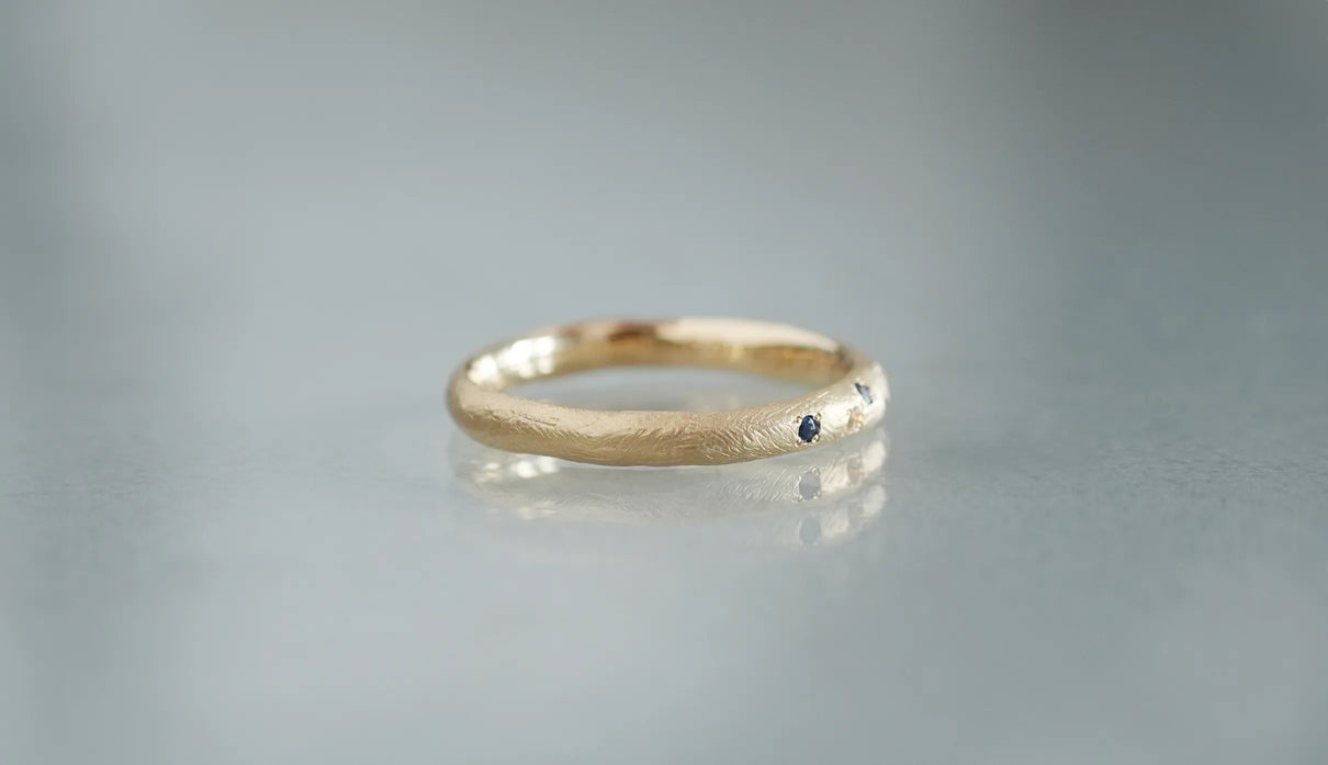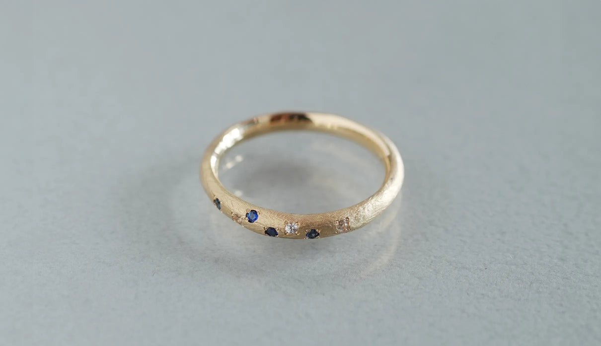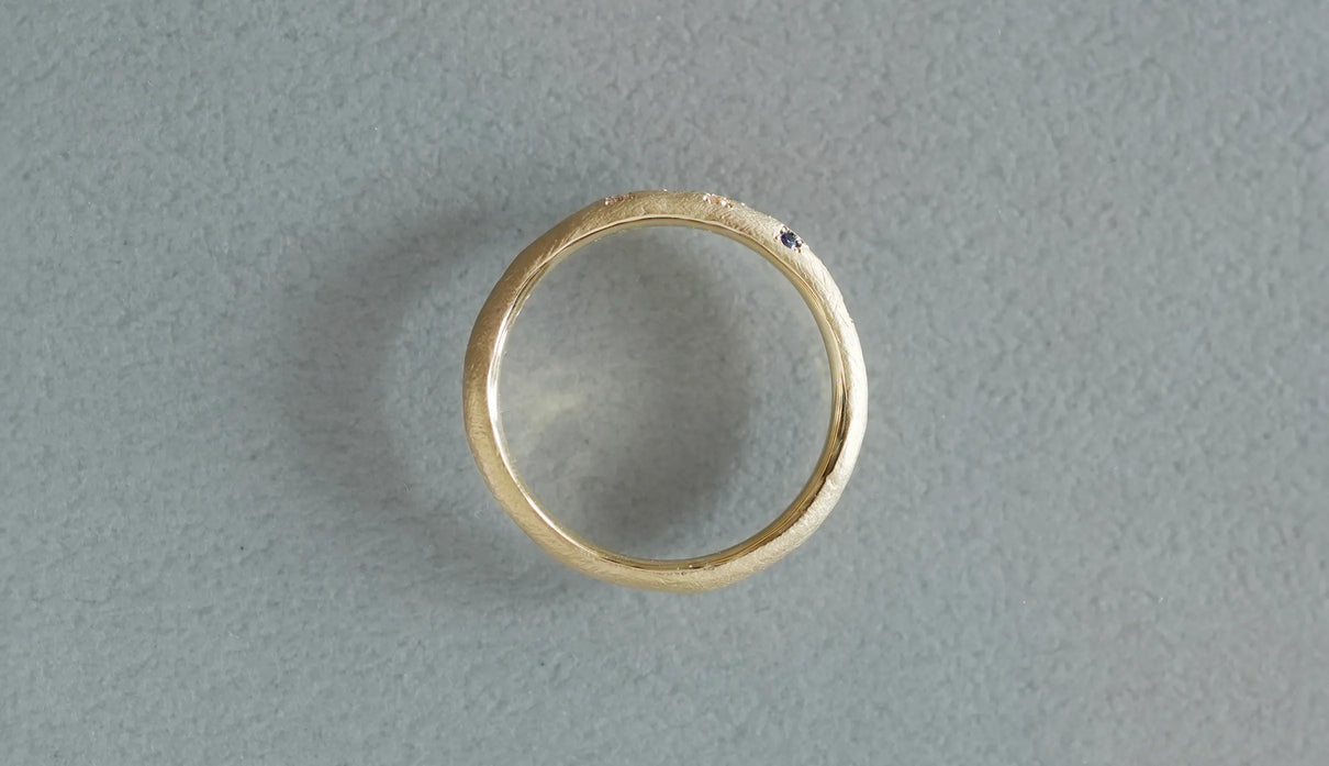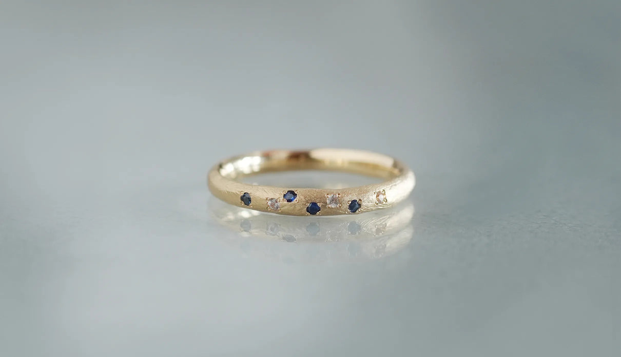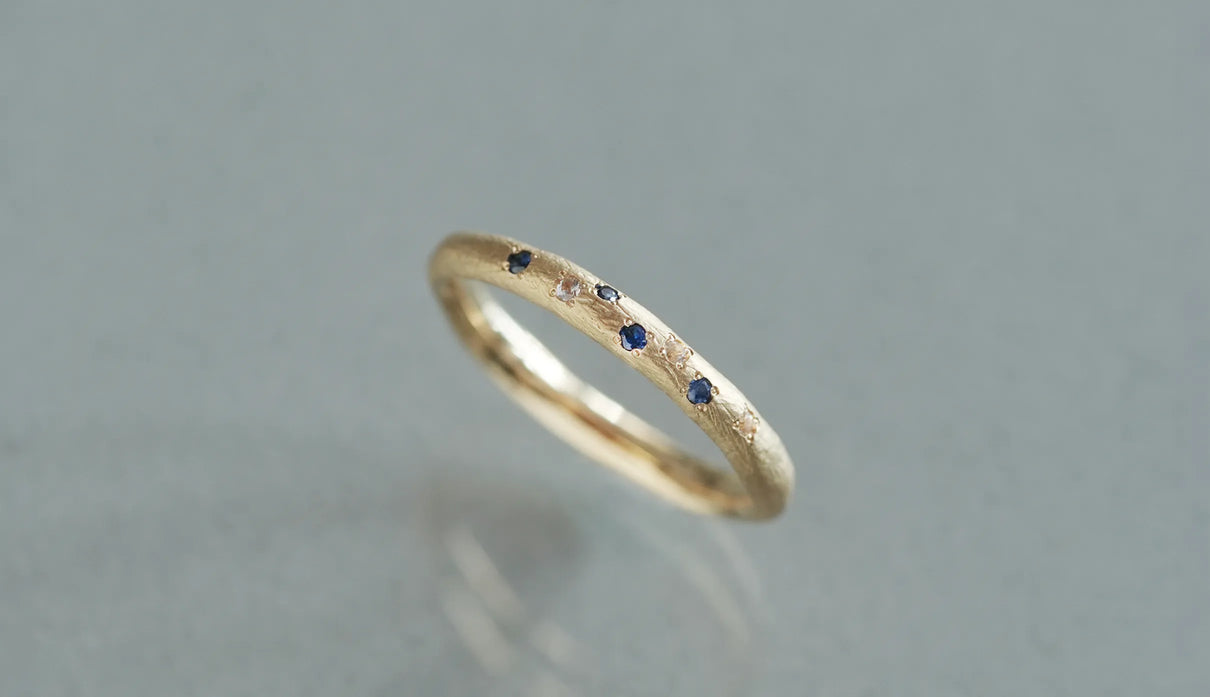 存在、生活、暮らしといった意味の名を持つ " Existence " のデザインに、4石のブルーサファイアと3石のホワイトサファイアをランダムに留めたリング。華やかできらびやかな美しさと対をなすように存在す、 素朴で慎ましく、堅実なものの中に感じる美しさ。丸みのあるリングをベースにしたマットで緩やかな凹凸に、手仕事の風合いが生きる仕上がりです。鮮やかなブルーと、やわらかなホワイト、2色のサファイアがリングにリズミカルな奥行きと華を添えるデザイン。9月の誕生石としても親しまれているサファイアは、9月生まれの方の特別なお守りとして贈りものにも最適なアイテムです。