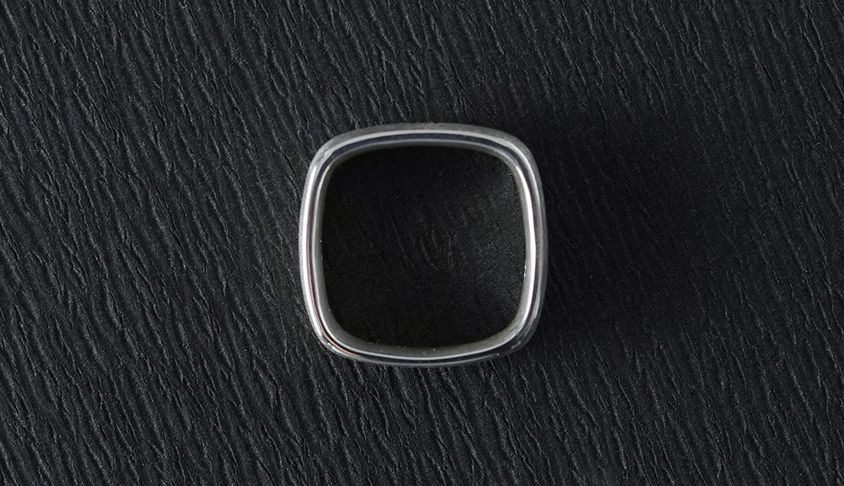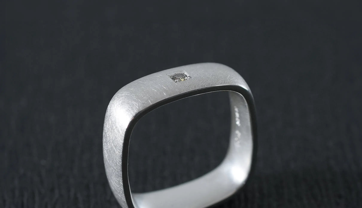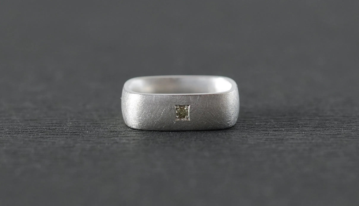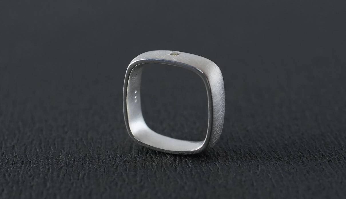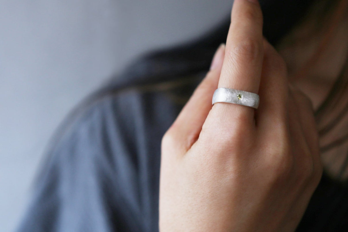 「三味線」の胴体の形から着想を得たSyamiシリーズ。古来より伝わる伝統楽器に潜む美しく柔らかな四角形が、実はまん丸ではない指の断面にフィットする最も自然なフォルムなのではと考えました。丸く滑らかに仕上げた内側はその厚みや角度にまでこだわり、四角い見た目からは想像がつかないほど気持ちの良い着け心地です。こちらは定番のSyami ringにオリーブカラーダイヤモンドを留めたリミテッドリング。プレーンなマットに仕上げたリングに落ち着いたオリーブカラーのダイヤモンドがさりげなく輝きます。内側は着け心地にこだわり、その滑らかなつけ心地は身に付けるのが楽しみになる程です。四角い形状からリングがクルクルと回らないのもおすすめのポイントです。
