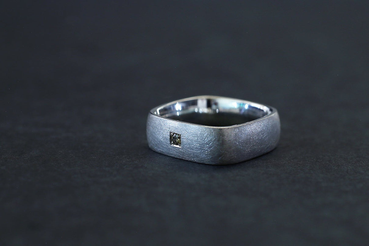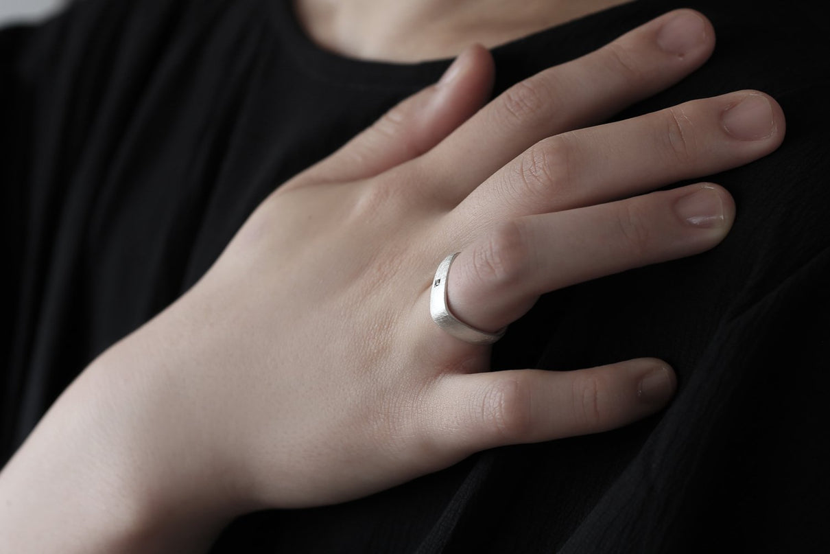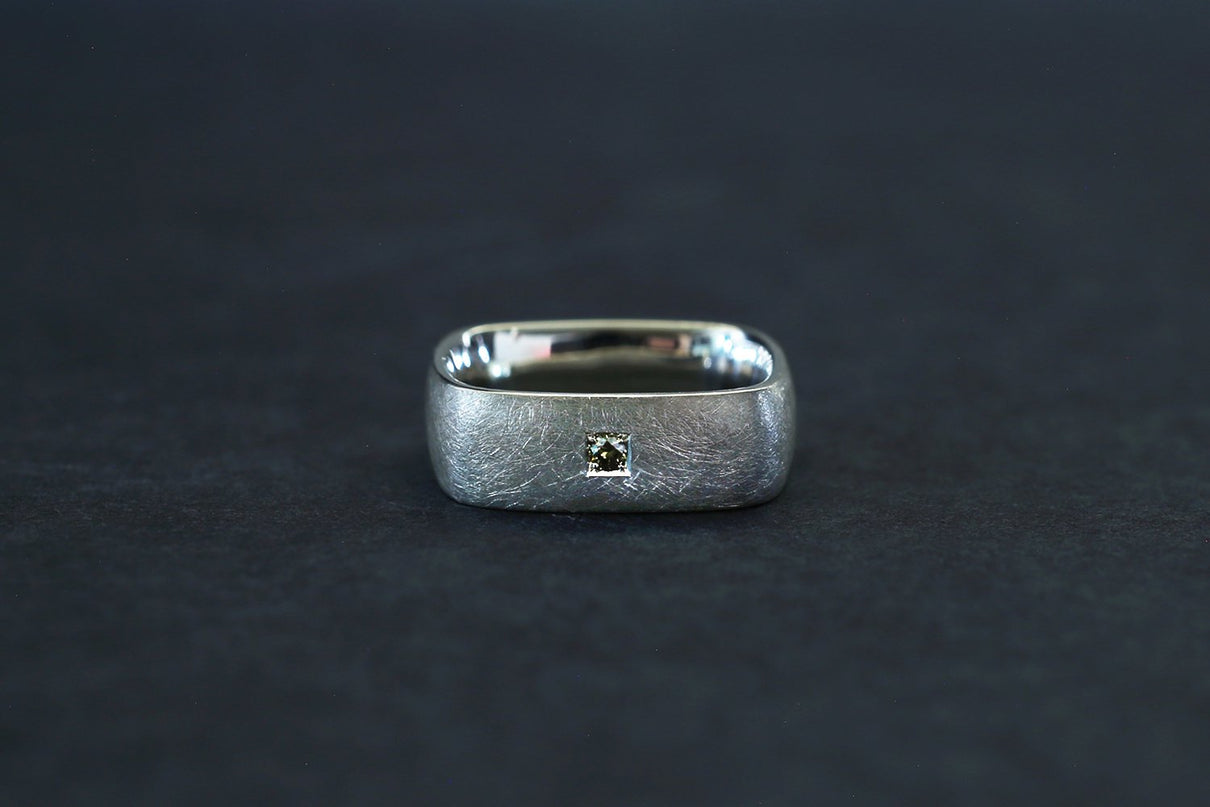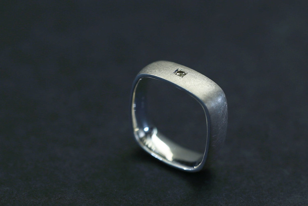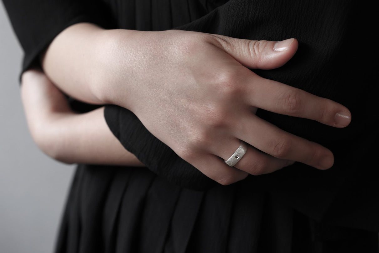 「三味線」の胴体の形から着想を得たSyamiシリーズ。古来より伝わる伝統楽器に潜む美しく柔らかな四角形が、実はまん丸ではない指の断面にフィットする最も自然なフォルムなのではと考えました。丸く滑らかに仕上げた内側はその厚みや角度にまでこだわり、四角い見た目からは想像がつかないほど気持ちの良い着け心地です。こちらは定番のSyami ringにライトブラウンダイヤモンドを留めたリミテッドリング。プレーンなマットに仕上げたリングに落ち着いたライトブラウンカラーのダイヤモンドがさりげなく輝きます。内側は着け心地にこだわり、その滑らかなつけ心地は身に付けるのが楽しみになる程です。四角い形状からリングがクルクルと回らないのもおすすめのポイントです。