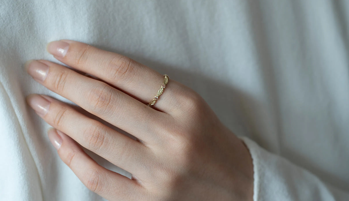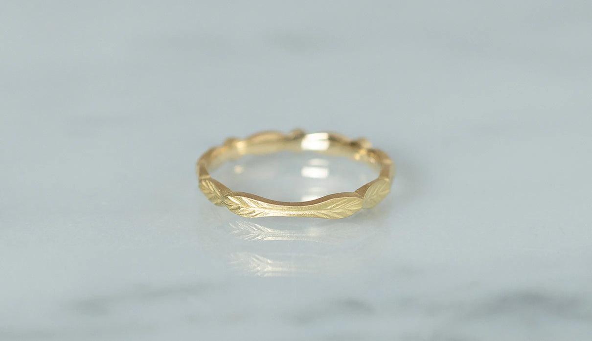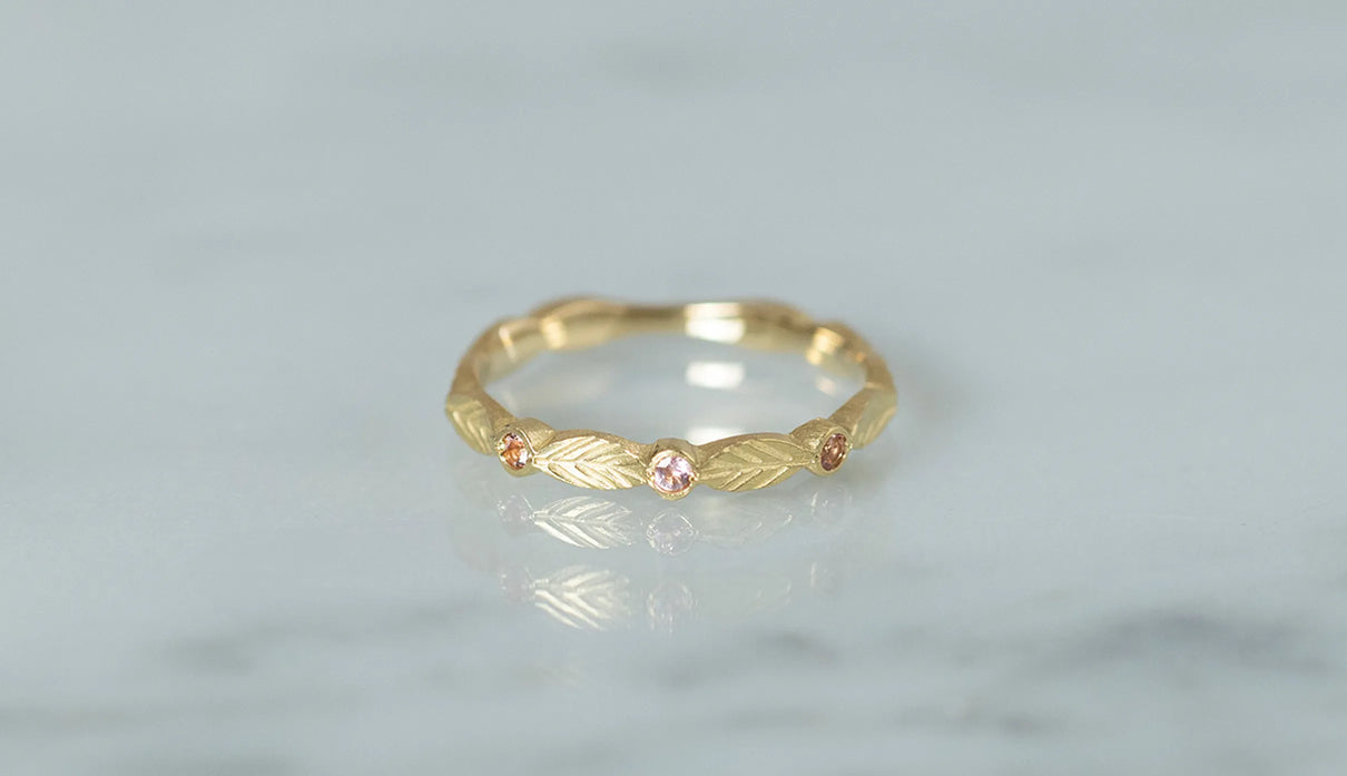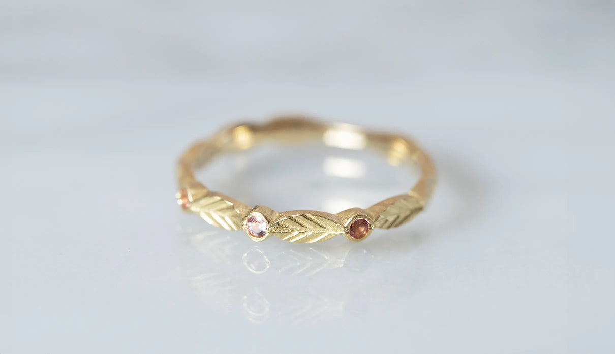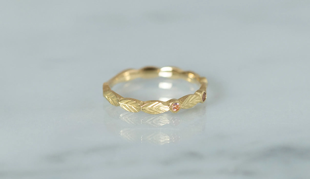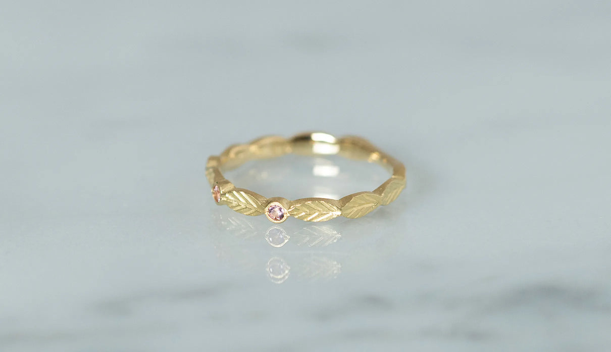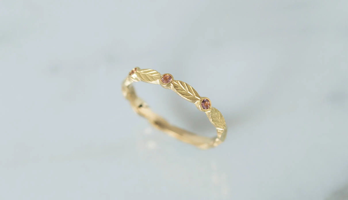 開花の季節を待つ小さな蕾をモチーフにしたリング。1枚1枚わずかに異なる表情の葉にはマットテクスチャーを施し、柔らかな印象に仕立てました。葉と葉の間には瑞々しい蕾に見立てた3石のピンクトルマリンが艶やかに輝きます。重ね付けもしやすい、繊細な印象のゴールドリングです。10月生まれの誕生石でもあるトルマリン。装いの主役として日常的に身に着けていただくのはもちろん、特別な贈りものにも最適なアイテムです。