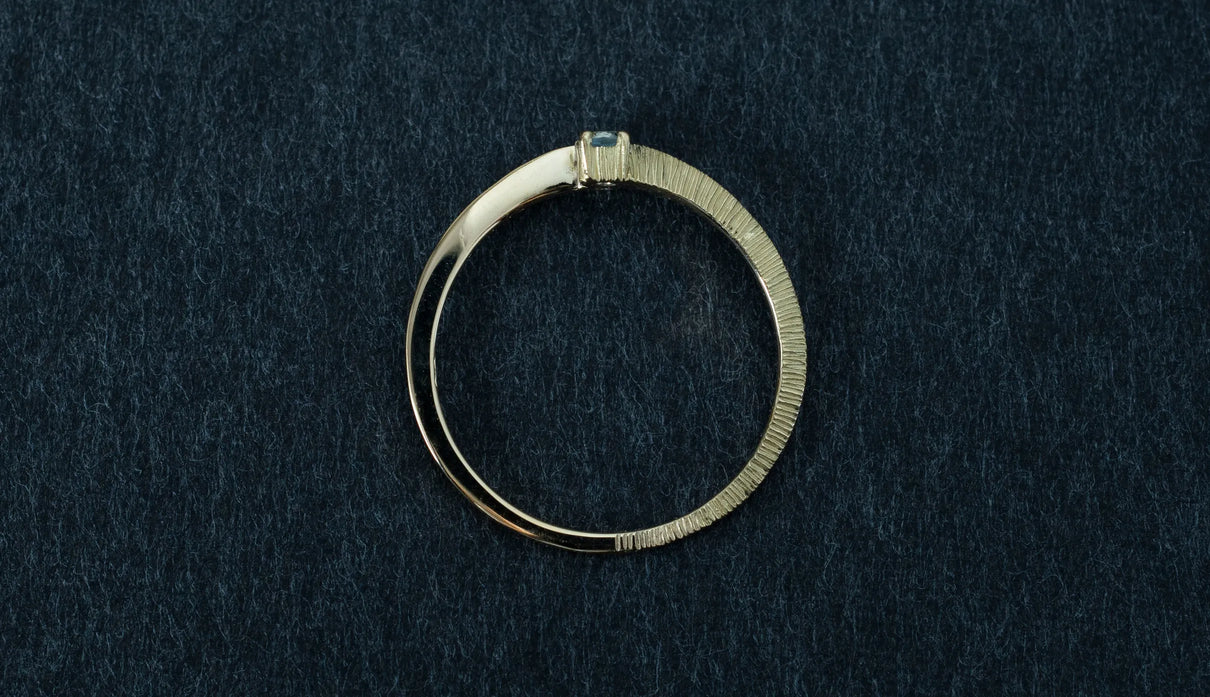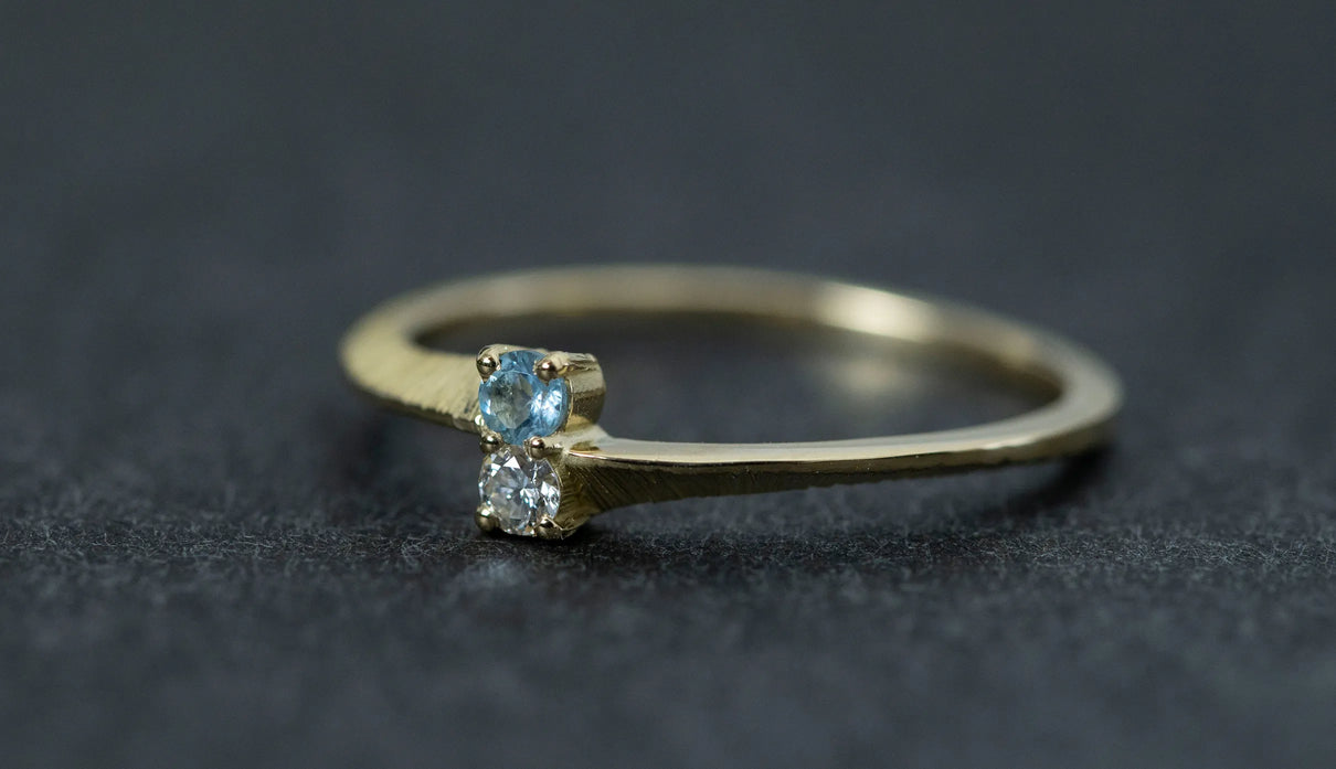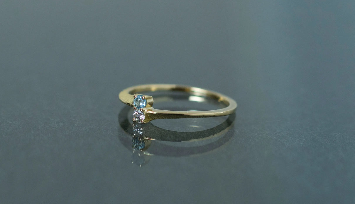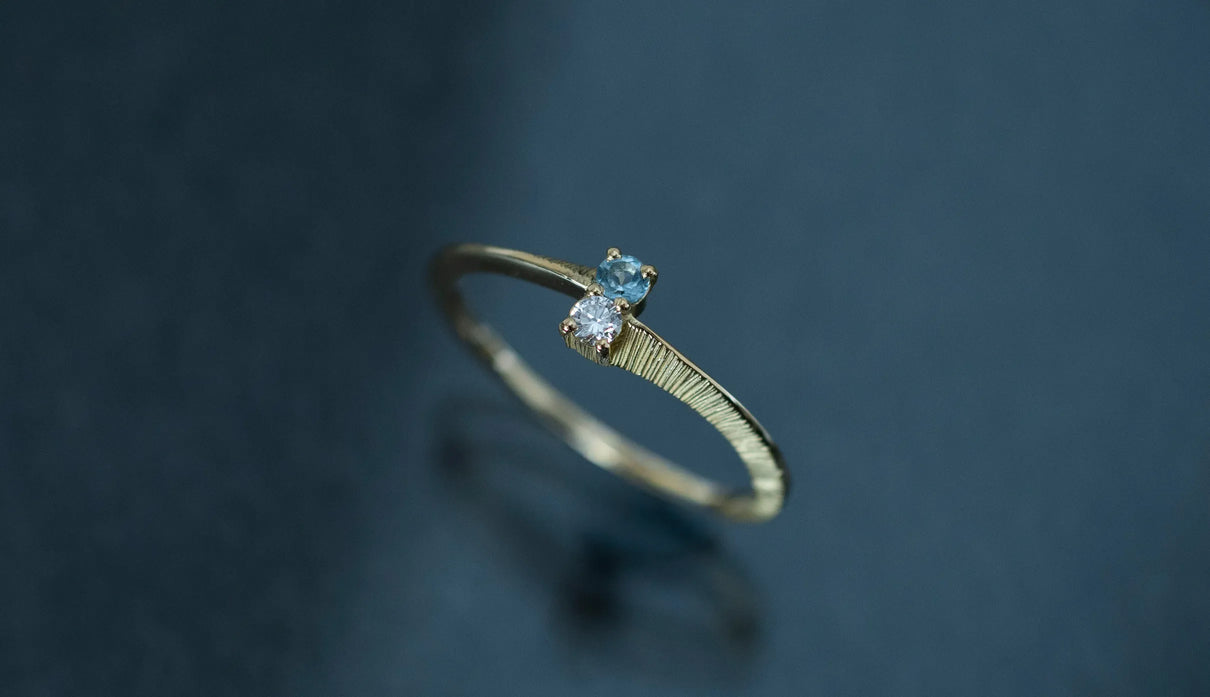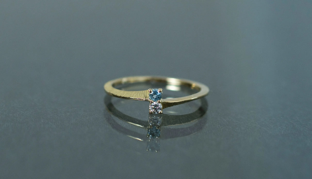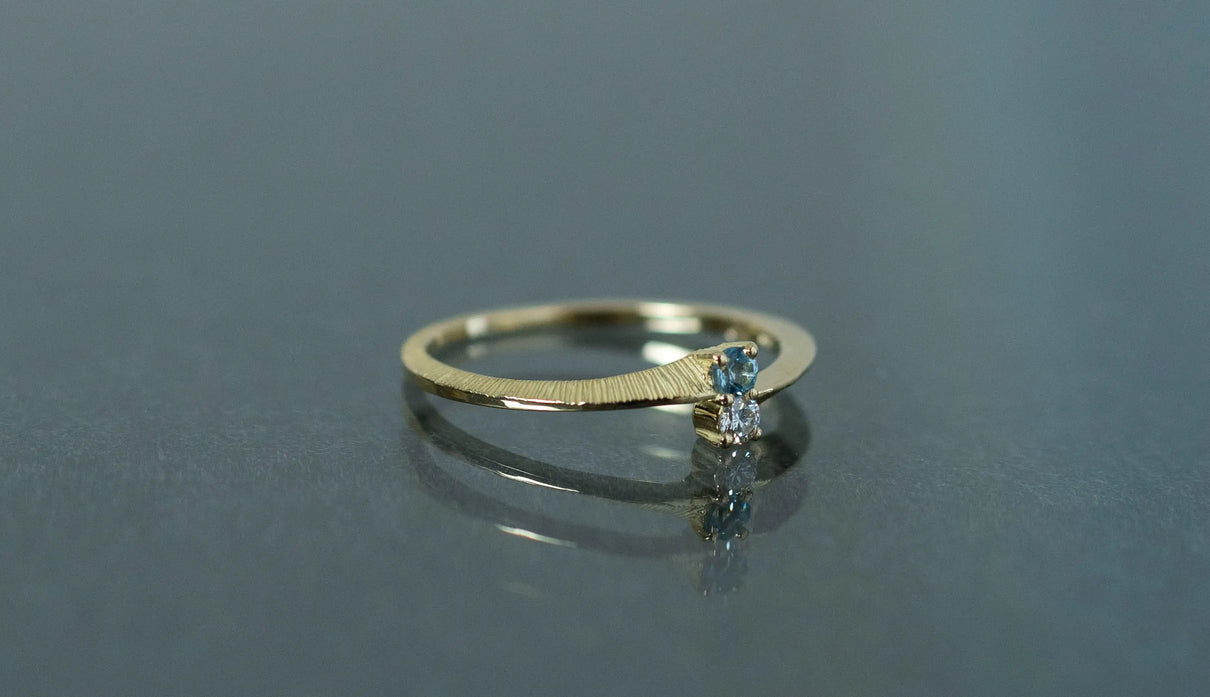 輝きが美しい上質なブルートパーズとダイヤモンドを留めたリング。異なる宝石が縦にふたつ並んだ上品な佇まいと、正面から見た時に極細の艶テクスチャーを施したK18ゴールドの極細線が華奢な雰囲気を醸します。無数の線で描く緻密な手彫り装飾面と、艶めく光沢面が半周ずつアシンメトリーになったリング側面のデザインと相まって角度によって様々な表情を見せてくれ、装いにひと匙の個性と凛とした雰囲気を添えてくれるアイテムです。11月の誕生石としても親しまれているトパーズは、11月生まれの方の特別なお守りとしてもお勧めです。