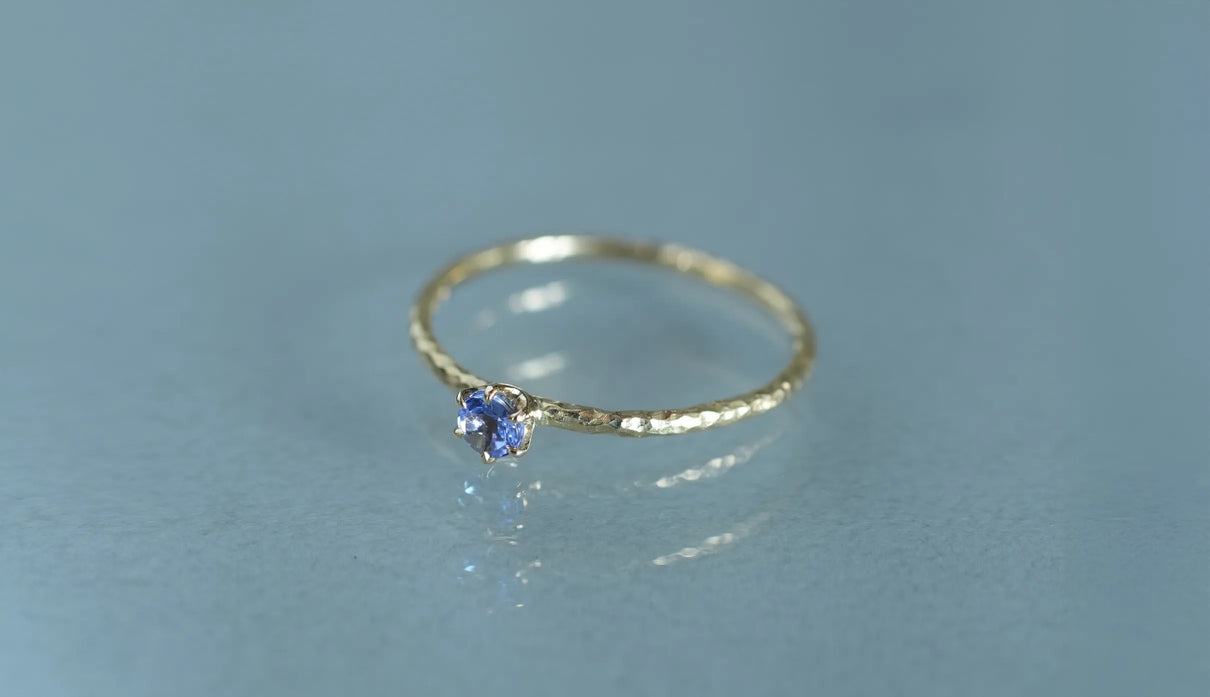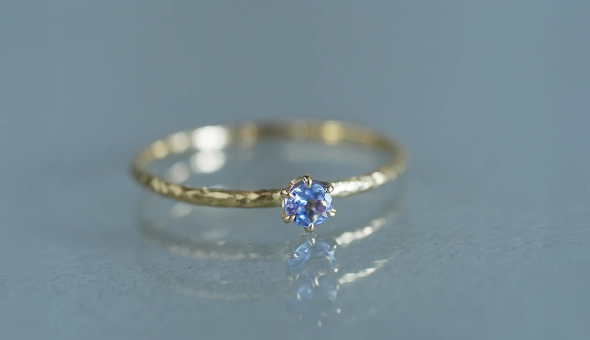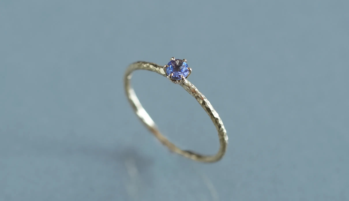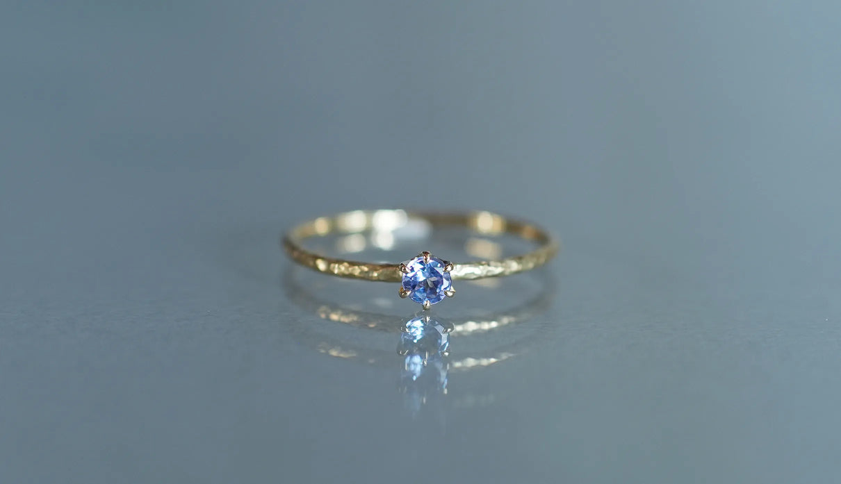 Twig(小枝)と名付けたリング。幅約1mmと華奢な印象の中にも樹の表皮の様な凸凹とした細かなテクスチャーが光り、その中央には深みのある神秘的な輝きを放つ小さなタンザナイトを留めました。ピンキーリングや重ね着けにもお勧めのリングです。12月の誕生石としても親しまれているタンザナイトは、12月生まれの方の特別なお守りとして贈りものにも最適なアイテムです。