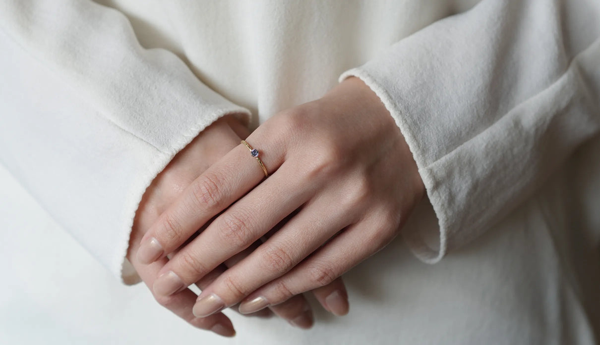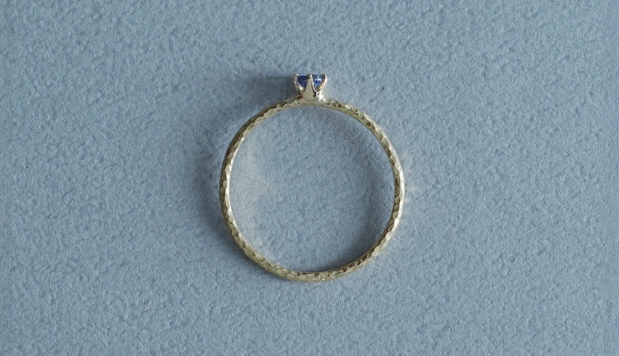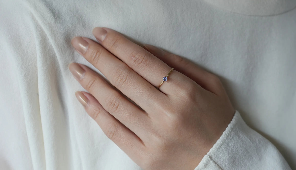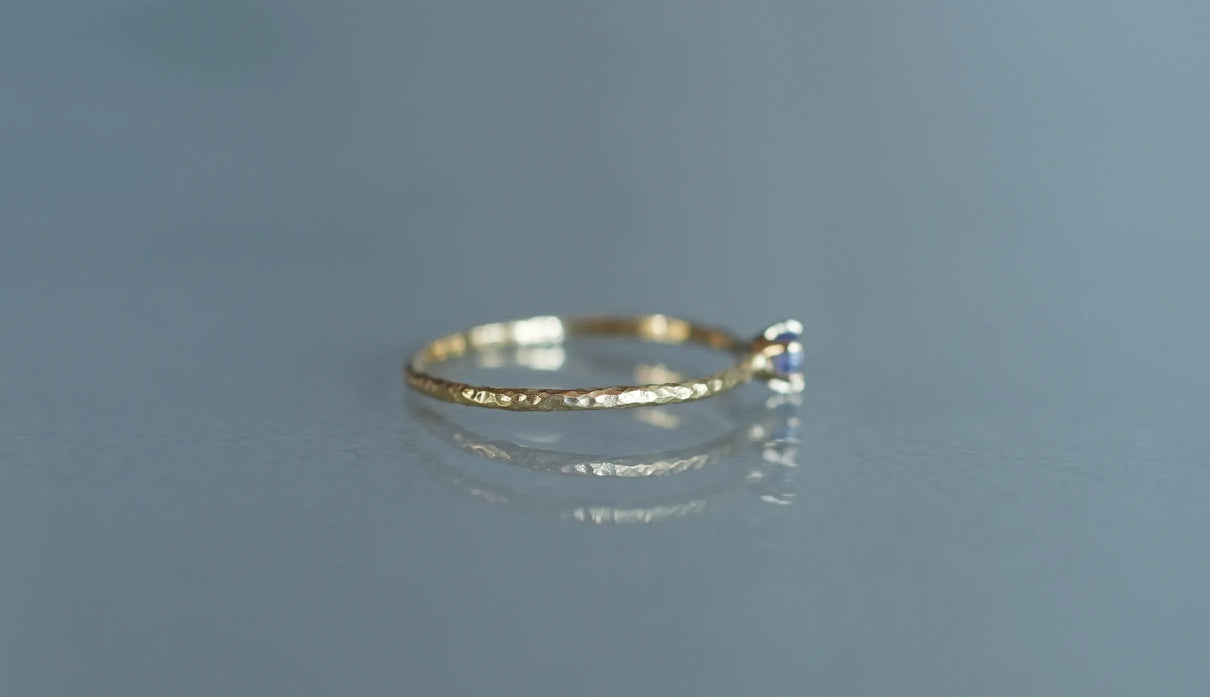 Twig(小枝)と名付けたリング。幅約1mmと華奢な印象の中にも樹の表皮の様な凸凹とした細かなテクスチャーが光り、その中央には深みのある神秘的な輝きを放つ小さなタンザナイトを留めました。ピンキーリングや重ね着けにもお勧めのリングです。12月の誕生石としても親しまれているタンザナイトは、12月生まれの方の特別なお守りとして贈りものにも最適なアイテムです。