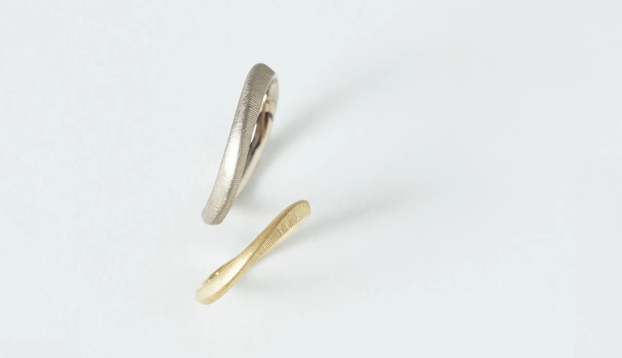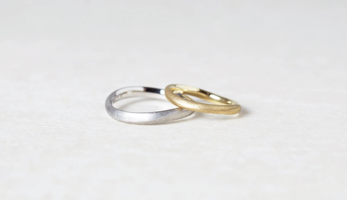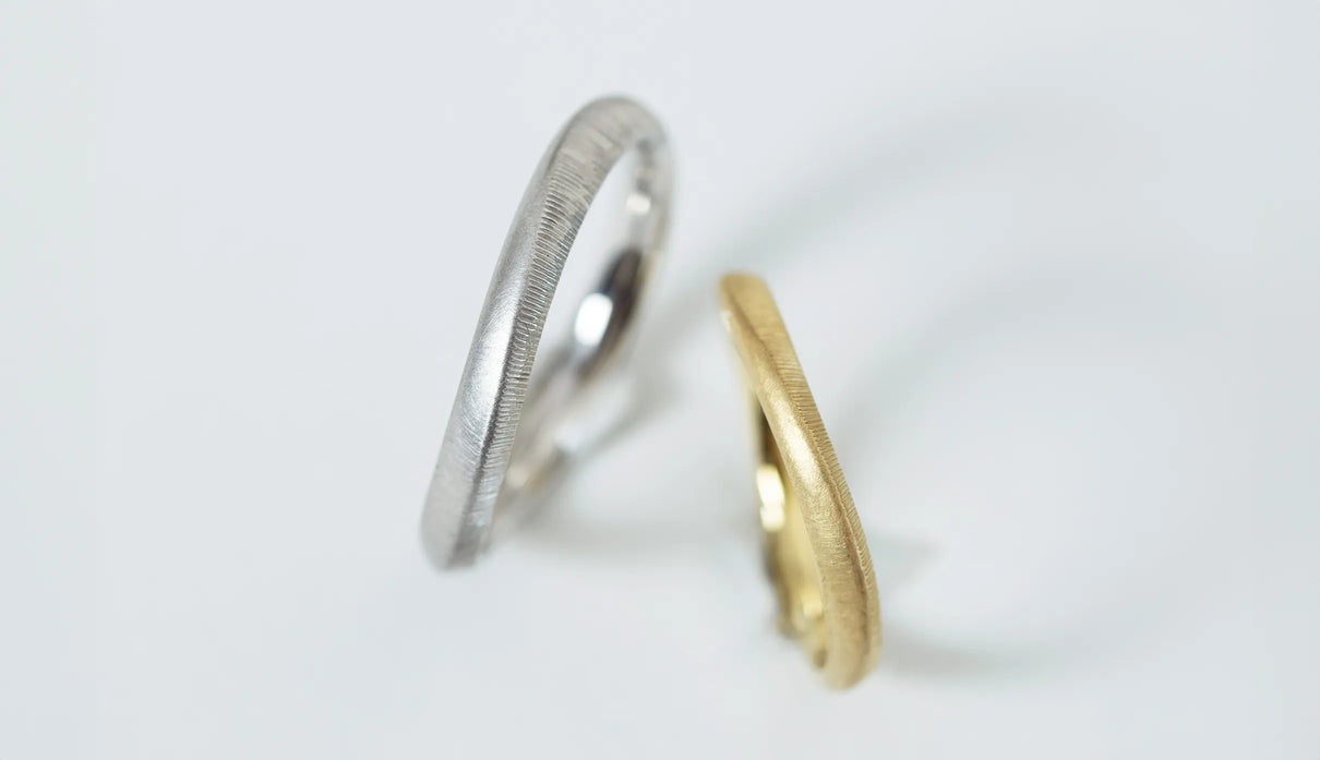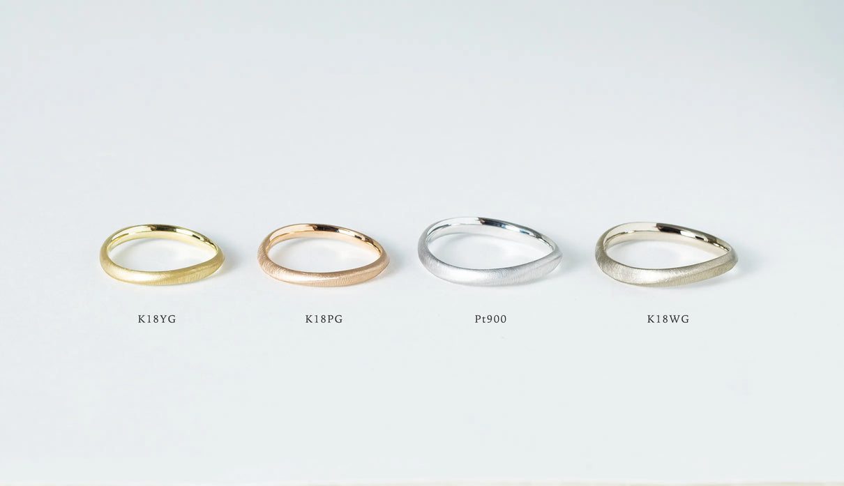 Currents ( カレンツ ) 穏やかにたゆたう海をモチーフに、水面のゆらぎを映したような柔らかな曲線で仕立てたマリッジリング(結婚指輪)。満ち引きが交わるはざまの瞬間を映すように、異なるふたつのテクスチャーをあしらいました。マットに仕上げた面と、手仕事による繊細な筋彫りの面が寄り添い、見る角度や光の加減によってさまざまな表情を見せます。異なる質感が響き合って生まれる陰影は、時にやわらかく、時に力強く、身に着ける人の静かな個性をそっと引き立てます。