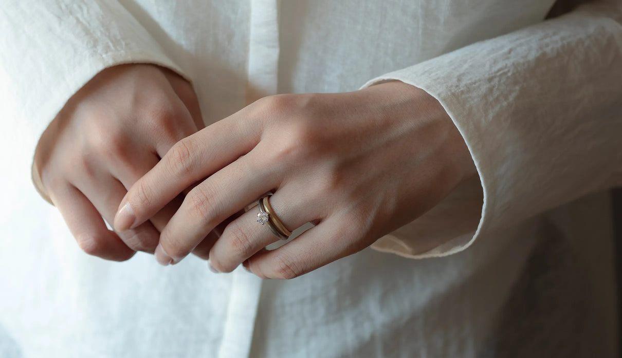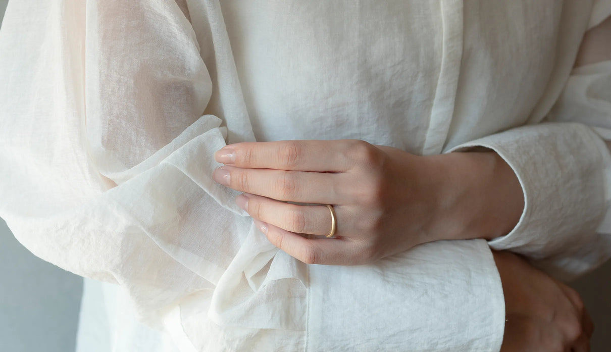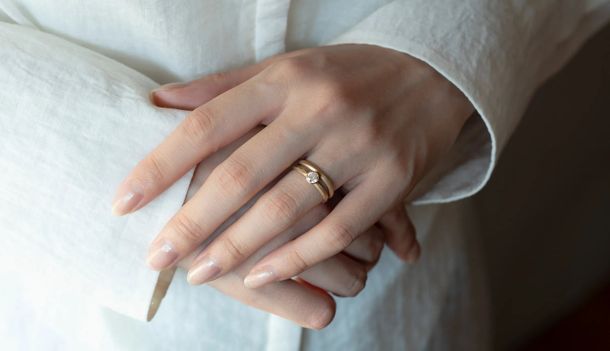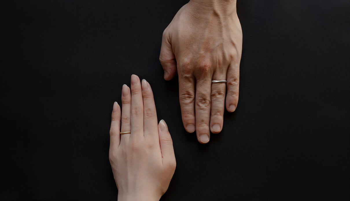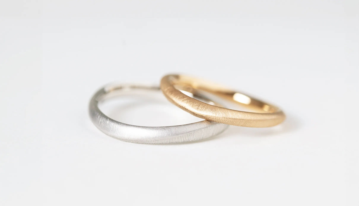 Currents ( カレンツ ) 穏やかにたゆたう海をモチーフに、水面のゆらぎを映したような柔らかな曲線で仕立てたマリッジリング(結婚指輪)。満ち引きが交わるはざまの瞬間を映すように、異なるふたつのテクスチャーをあしらいました。マットに仕上げた面と、手仕事による繊細な筋彫りの面が寄り添い、見る角度や光の加減によってさまざまな表情を見せます。異なる質感が響き合って生まれる陰影は、時にやわらかく、時に力強く、身に着ける人の静かな個性をそっと引き立てます。