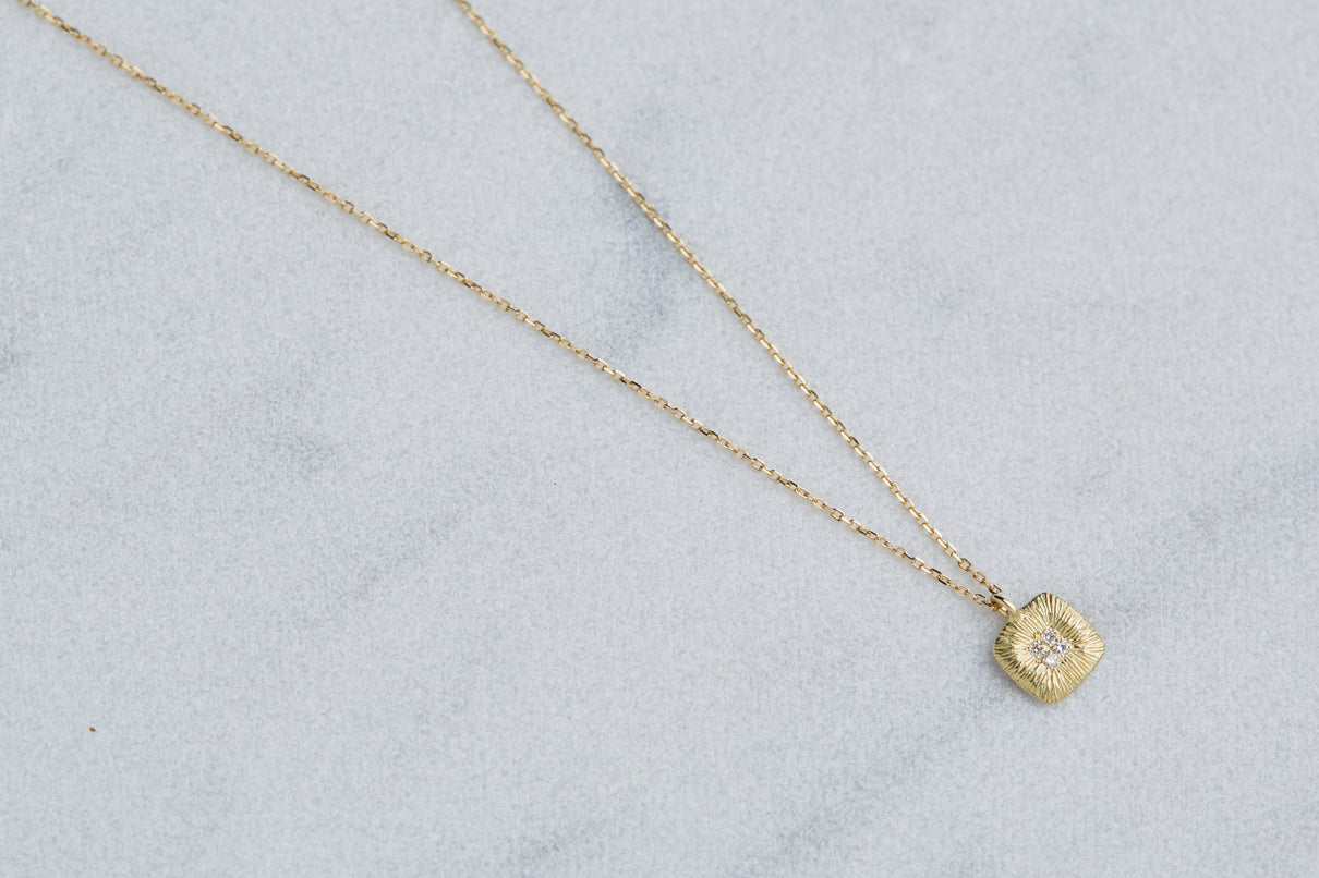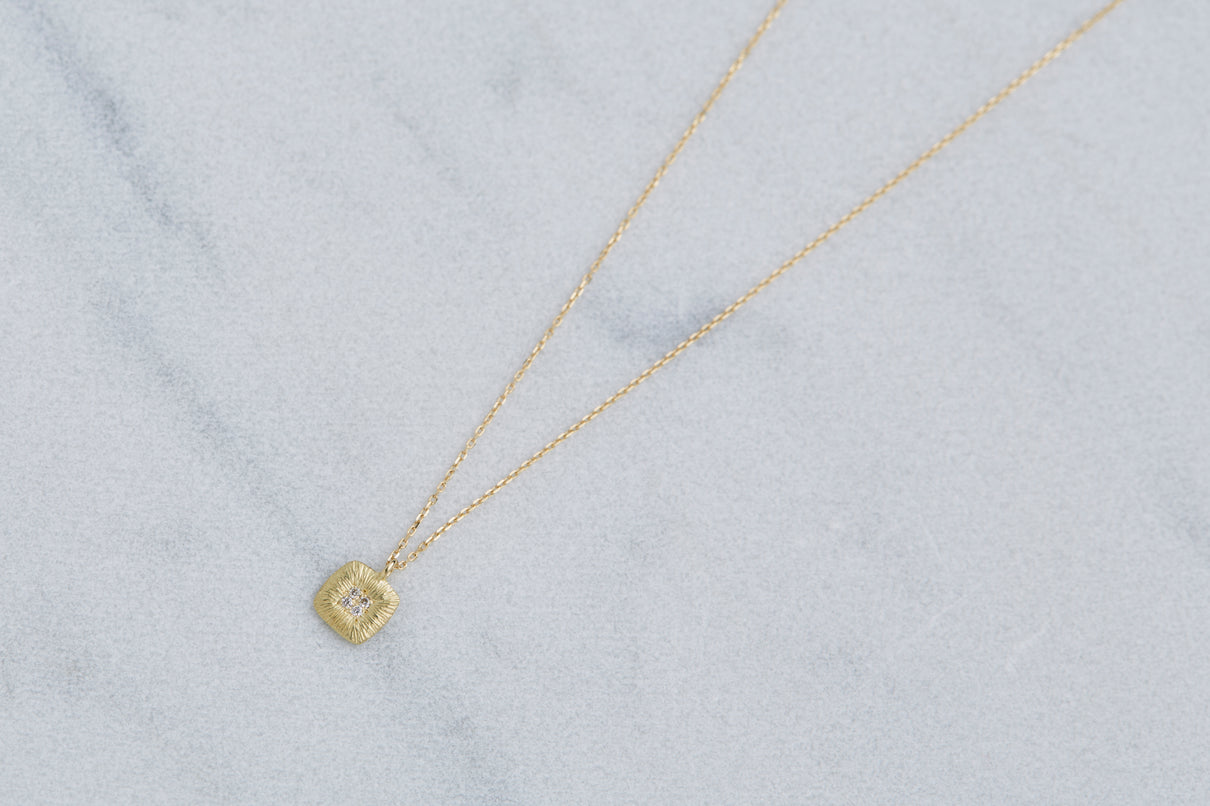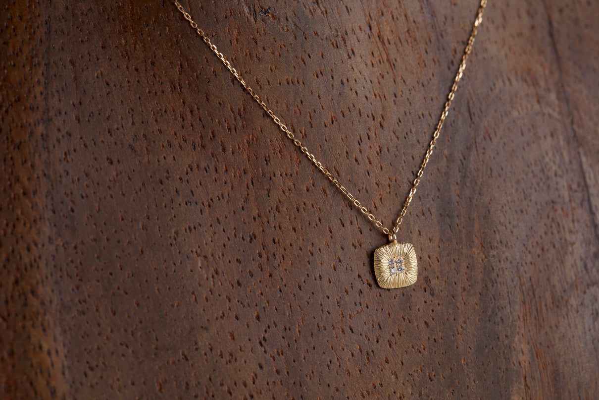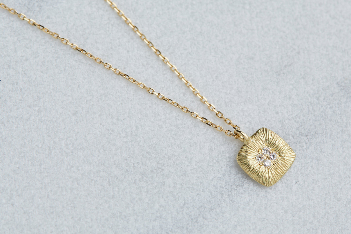 4ピースのメレダイヤモンドを、まるで刺繍のような繊細な手仕事のあしらいで縁取ったネックレス。星の瞬きのような細やかなメレダイヤモンドの煌めきとゴールドの細かな彫り模様が描く陰影により、シンプルながらも奥行きのあるダイヤモンドネックレスに仕立てました。チェーンの長さは日常使いしやすい40cm。さらりと1本で纏うのはもちろん、長さの異なるパールネックレスとのコーディネートなど、気分や装いに合わせてお楽しみいただけます。