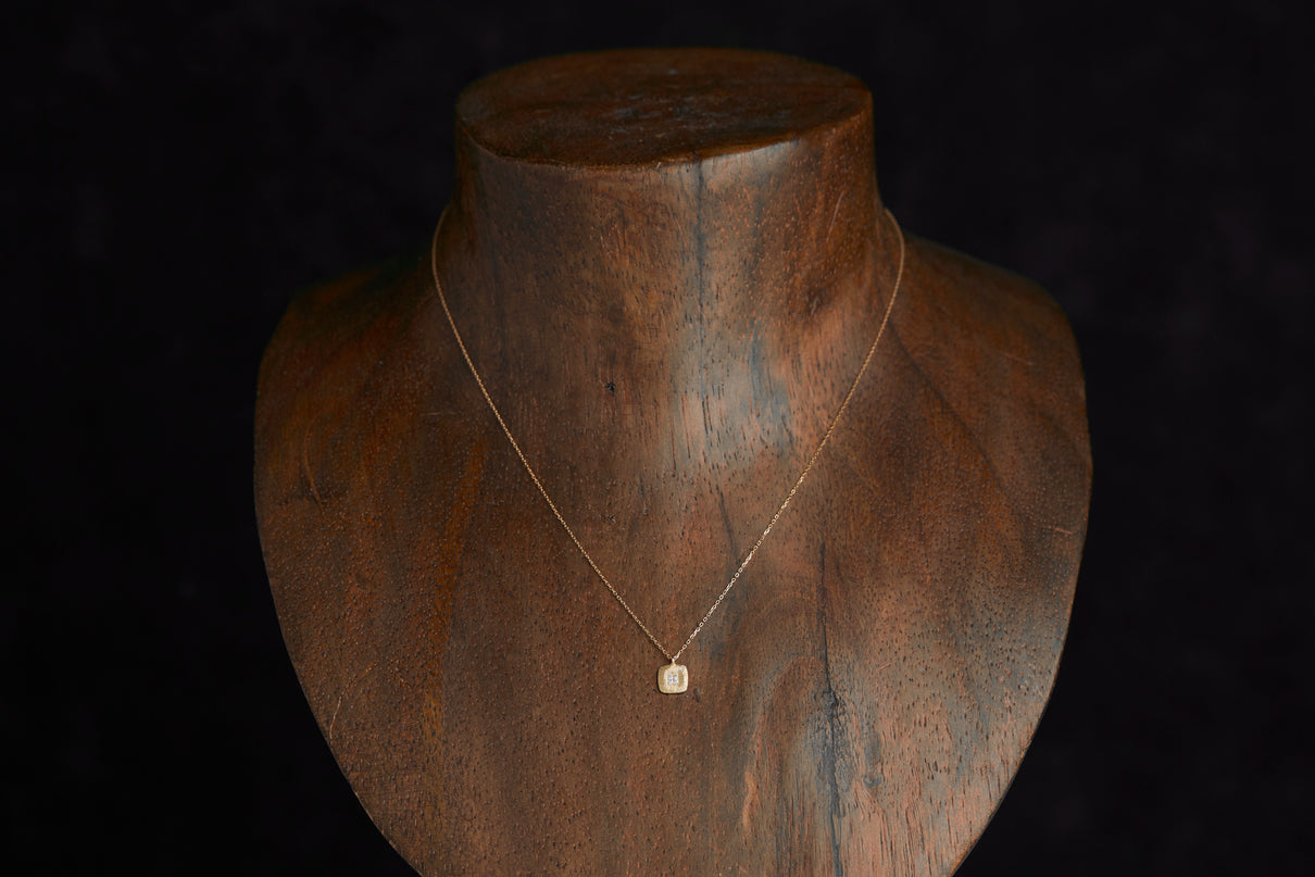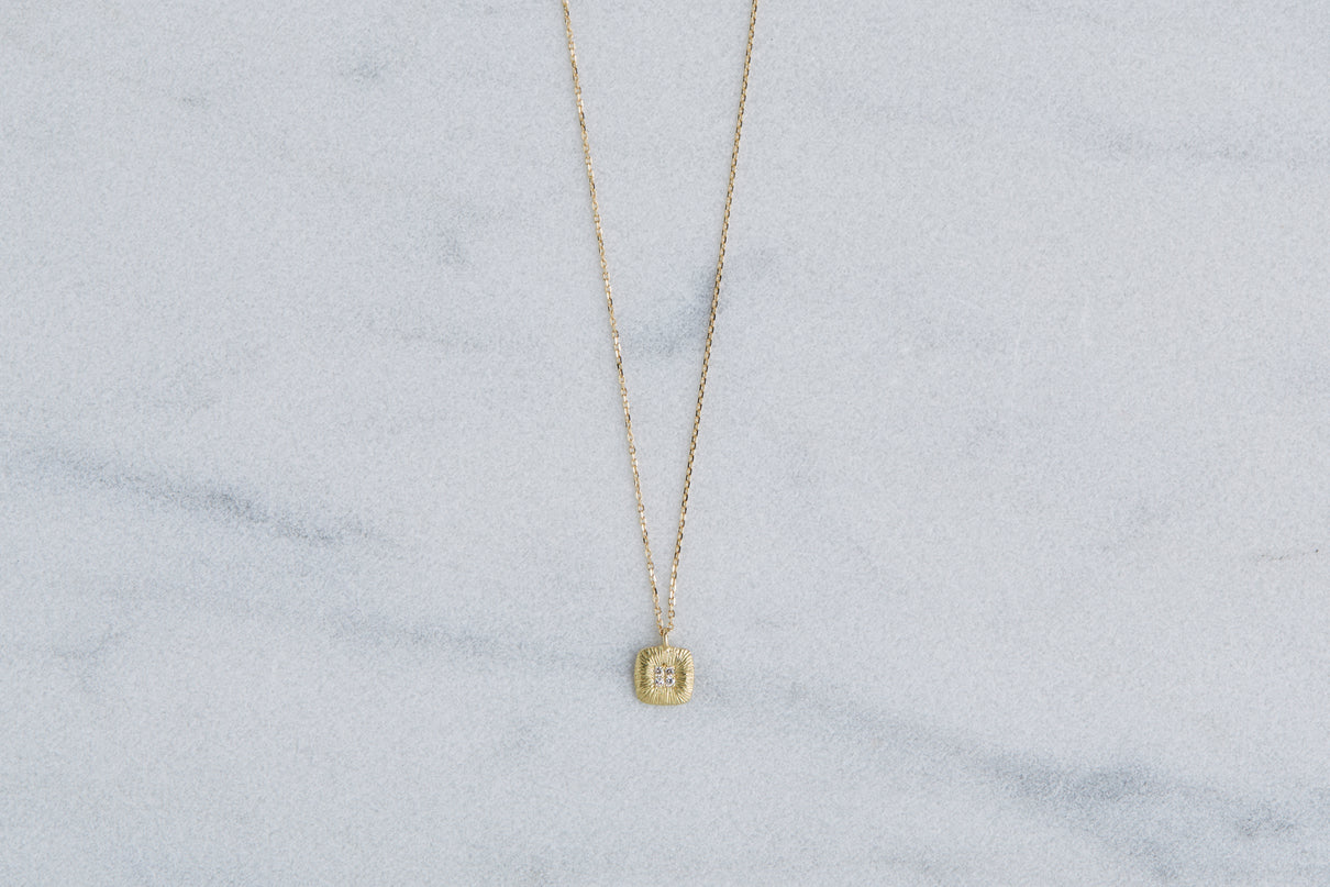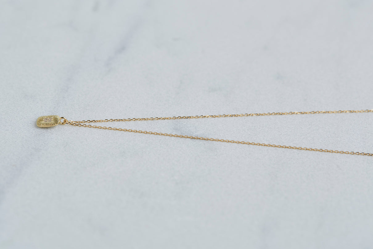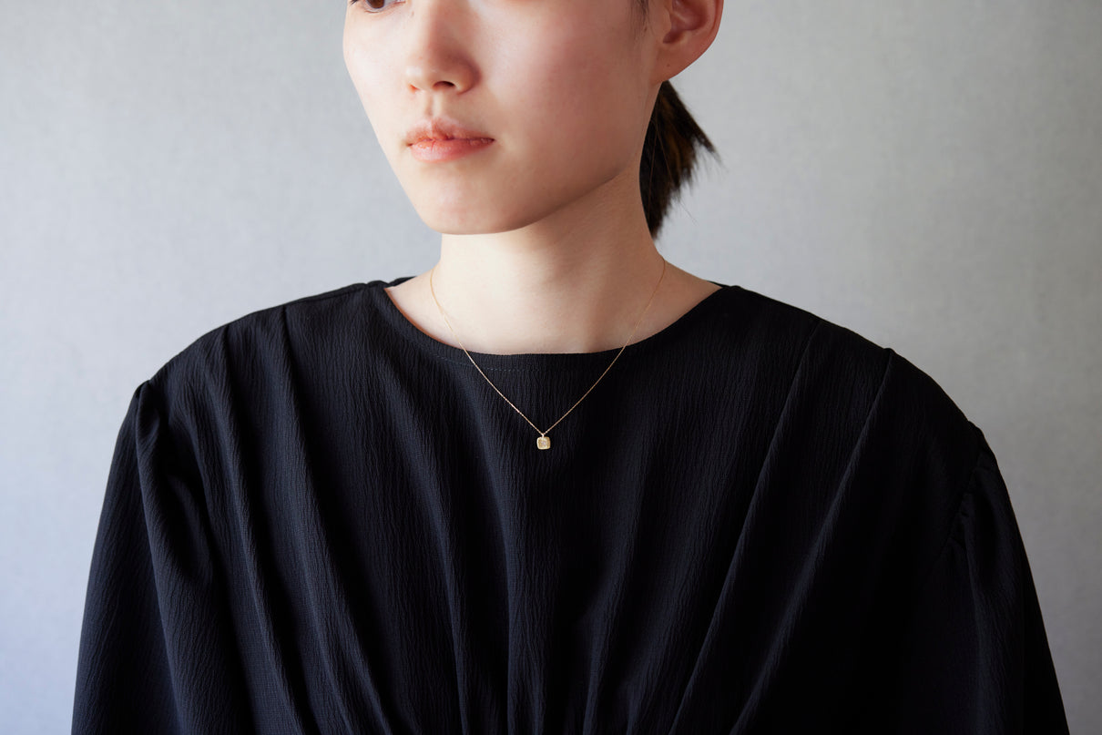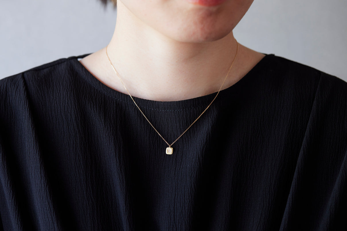 4ピースのメレダイヤモンドを、まるで刺繍のような繊細な手仕事のあしらいで縁取ったネックレス。星の瞬きのような細やかなメレダイヤモンドの煌めきとゴールドの細かな彫り模様が描く陰影により、シンプルながらも奥行きのあるダイヤモンドネックレスに仕立てました。チェーンの長さは日常使いしやすい40cm。さらりと1本で纏うのはもちろん、長さの異なるパールネックレスとのコーディネートなど、気分や装いに合わせてお楽しみいただけます。