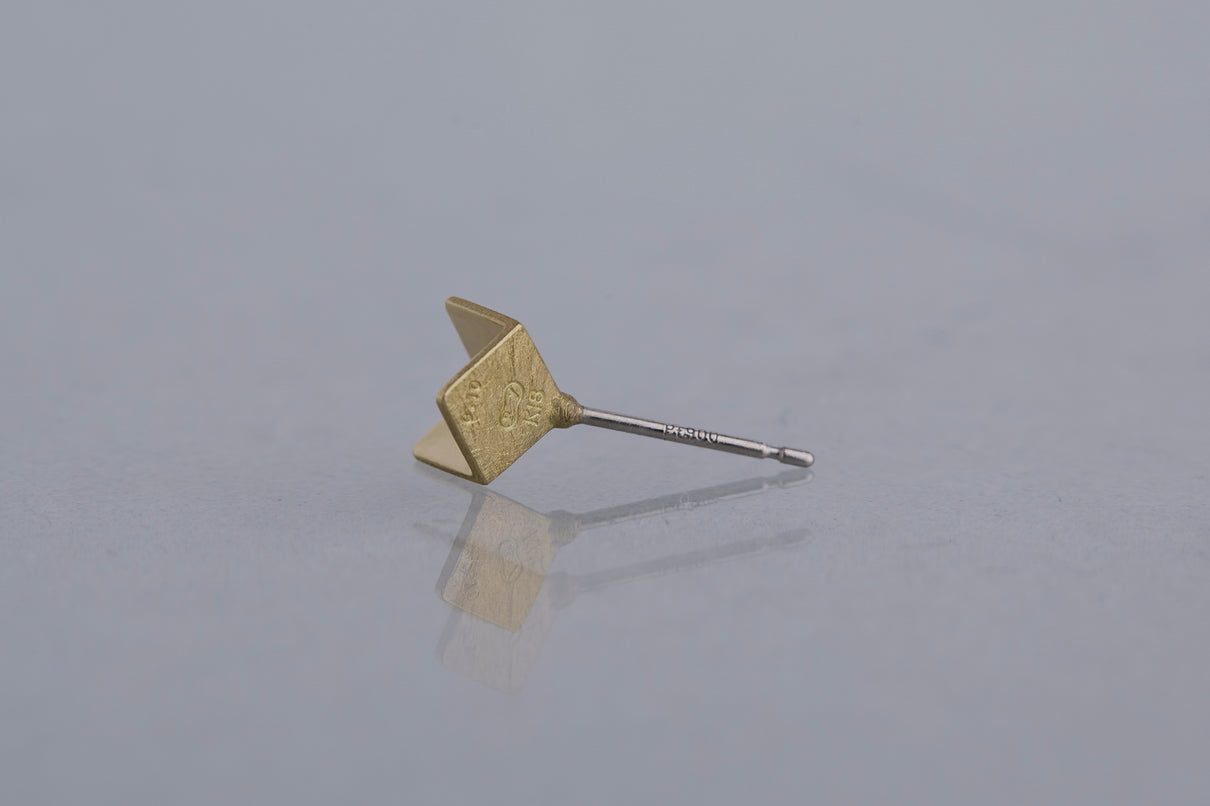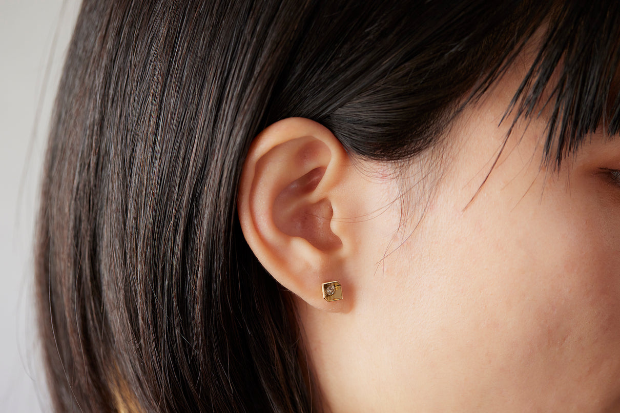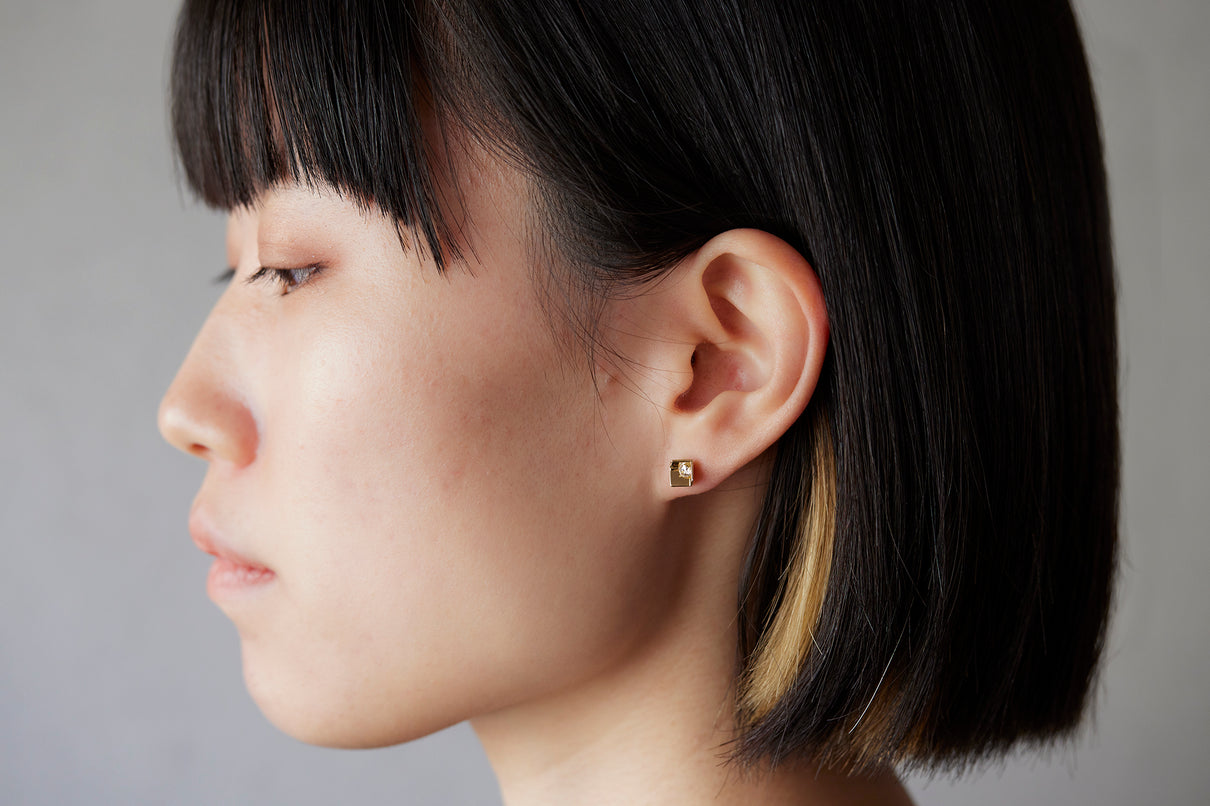 2024 Collection 「Destination -行先」シリーズのピアス。煌めく三つの面が合わせ鏡となり浮かび上がる立方体。内側は鏡面、外側はマットテクスチャーを施した、内外異なる表情が奥行きのあるニュアンスを生むピアスです。一瞬の光を掴んだ面同士が、短く反射し合うことで六条の星模様を描き出し、フラットで強い光を放ちます。平面的にも立体的にも見えるこの立方体の面構造は、角度によって目の錯覚を起こし、与える印象を豊かに変化させます。そして中央にまるで浮かんでいるかのように配された一石のダイヤモンド。あらゆる方位から光を取り込み、鏡面に映し出され光を広げることで、一層眩く奥行きのある存在感を示します。よりしっかりと立方体の構造をお楽しみいただけるMサイズ。ダイヤモンドの煌めきとともに耳元に華やぎを与える、ギフトにも最適なアイテムです。