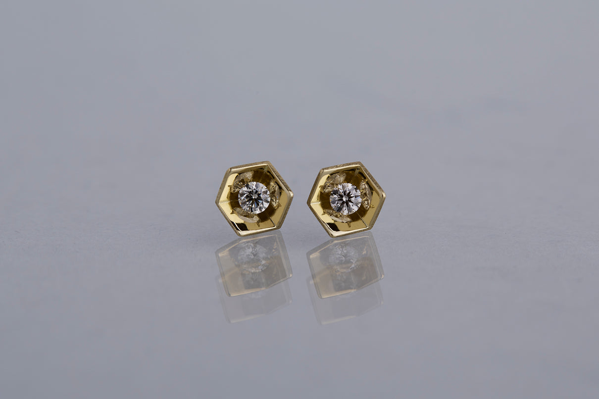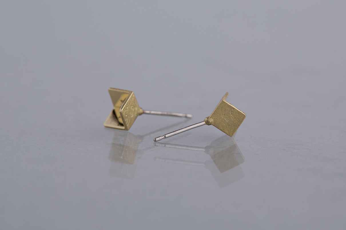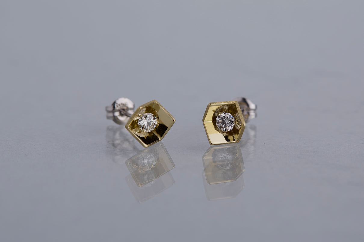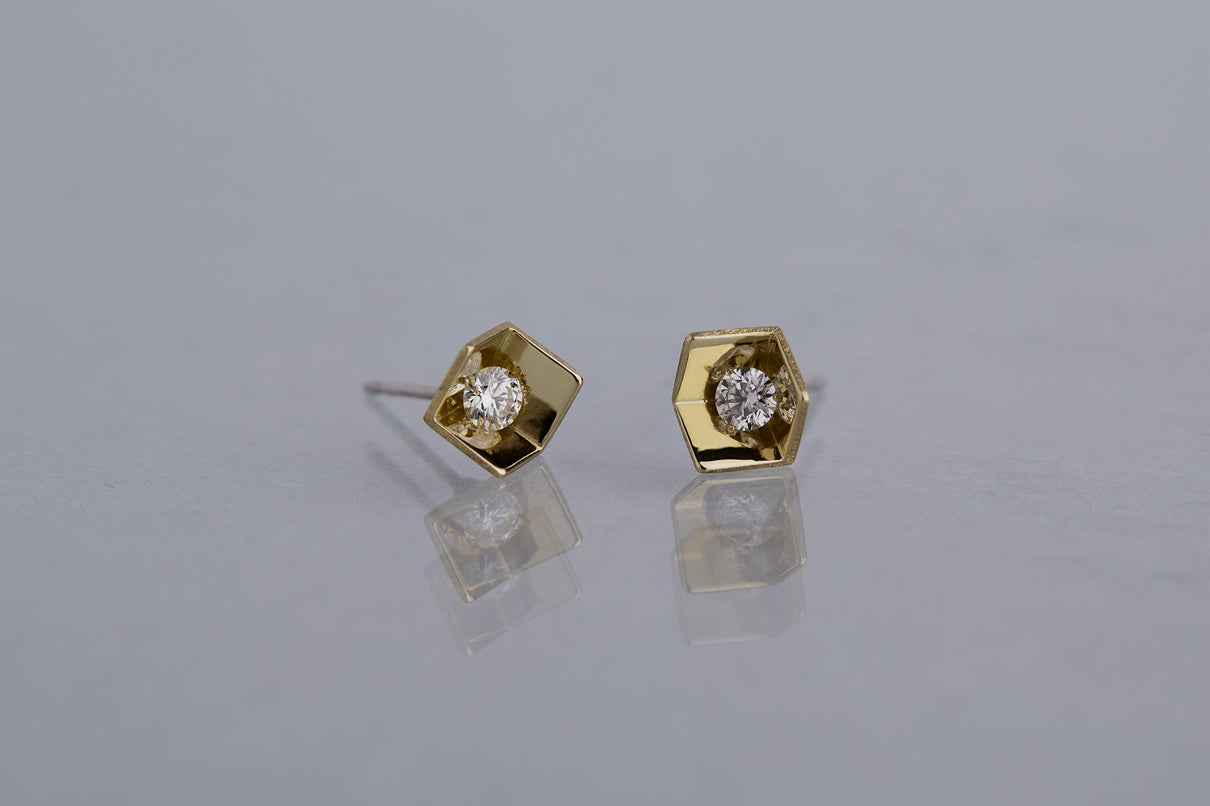 2024 Collection 「Destination -行先」シリーズのピアス。煌めく三つの面が合わせ鏡となり浮かび上がる立方体。内側は鏡面、外側はマットテクスチャーを施した、内外異なる表情が奥行きのあるニュアンスを生むピアスです。一瞬の光を掴んだ面同士が、短く反射し合うことで六条の星模様を描き出し、フラットで強い光を放ちます。平面的にも立体的にも見えるこの立方体の面構造は、角度によって目の錯覚を起こし、与える印象を豊かに変化させます。そして中央にまるで浮かんでいるかのように配された一石のダイヤモンド。あらゆる方位から光を取り込み、鏡面に映し出され光を広げることで、一層眩く奥行きのある存在感を示します。よりしっかりと立方体の構造をお楽しみいただけるMサイズ。ダイヤモンドの煌めきとともに耳元に華やぎを与える、ギフトにも最適なアイテムです。