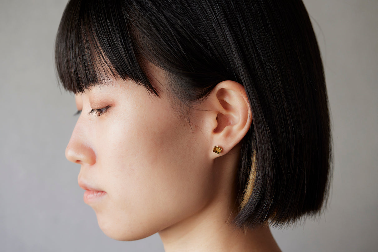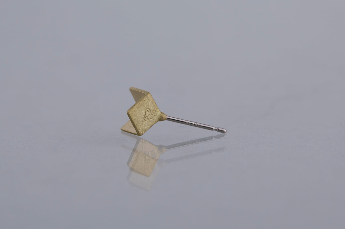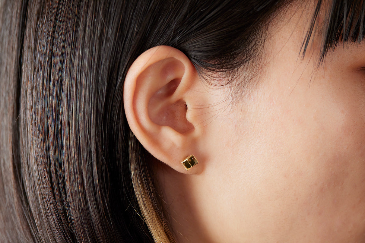 2024 Collection 「Destination -行先」シリーズのピアス。煌めく三つの面が合わせ鏡となり浮かび上がる立方体。内側は鏡面、外側はマットテクスチャーを施した、内外異なる表情が奥行きのあるニュアンスを生むピアスです。一瞬の光を掴んだ面同士が、短く反射し合うことで六条の星模様を描き出し、フラットで強い光を放ちます。平面的にも立体的にも見えるこの立方体の面構造は、角度によって目の錯覚を起こし、与える印象を豊かに変化させます。よりしっかりと立方体の構造をお楽しみいただけるMサイズは、ほど良いアクセントとして耳元を飾ります。