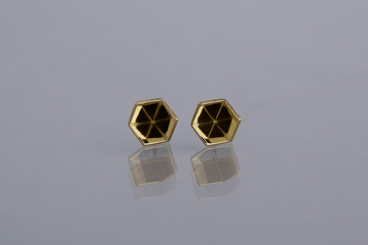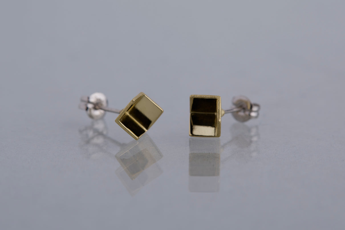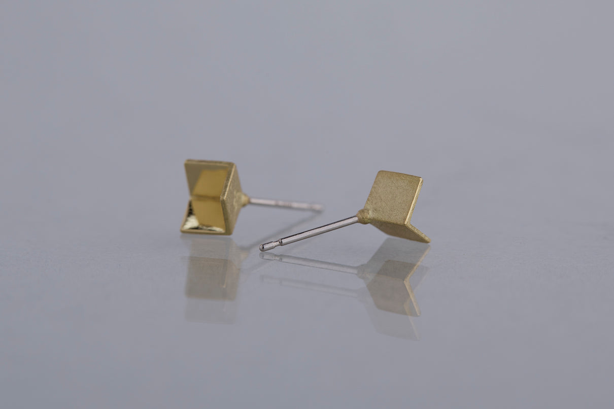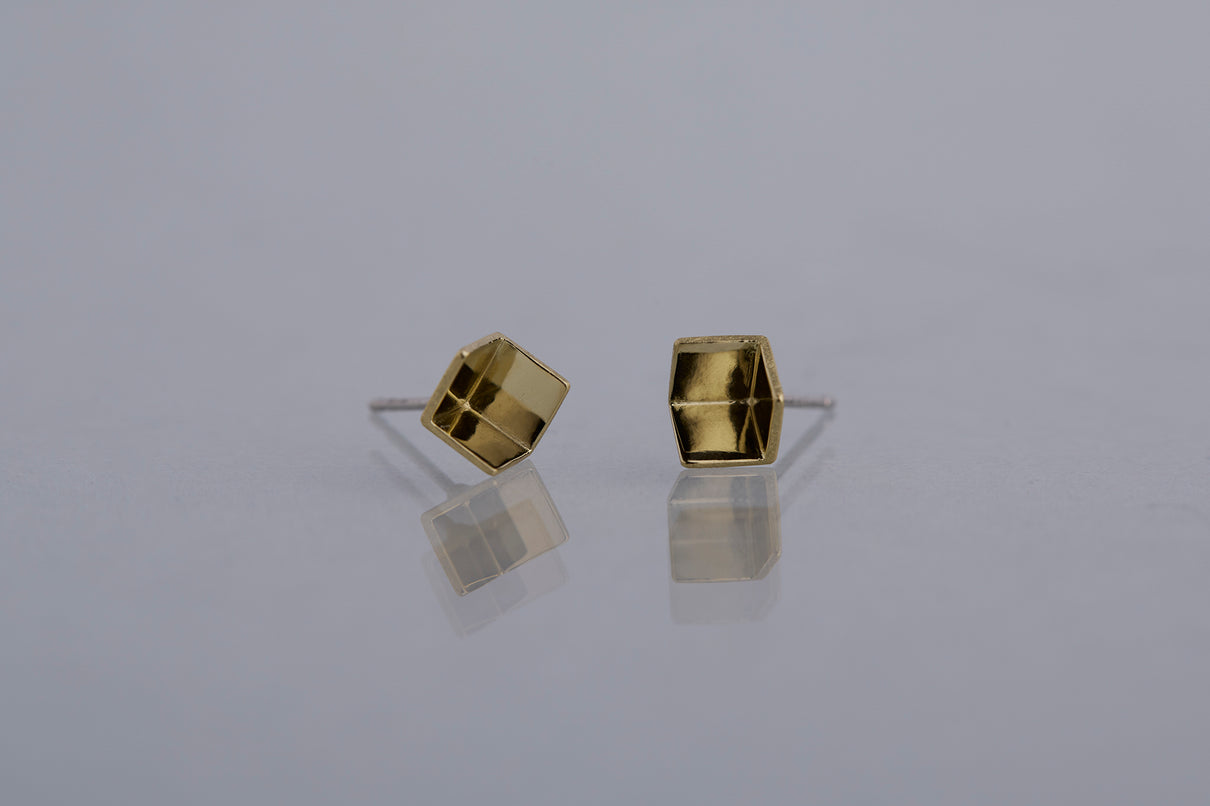 2024 Collection 「Destination -行先」シリーズのピアス。煌めく三つの面が合わせ鏡となり浮かび上がる立方体。内側は鏡面、外側はマットテクスチャーを施した、内外異なる表情が奥行きのあるニュアンスを生むピアスです。一瞬の光を掴んだ面同士が、短く反射し合うことで六条の星模様を描き出し、フラットで強い光を放ちます。平面的にも立体的にも見えるこの立方体の面構造は、角度によって目の錯覚を起こし、与える印象を豊かに変化させます。よりしっかりと立方体の構造をお楽しみいただけるMサイズは、ほど良いアクセントとして耳元を飾ります。