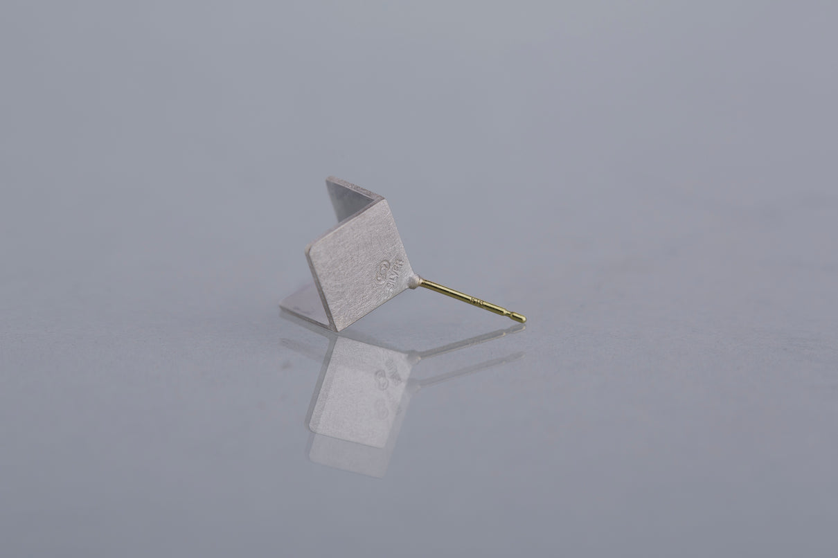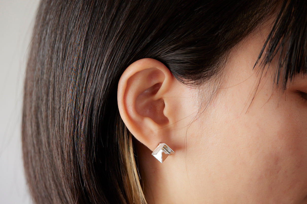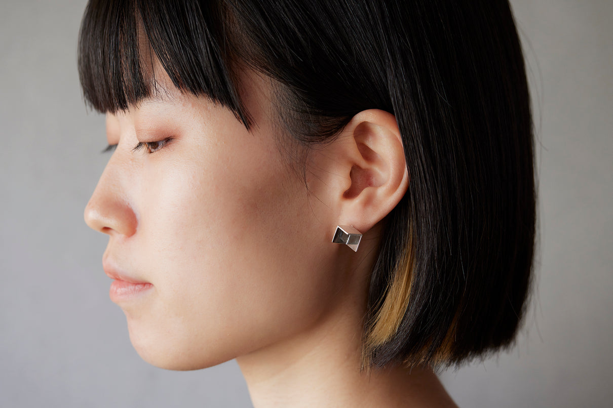 2024 Collection 「Destination -行先」シリーズのピアス。煌めく三つの面が合わせ鏡となり浮かび上がる立方体。内側は鏡面、外側はマットテクスチャーを施した、内外異なる表情が奥行きのあるニュアンスを生むピアスです。一瞬の光を掴んだ面同士が、短く反射し合うことで六条の星模様を描き出し、フラットで強い光を放ちます。平面的にも立体的にも見えるこの立方体の面構造は、角度によって目の錯覚を起こし、与える印象を豊かに変化させます。存在感のあるシルバータイプは、よりはっきりと立方体の構造をとらえることができるため、シンプルな装いのスパイスとして取り入れていただくのもお勧めです。また変色を防ぐロジウムコーティングにより、安心して永くシルバーの輝きをお楽しみいただけます。