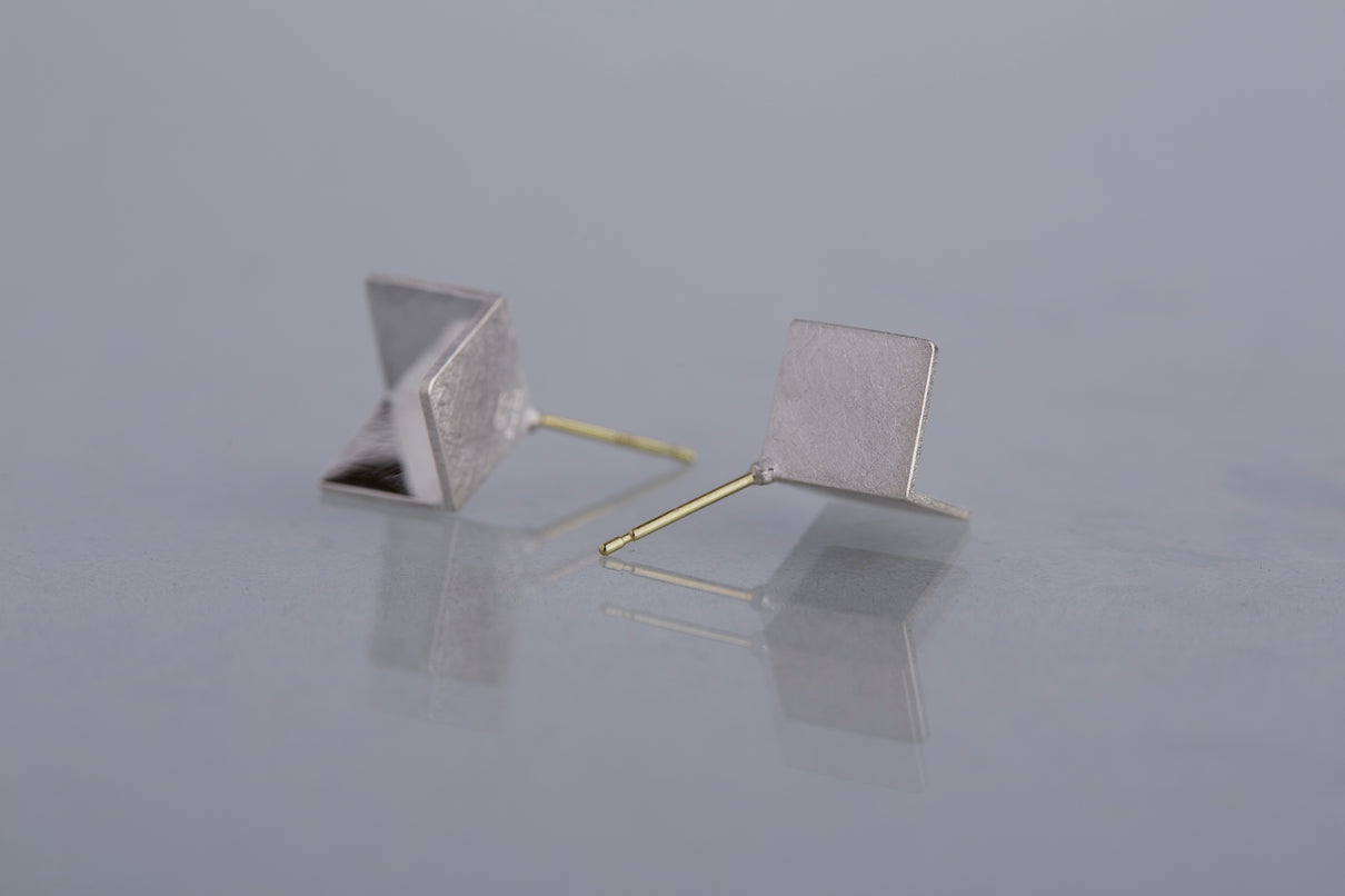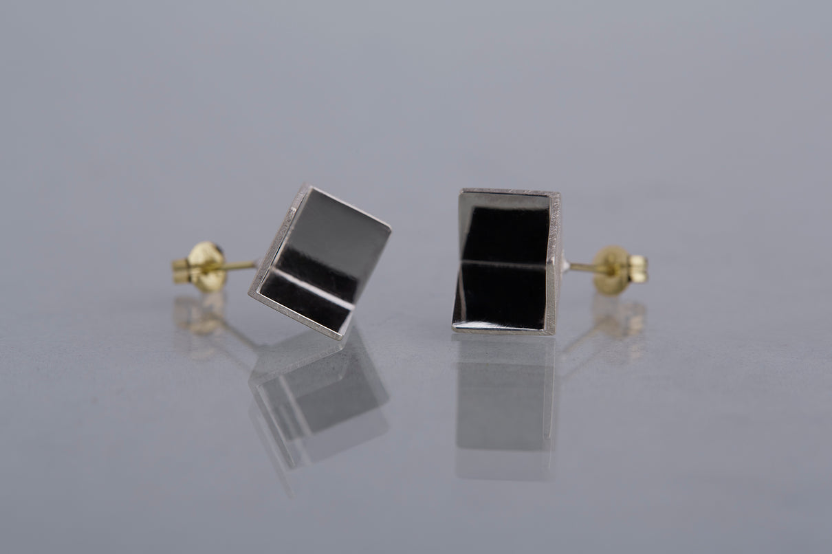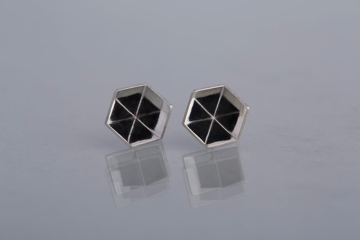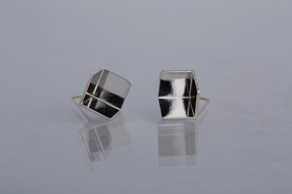 2024 Collection 「Destination -行先」シリーズのピアス。煌めく三つの面が合わせ鏡となり浮かび上がる立方体。内側は鏡面、外側はマットテクスチャーを施した、内外異なる表情が奥行きのあるニュアンスを生むピアスです。一瞬の光を掴んだ面同士が、短く反射し合うことで六条の星模様を描き出し、フラットで強い光を放ちます。平面的にも立体的にも見えるこの立方体の面構造は、角度によって目の錯覚を起こし、与える印象を豊かに変化させます。存在感のあるシルバータイプは、よりはっきりと立方体の構造をとらえることができるため、シンプルな装いのスパイスとして取り入れていただくのもお勧めです。また変色を防ぐロジウムコーティングにより、安心して永くシルバーの輝きをお楽しみいただけます。
