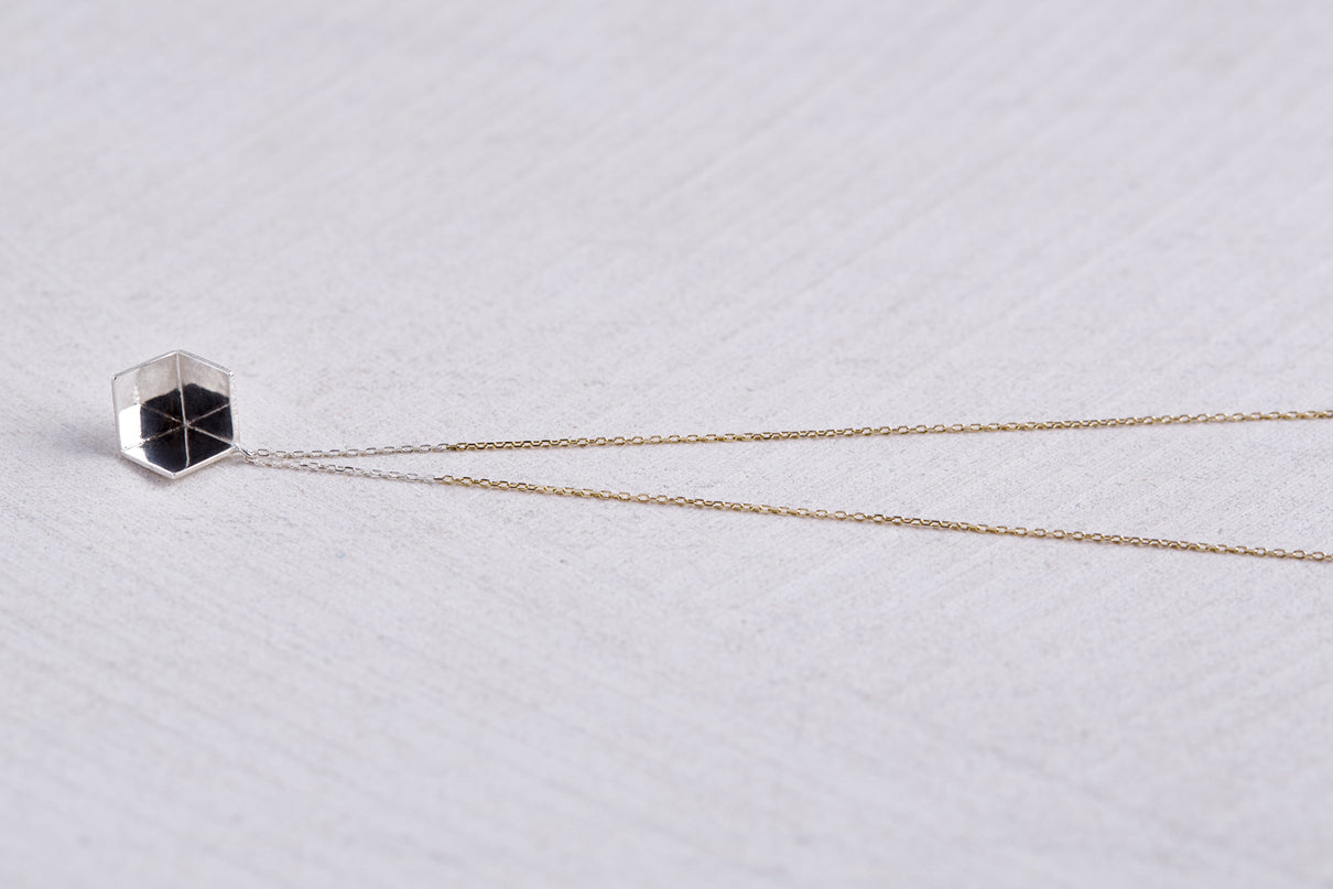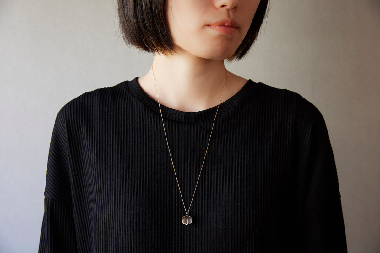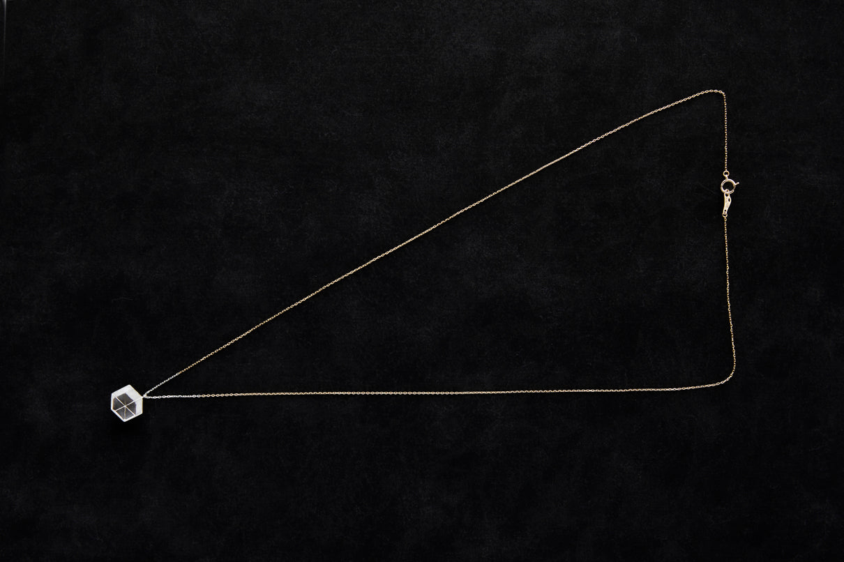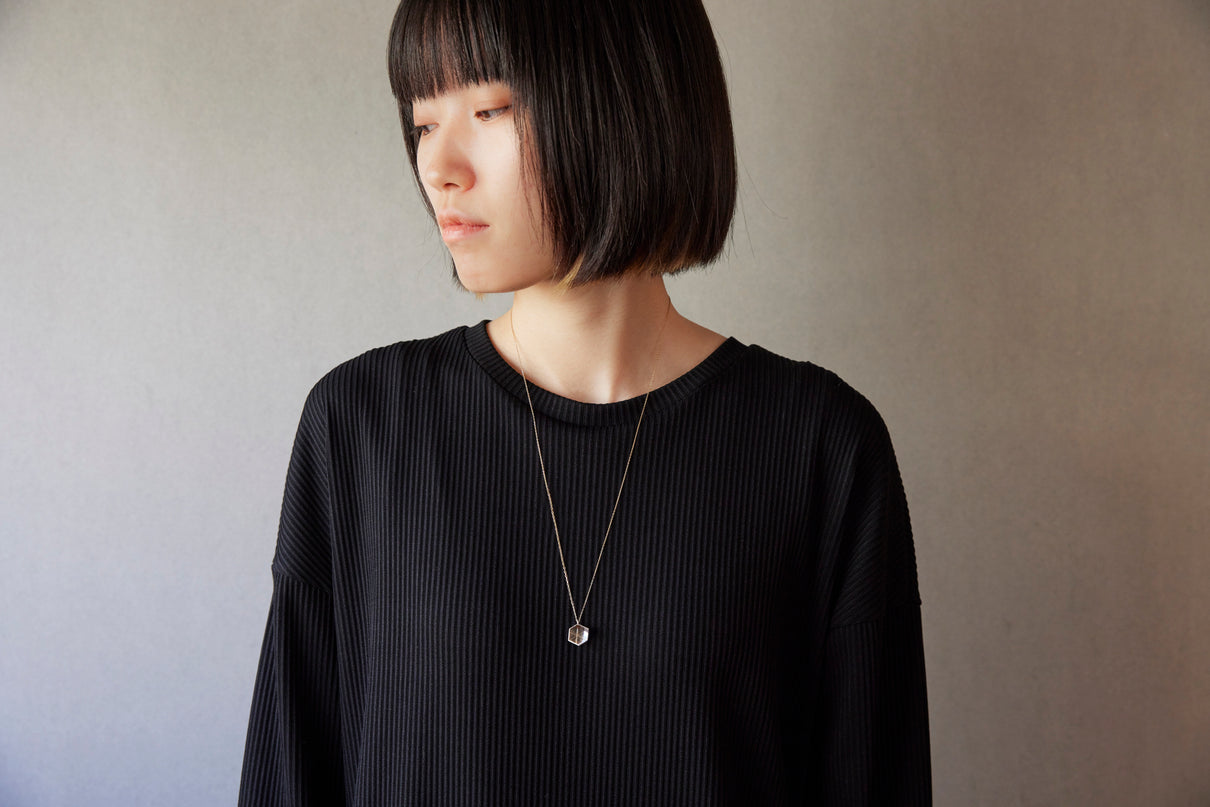 2024 Collection 「Destination -行先」シリーズのネックレス。煌めく三つの面が合わせ鏡となり浮かび上がる立方体。内側は鏡面、外側はマットテクスチャーを施した、内外異なる表情が奥行きのあるニュアンスを生むネックレスです。一瞬の光を掴んだ面同士が、短く反射し合うことで六条の星模様を描き出し、フラットで強い光を放ちます。平面的にも立体的にも見えるこの立方体の面構造は、角度によって目の錯覚を起こし、与える印象を豊かに変化させます。イエローゴールドで仕立てたチェーンには、一部にさりげなくシルバーを配しているため、センターに位置した時には立方体モチーフと重なり、広がる光を彷彿とさせます。トップはシルバーのチェーン部分にあえて固定していない為、そのシルバーの位置が左右に振れ、アシンメトリーなバランスもお楽しみいただけます。また立方体のトップは身体の所作に応じて胸元で左右に傾くデザインで、様々な角度から表情豊かな輝きを見せます。存在感のあるシルバータイプは、よりしっかりと立方体の構造をとらえることができ、シンプルな装いのスパイスとして取り入れていただくのもお勧めです。変色を防ぐロジウムコーティングにより、安心して永くシルバーの輝きをお楽しみいただけます。