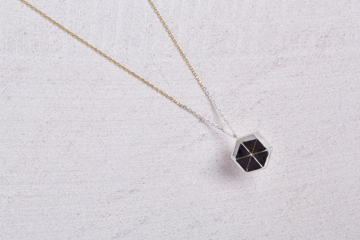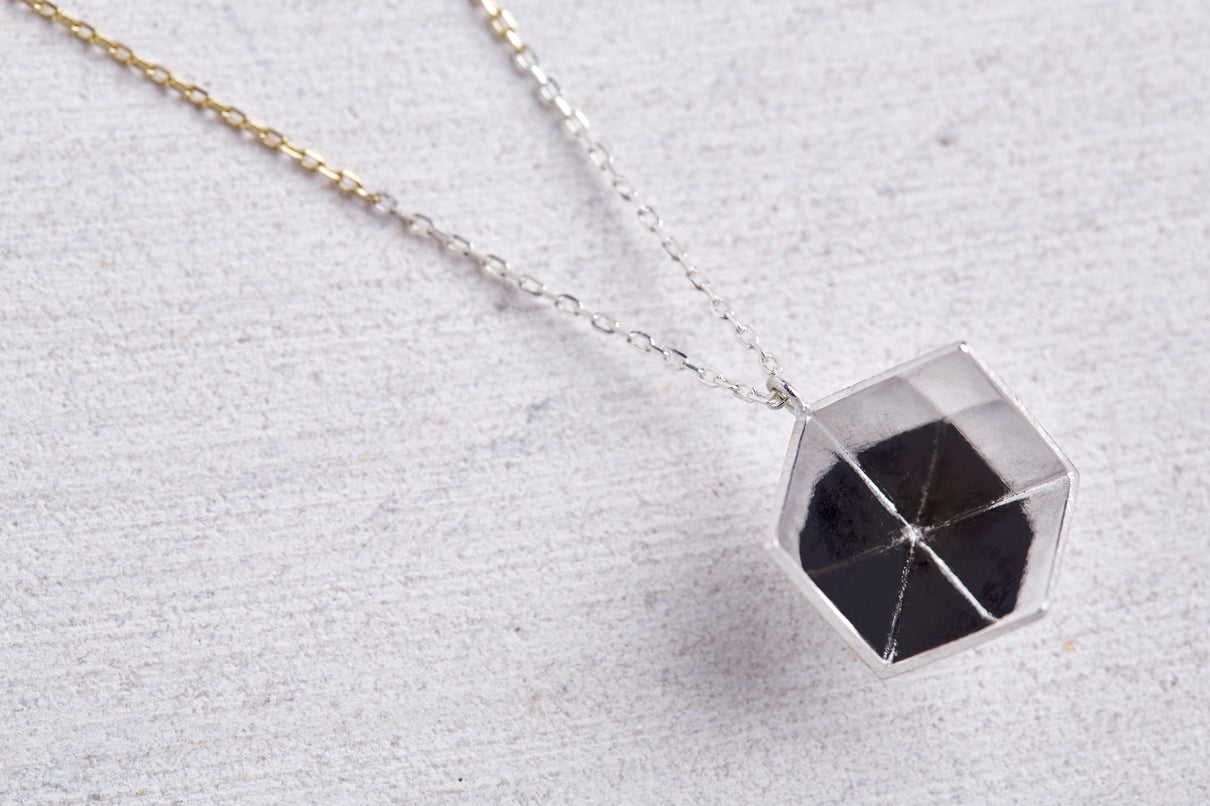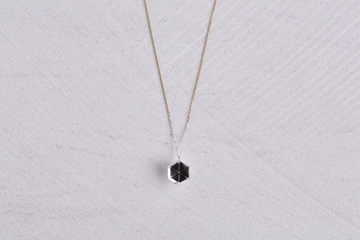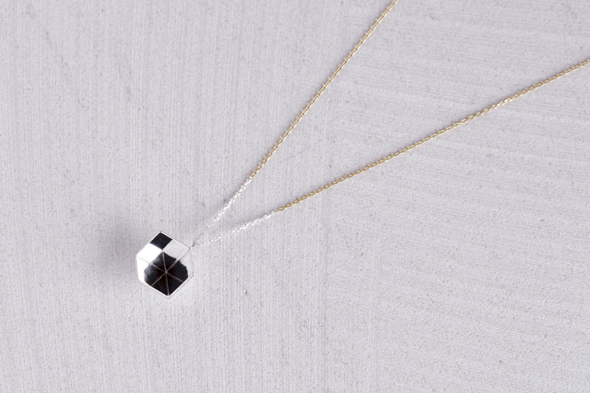 2024 Collection 「Destination -行先」シリーズのネックレス。煌めく三つの面が合わせ鏡となり浮かび上がる立方体。内側は鏡面、外側はマットテクスチャーを施した、内外異なる表情が奥行きのあるニュアンスを生むネックレスです。一瞬の光を掴んだ面同士が、短く反射し合うことで六条の星模様を描き出し、フラットで強い光を放ちます。平面的にも立体的にも見えるこの立方体の面構造は、角度によって目の錯覚を起こし、与える印象を豊かに変化させます。イエローゴールドで仕立てたチェーンには、一部にさりげなくシルバーを配しているため、センターに位置した時には立方体モチーフと重なり、広がる光を彷彿とさせます。トップはシルバーのチェーン部分にあえて固定していない為、そのシルバーの位置が左右に振れ、アシンメトリーなバランスもお楽しみいただけます。また立方体のトップは身体の所作に応じて胸元で左右に傾くデザインで、様々な角度から表情豊かな輝きを見せます。存在感のあるシルバータイプは、よりしっかりと立方体の構造をとらえることができ、シンプルな装いのスパイスとして取り入れていただくのもお勧めです。変色を防ぐロジウムコーティングにより、安心して永くシルバーの輝きをお楽しみいただけます。