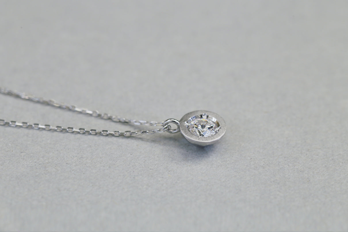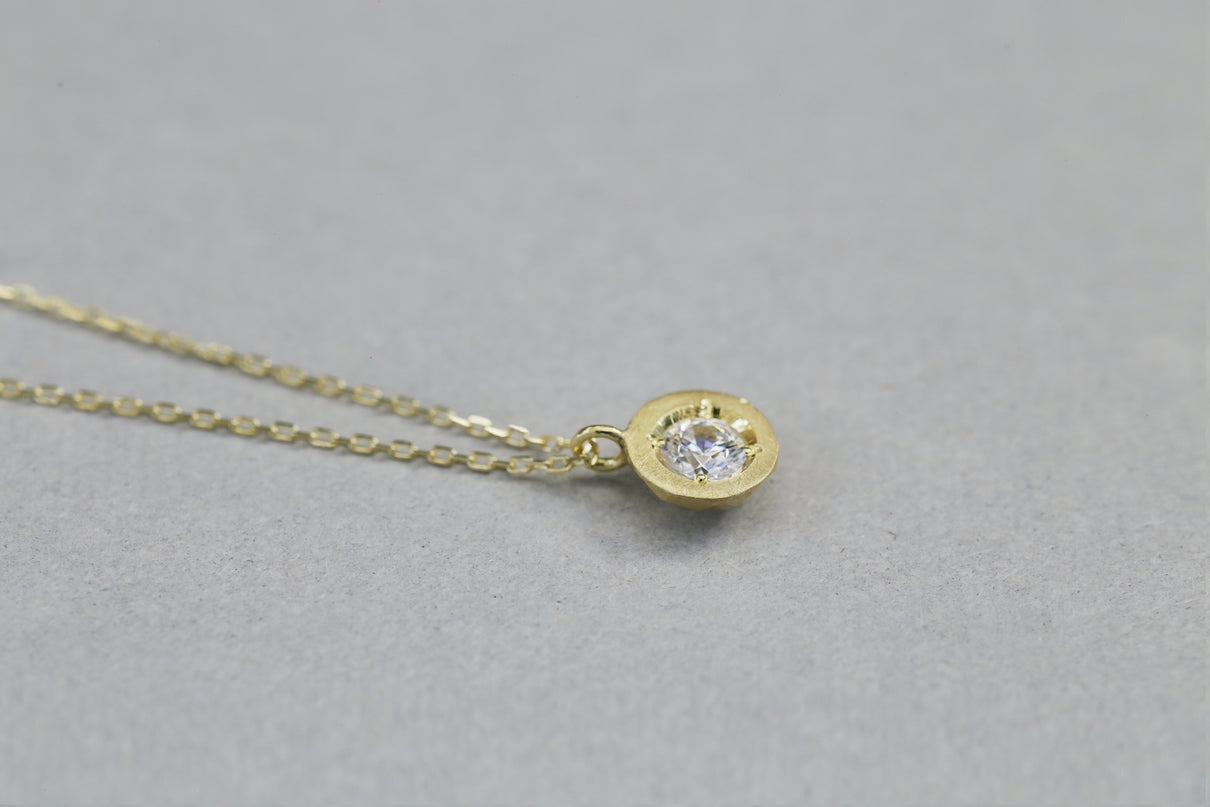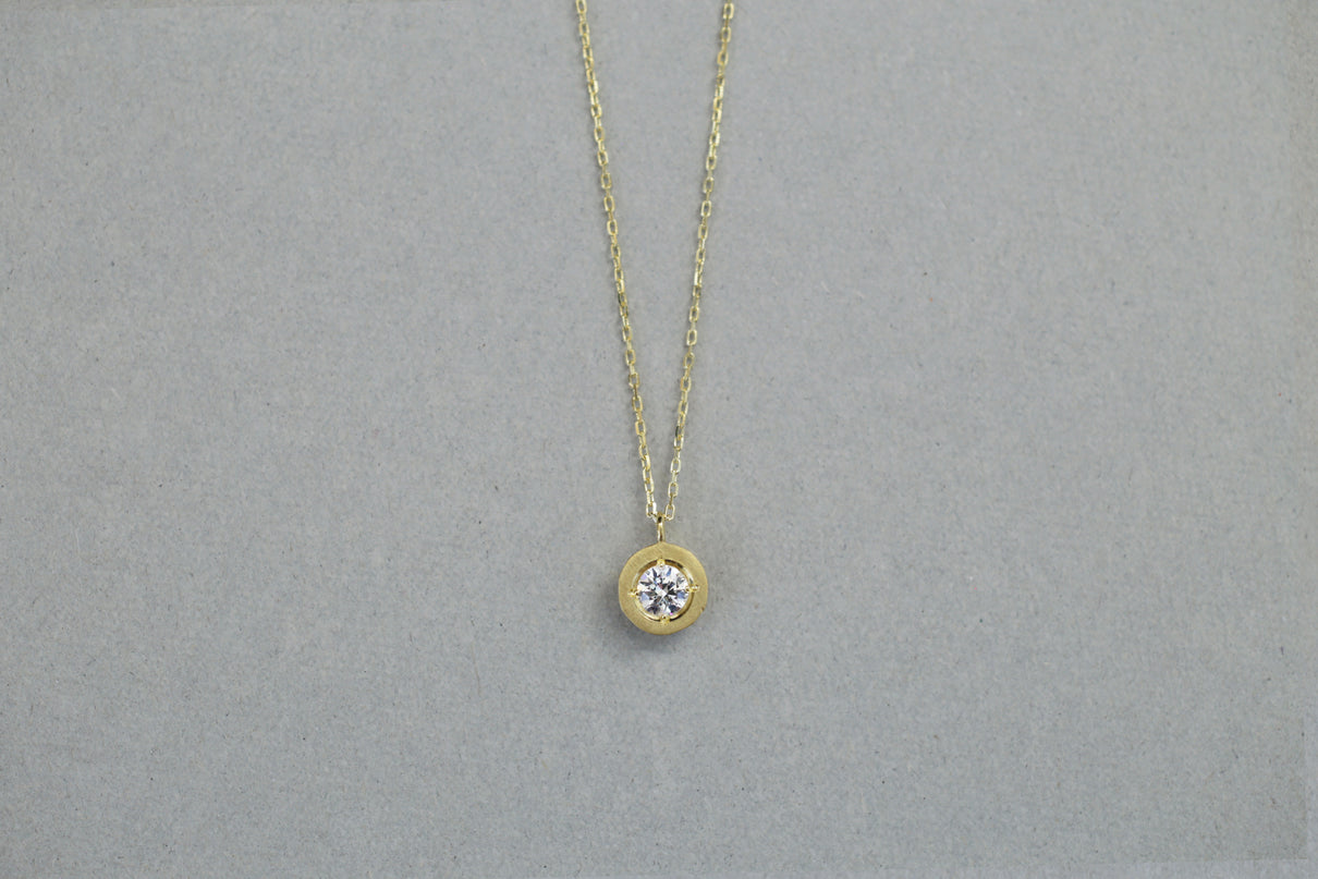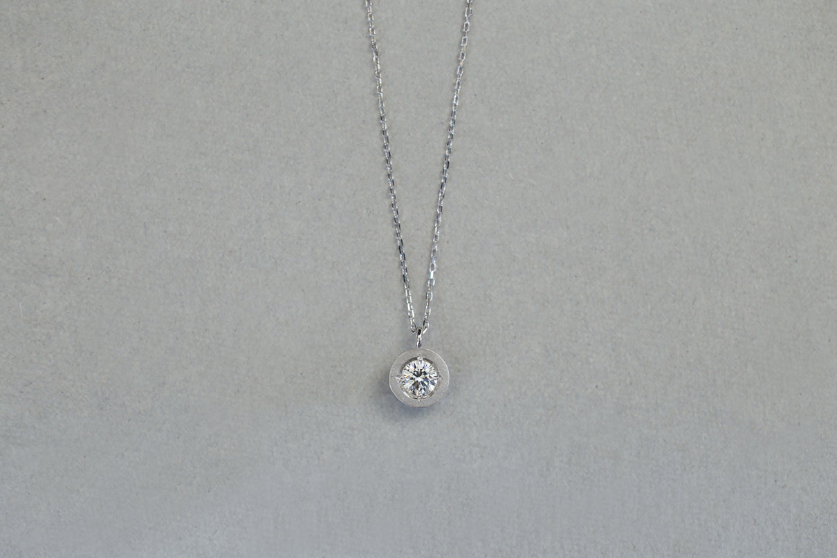 ダイヤモンドをぐるりと囲み上下左右の4点で留めた、凛とした存在感を放つネックレス。ころんとしたフォルムのトップの裏は、荒く削りだしたような面が織りなすラフカットのテクスチャーを施しています。地金のマットな質感がダイヤモンドの存在感を引き立て、胸元で揺れるたび煌めきます。