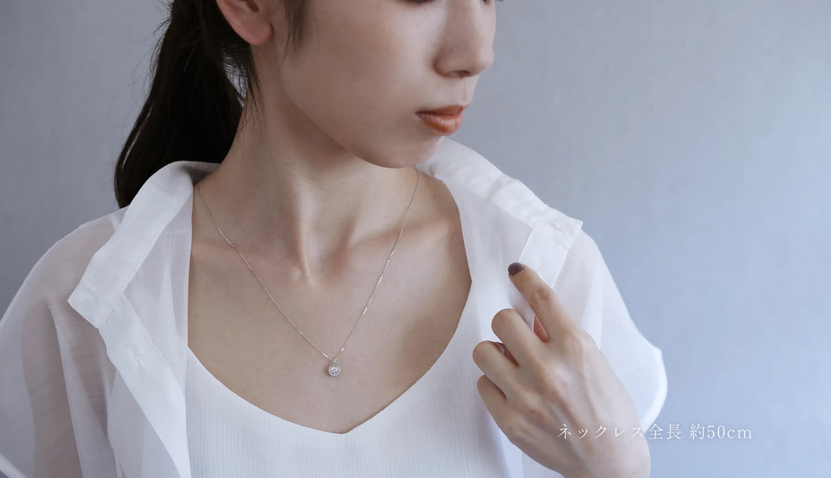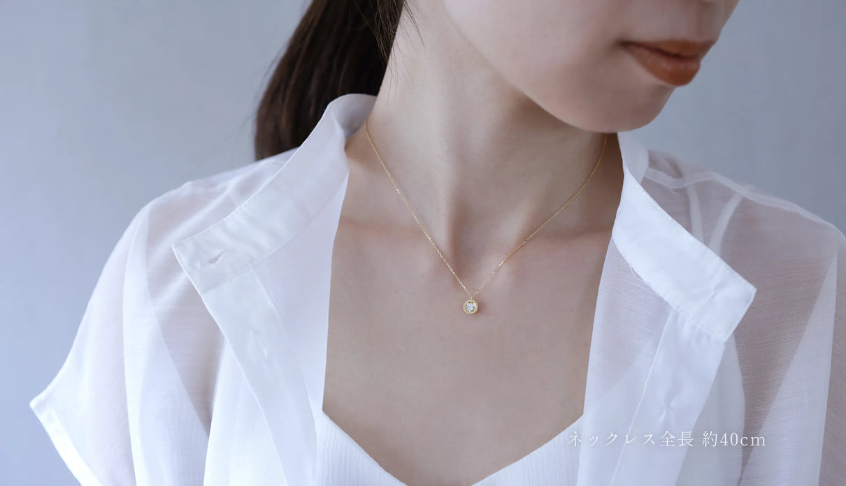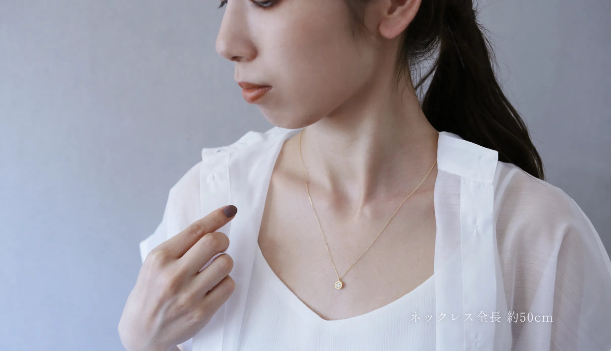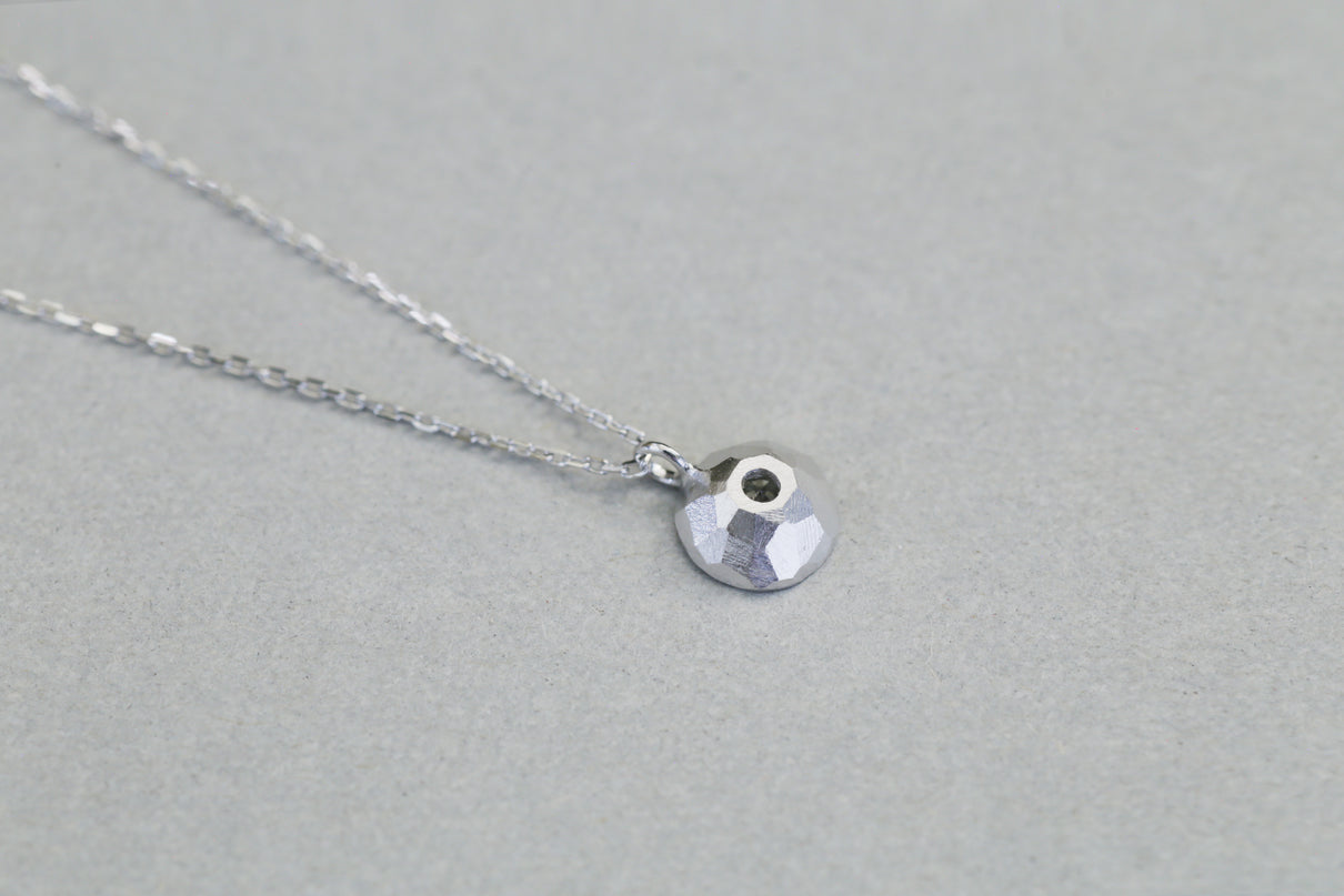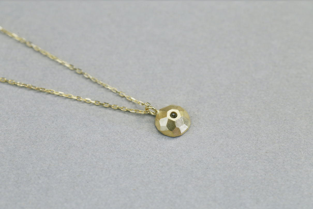 ダイヤモンドをぐるりと囲み上下左右の4点で留めた、凛とした存在感を放つネックレス。ころんとしたフォルムのトップの裏は、荒く削りだしたような面が織りなすラフカットのテクスチャーを施しています。地金のマットな質感がダイヤモンドの存在感を引き立て、胸元で揺れるたび煌めきます。