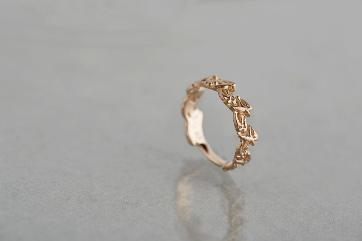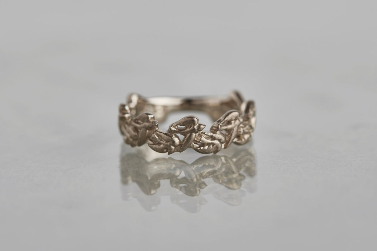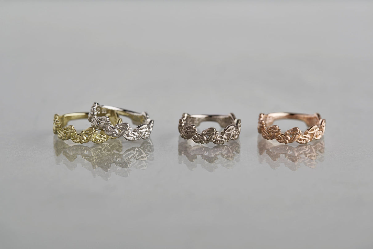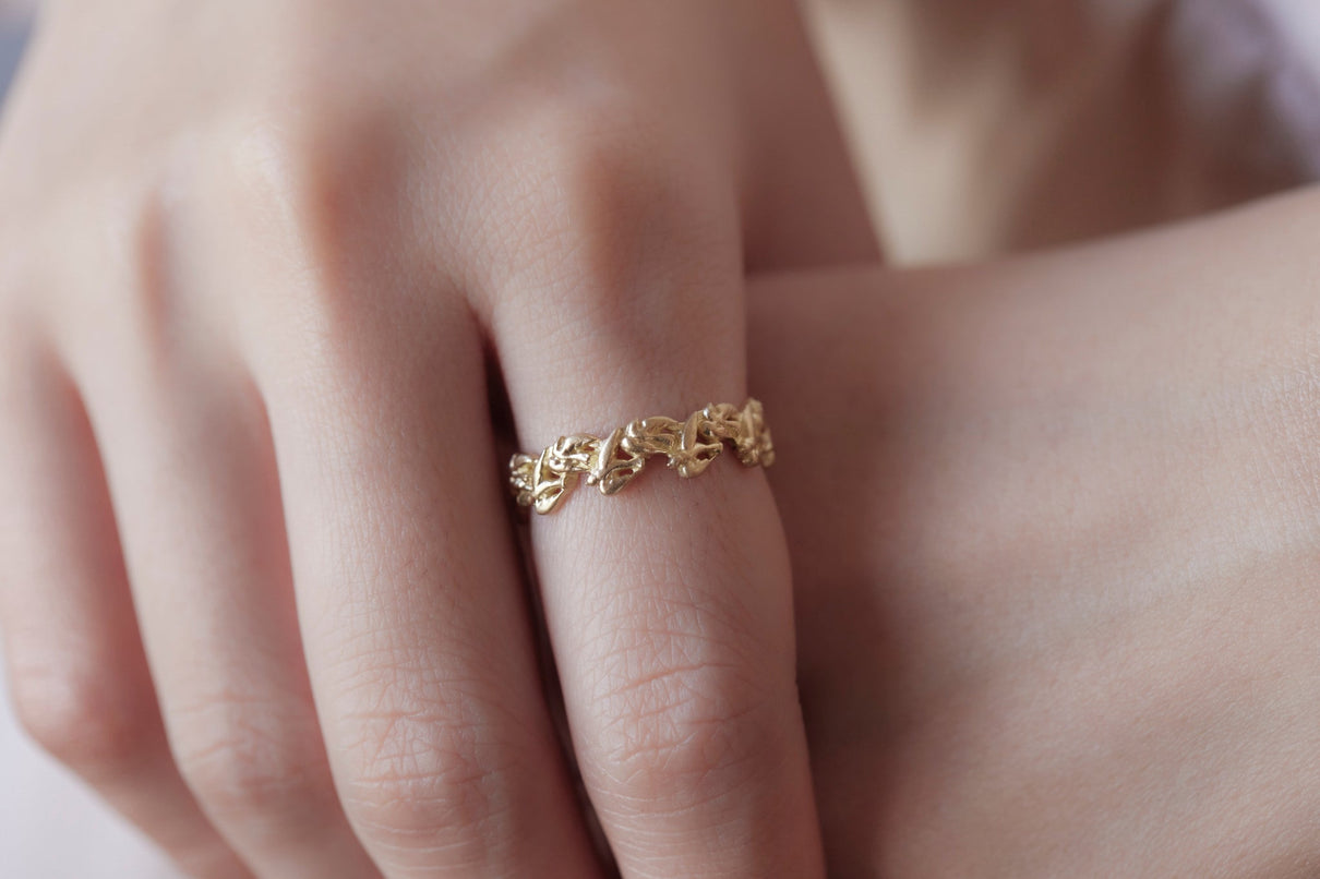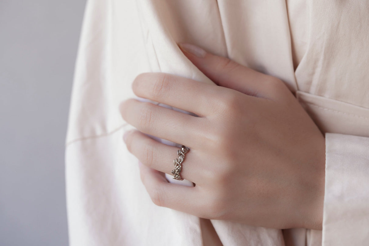 レース刺繍のように鳥たちが連なる表情を、透かしの表現を用いて軽やかに仕立てたエターナルリング。