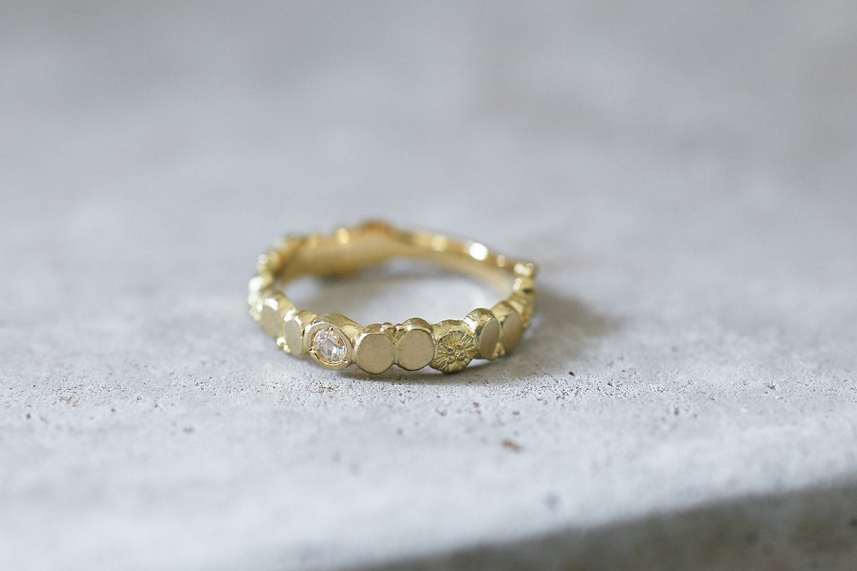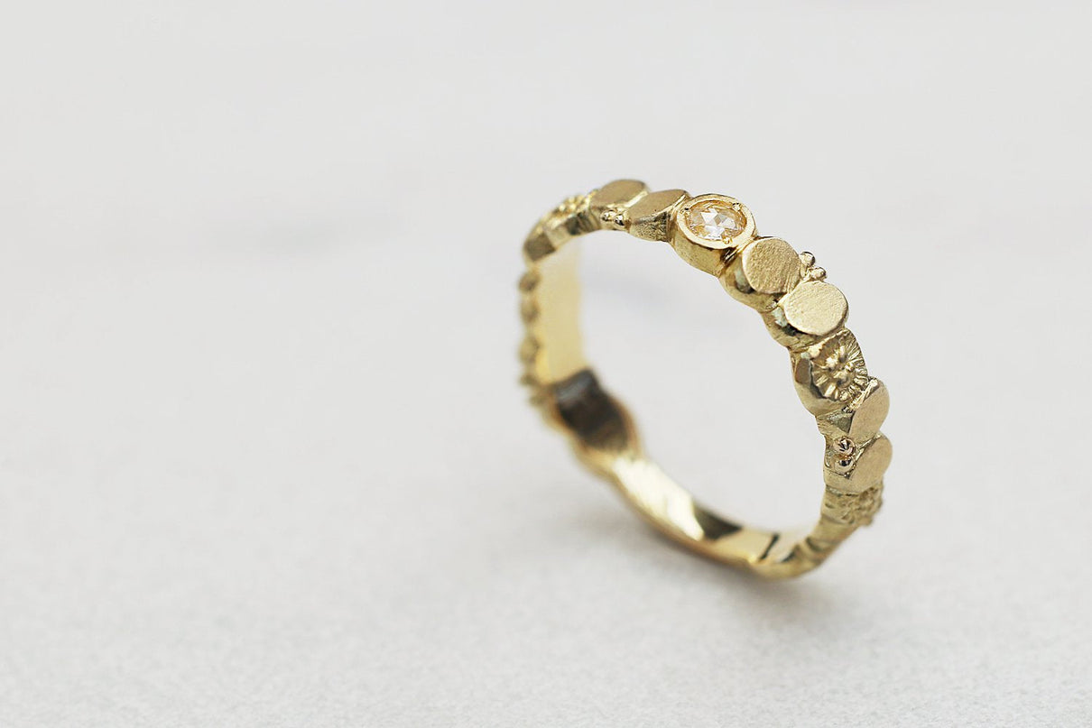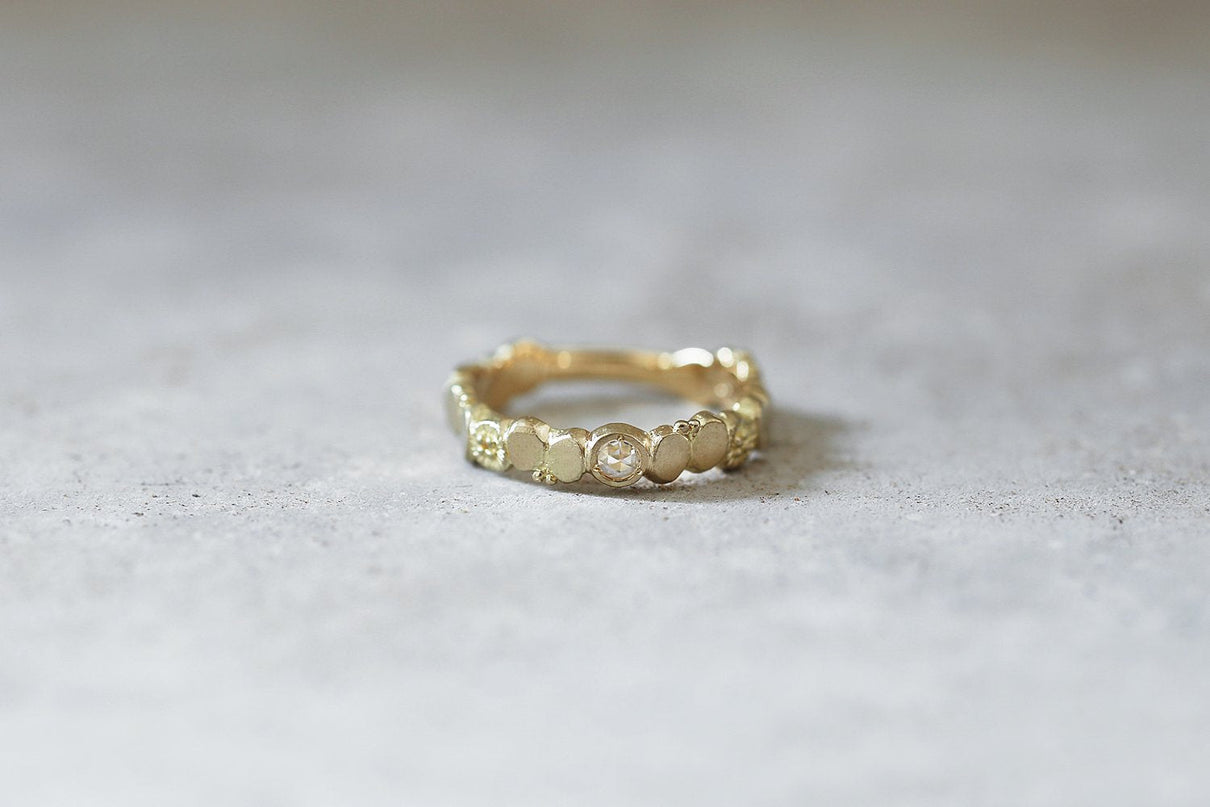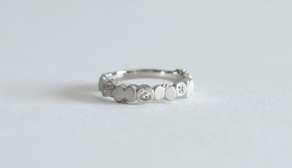 咲き誇る花々の中、たくさんのちょうちょが嬉しげに飛び回る姿をモチーフにしたエターナルリング。落ちつきのあるマット仕上げで、お花を挟みちょうちょが向きを変えて並ぶ動きを感じるデザインです。瑞々しく潤みを帯びたローズカットダイヤモンドが、華やぎを添えてくれるアイテムです。