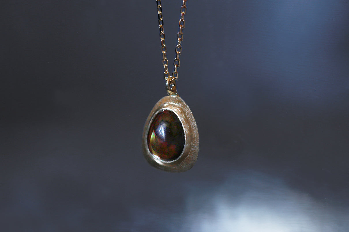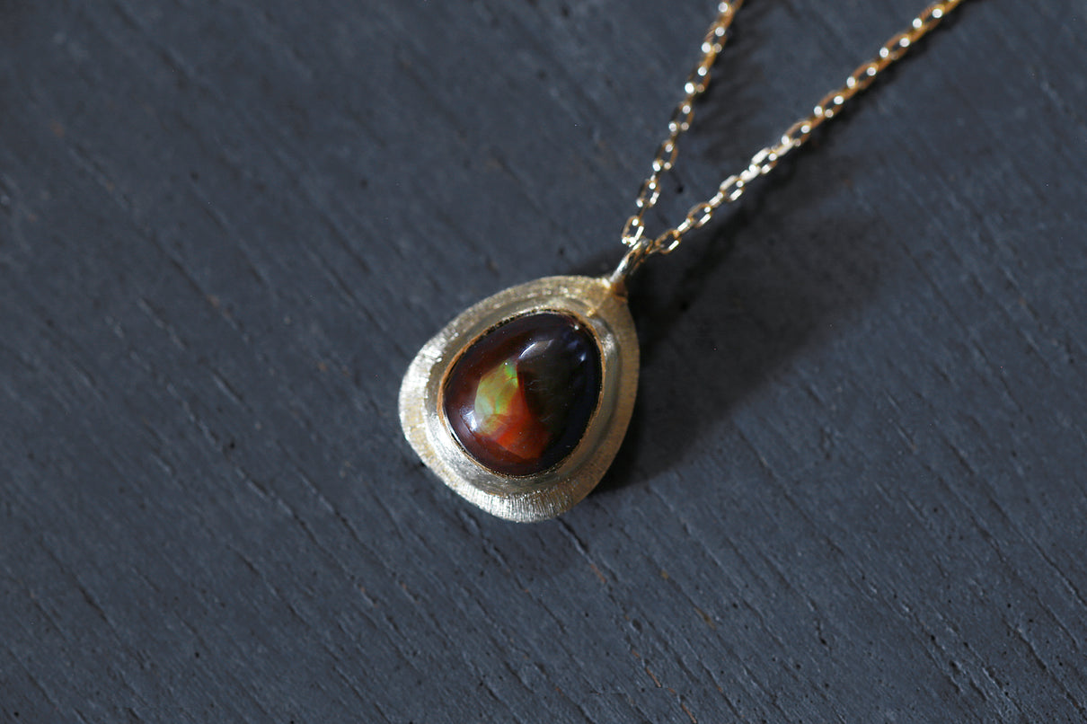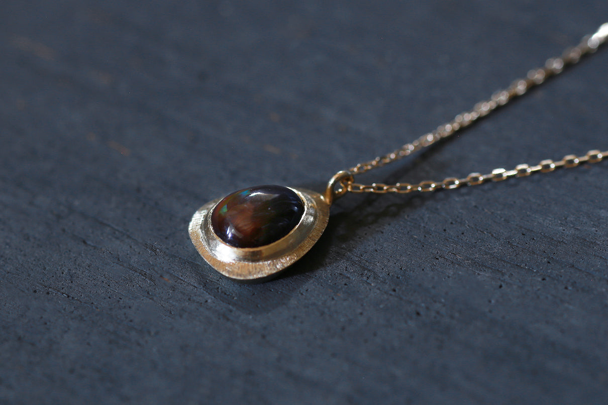 燃ゆる虹のような美しい表情を内包する、希少な"ファイヤーアゲート"で仕立てた1点もののネックレス。アゲート(瑪瑙)は世界中で産出される石の一つで、多様な色合いと表情を持ちますが、ビビットな色を含むハイクオリティピースのファイヤーアゲートは、限られた産出地でしか採れません。今回厳選したピースは、深みのあるダークブラウンの母石の中に、息を呑むような煌めきを織りなすイリデッセンス(鉱物が虹色に輝く光学現象)が、見る角度により表情をゆらゆらと変化させるもの。虹色の煌めきが立体的に光を反射し、小ぶりながら心地よい個性を活かしたピースを活かして、クラシカルな印象のK18ゴールドで縁取ったデザインに仕立てました。一見シンプルに見えるマットテクスチャーは、無数の繊細なラインが織り重なった質感。その髪一本分ほどの極細のラインは、宝石から放たれた光の様にやわらかく放射状に広がり、石の持つ煌めきをより一層引き立てます。自然が創り出した美しさに掻き立てられた想像が生んだ創造が、繊細な手仕事と一体となり、凛とした気配を放つよろこび溢れるネックレスです。