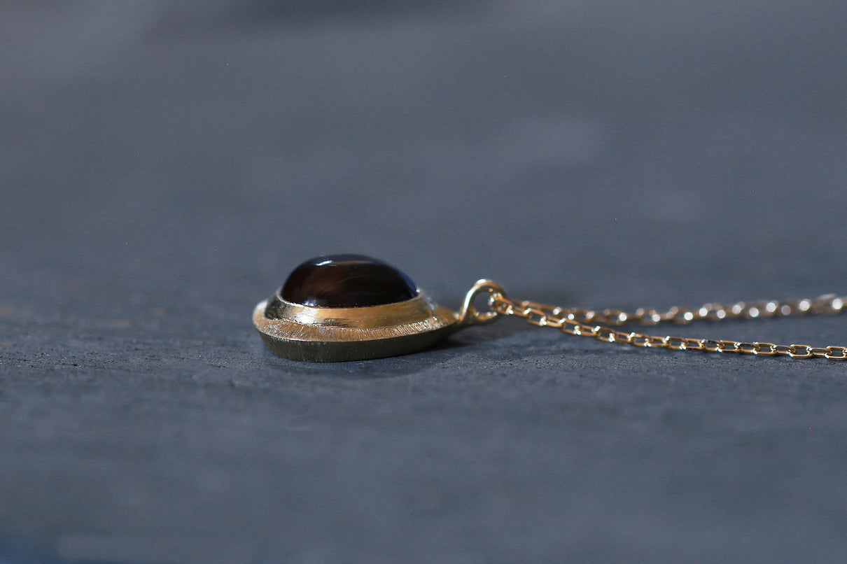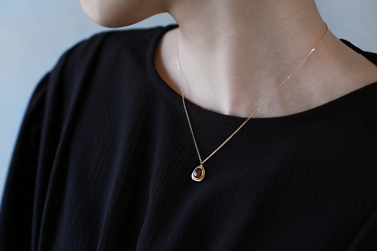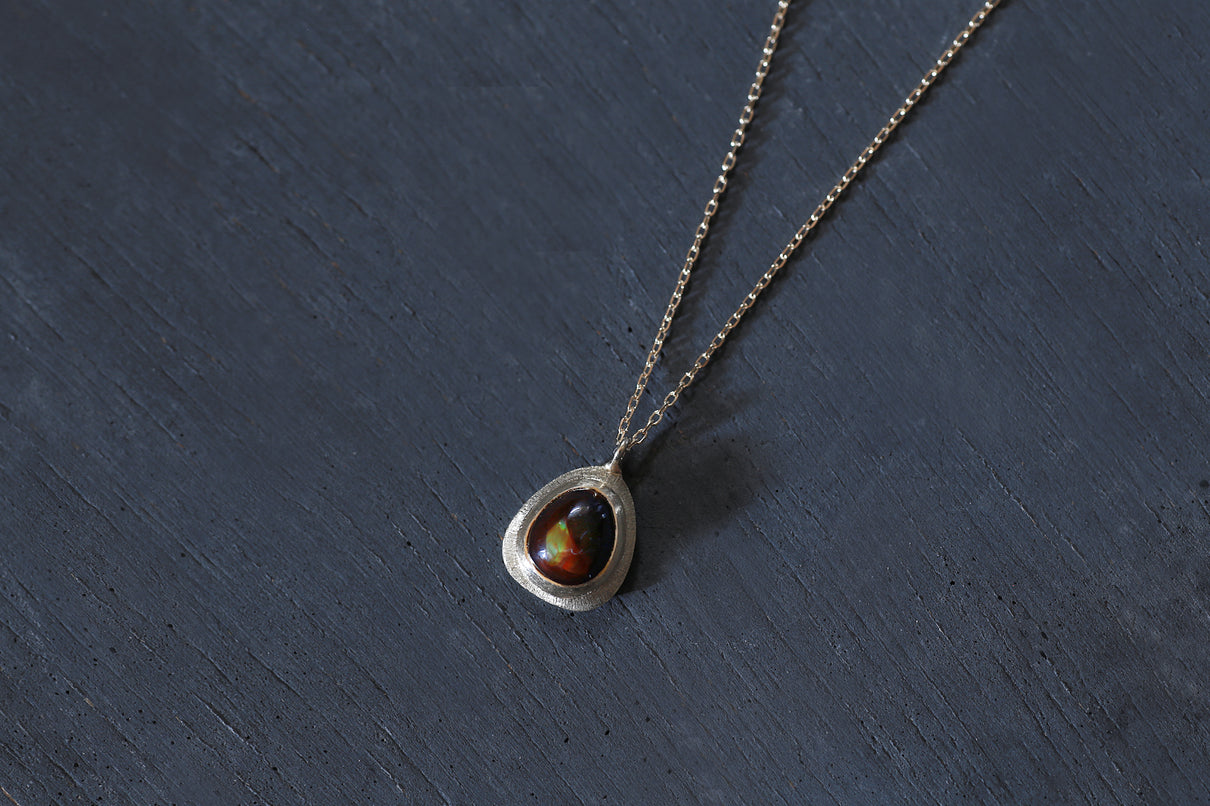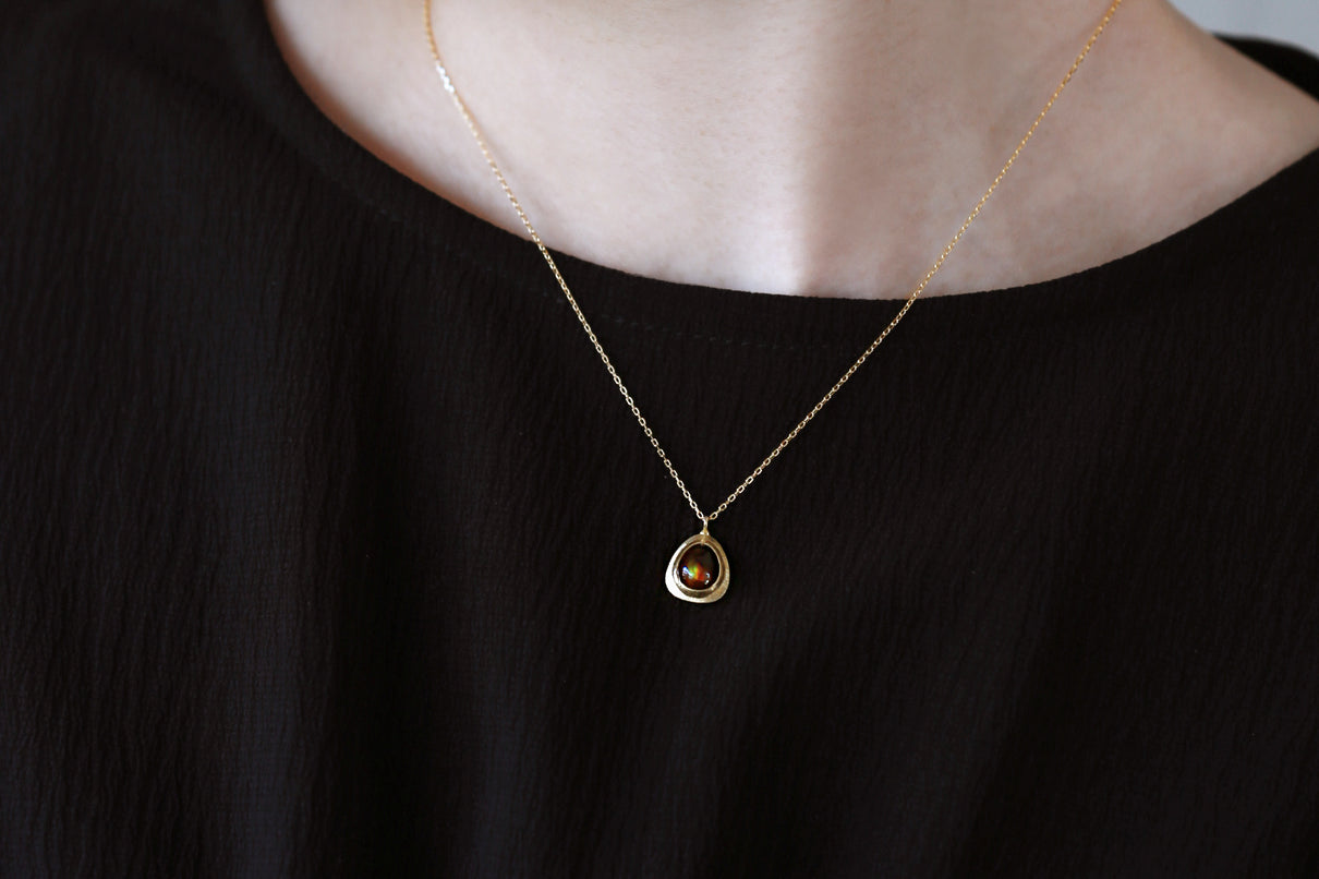 燃ゆる虹のような美しい表情を内包する、希少な"ファイヤーアゲート"で仕立てた1点もののネックレス。アゲート(瑪瑙)は世界中で産出される石の一つで、多様な色合いと表情を持ちますが、ビビットな色を含むハイクオリティピースのファイヤーアゲートは、限られた産出地でしか採れません。今回厳選したピースは、深みのあるダークブラウンの母石の中に、息を呑むような煌めきを織りなすイリデッセンス(鉱物が虹色に輝く光学現象)が、見る角度により表情をゆらゆらと変化させるもの。虹色の煌めきが立体的に光を反射し、小ぶりながら心地よい個性を活かしたピースを活かして、クラシカルな印象のK18ゴールドで縁取ったデザインに仕立てました。一見シンプルに見えるマットテクスチャーは、無数の繊細なラインが織り重なった質感。その髪一本分ほどの極細のラインは、宝石から放たれた光の様にやわらかく放射状に広がり、石の持つ煌めきをより一層引き立てます。自然が創り出した美しさに掻き立てられた想像が生んだ創造が、繊細な手仕事と一体となり、凛とした気配を放つよろこび溢れるネックレスです。