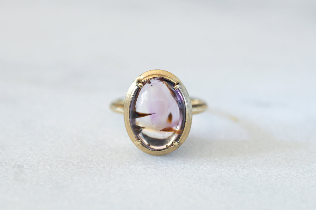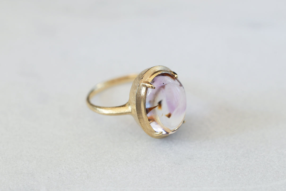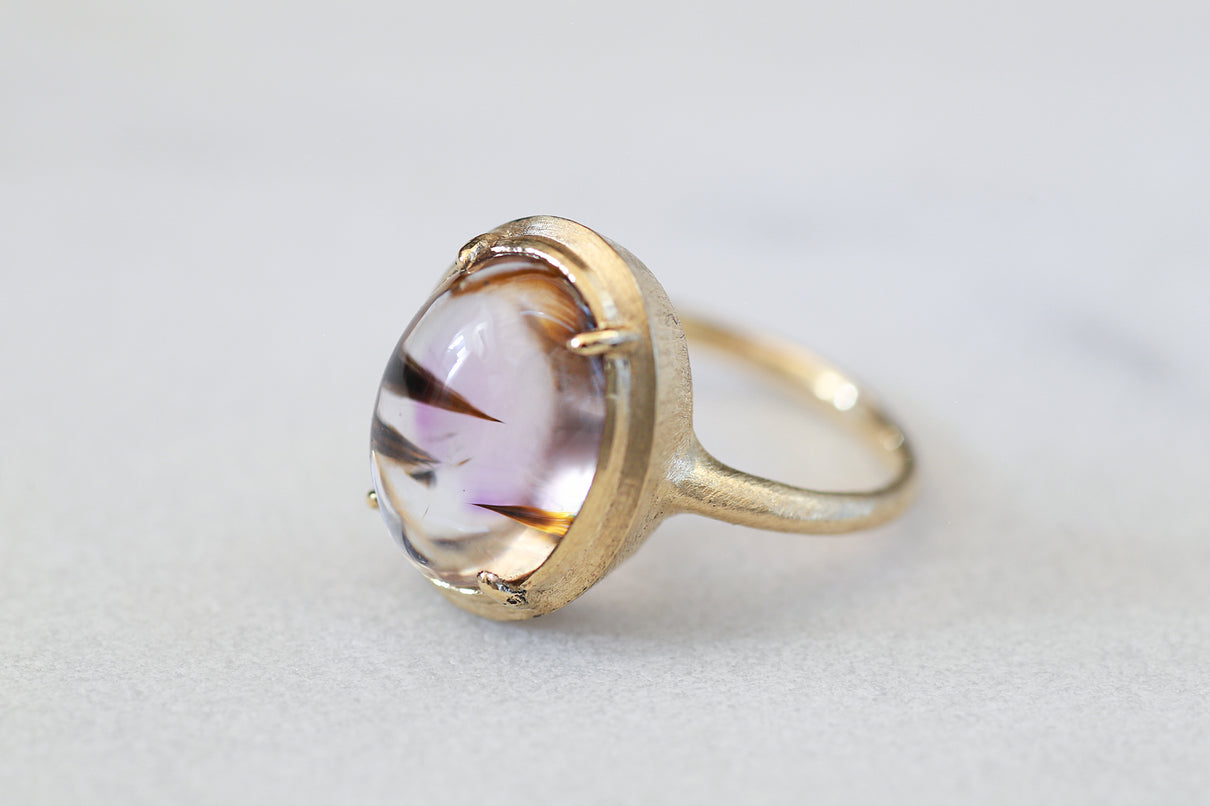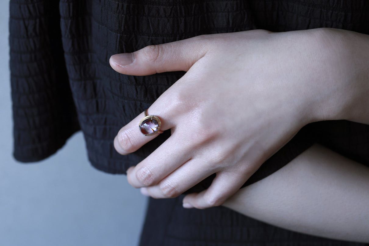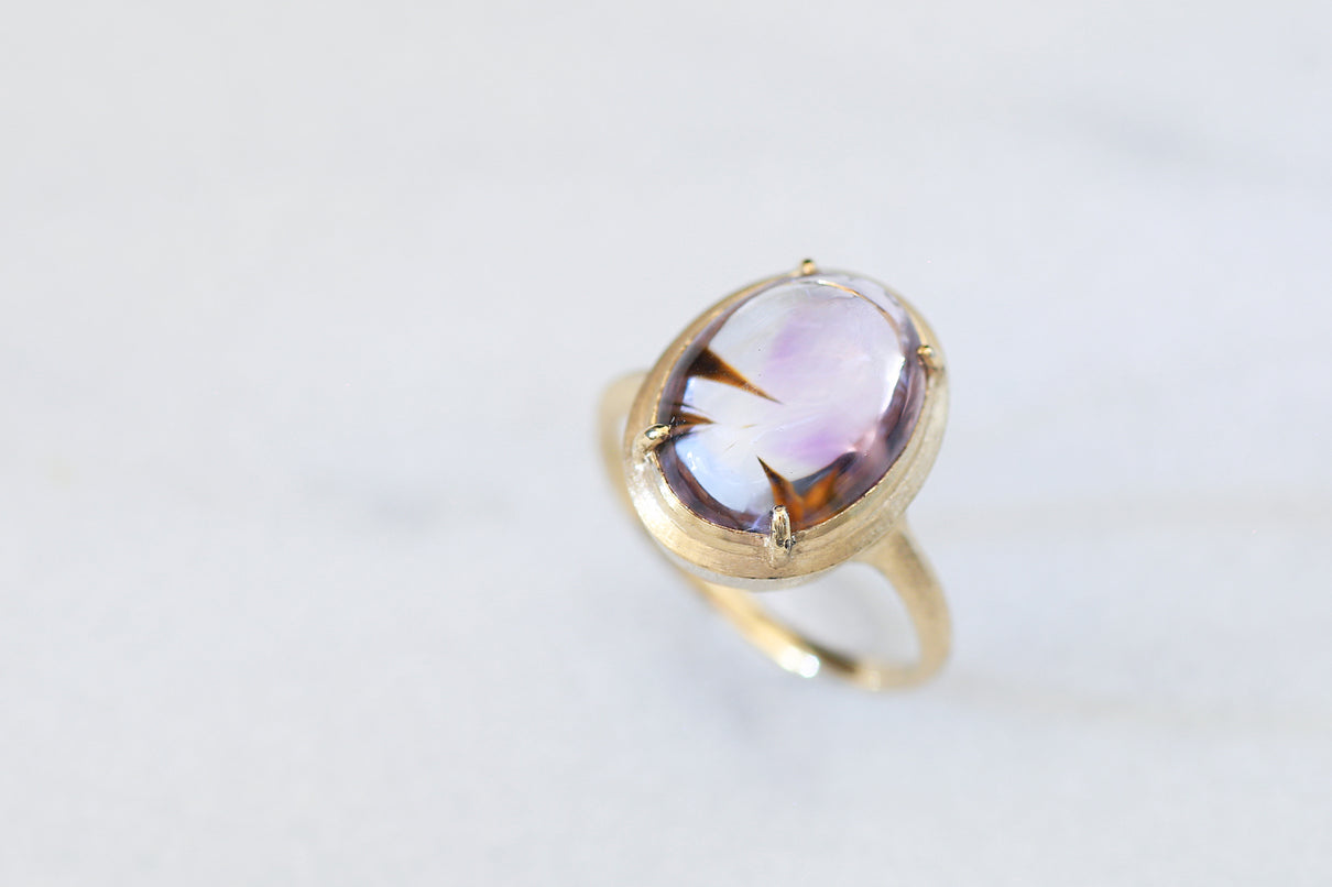 針状の繊細な結晶がシルキーな光沢を放つゲーサイトを内包した"ゲーサイトインアメジスト"で仕立てた1点もののリング。2月の誕生石としても有名な石なアメジストですが、中でも濃淡バランスが美しく、ユニークな表情かつ高品質で希少性の高いピースを厳選しました。淡い紫色の透明度が高いアメジストに浮かぶ、ブラウンカラーが特徴のゲーサイトが湖面に浮かぶ小鳥の羽のような、静寂さと繊細さを併せ持つ上品な佇まいです。その丸みのあるカボションカットを活かしつつ、愛らしい印象になりすぎない様、覆輪留めと爪留めを併せて、シャープな縁取りをした作りの中に繊細さも感じられるリングに仕立てました。K18ゴールドには内包物の印象に合わせたランダムかつ直線的なマットテクスチャーを施し、石周りの細部のみ艶仕上げで洗練させています。ゲーサイトインアメジストのみずみずしく潤みを帯びた美しい表情と、ベーシックながら確かな存在感を放つ佇まいが唯一無二のリング。2月の誕生石としても親しまれているアメジストは、2月生まれの方の特別なお守りとしてもお勧めです。