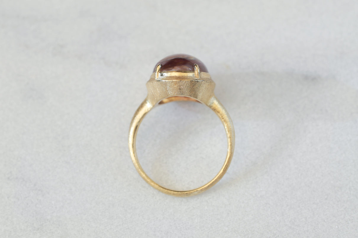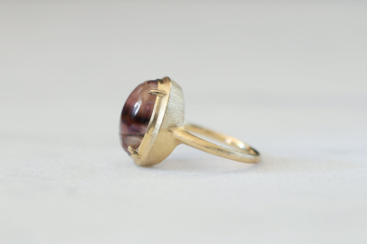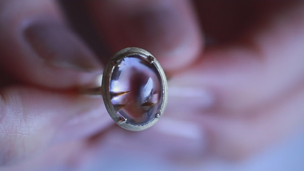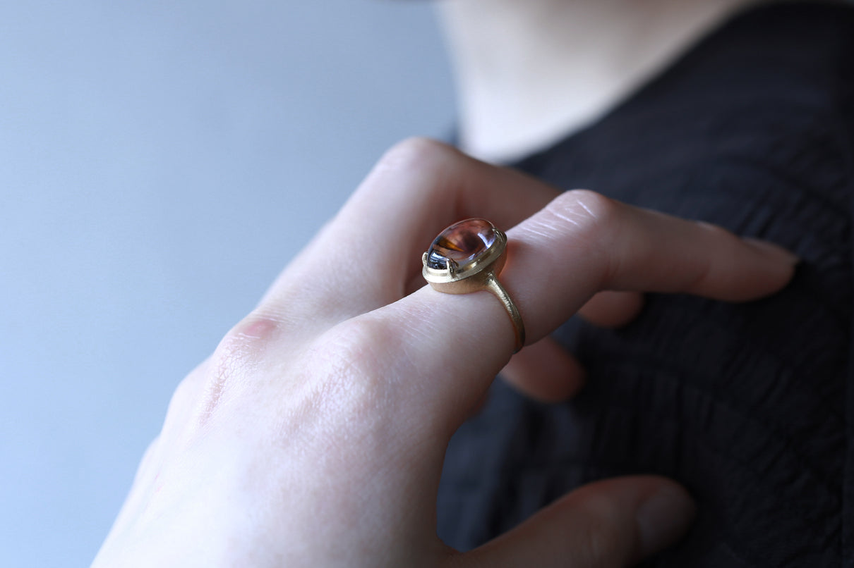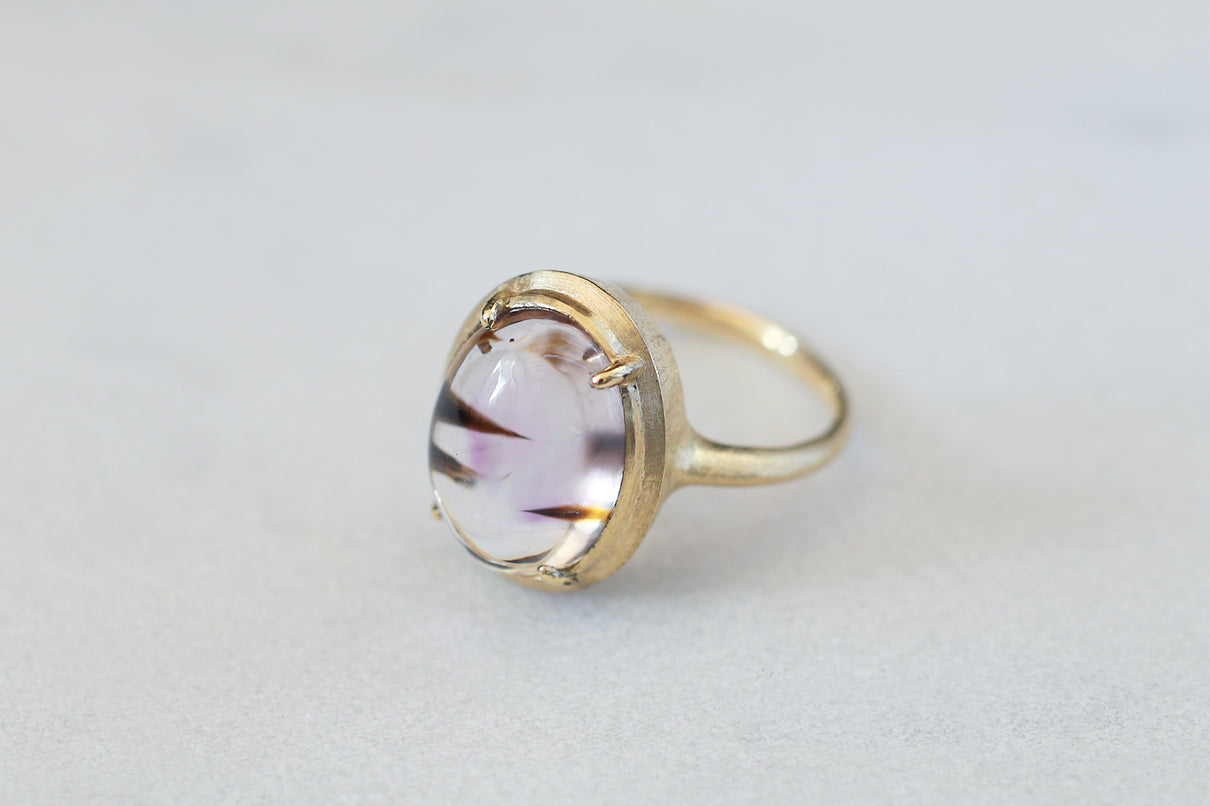 針状の繊細な結晶がシルキーな光沢を放つゲーサイトを内包した"ゲーサイトインアメジスト"で仕立てた1点もののリング。2月の誕生石としても有名な石なアメジストですが、中でも濃淡バランスが美しく、ユニークな表情かつ高品質で希少性の高いピースを厳選しました。淡い紫色の透明度が高いアメジストに浮かぶ、ブラウンカラーが特徴のゲーサイトが湖面に浮かぶ小鳥の羽のような、静寂さと繊細さを併せ持つ上品な佇まいです。その丸みのあるカボションカットを活かしつつ、愛らしい印象になりすぎない様、覆輪留めと爪留めを併せて、シャープな縁取りをした作りの中に繊細さも感じられるリングに仕立てました。K18ゴールドには内包物の印象に合わせたランダムかつ直線的なマットテクスチャーを施し、石周りの細部のみ艶仕上げで洗練させています。ゲーサイトインアメジストのみずみずしく潤みを帯びた美しい表情と、ベーシックながら確かな存在感を放つ佇まいが唯一無二のリング。2月の誕生石としても親しまれているアメジストは、2月生まれの方の特別なお守りとしてもお勧めです。