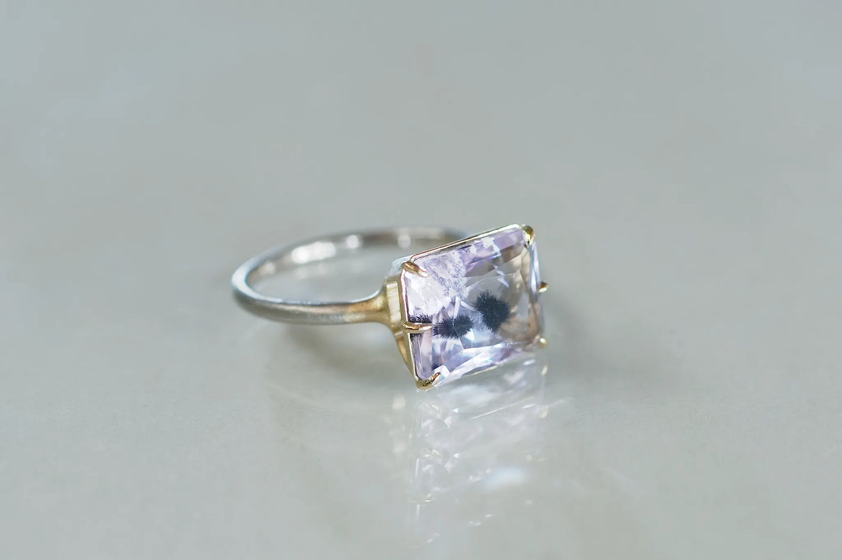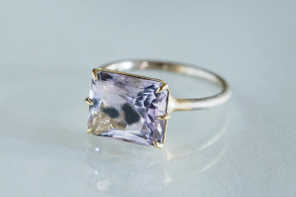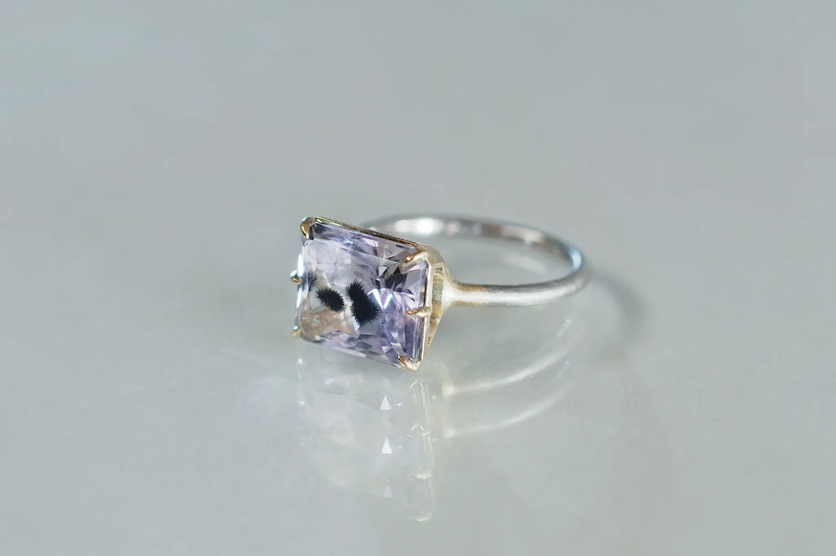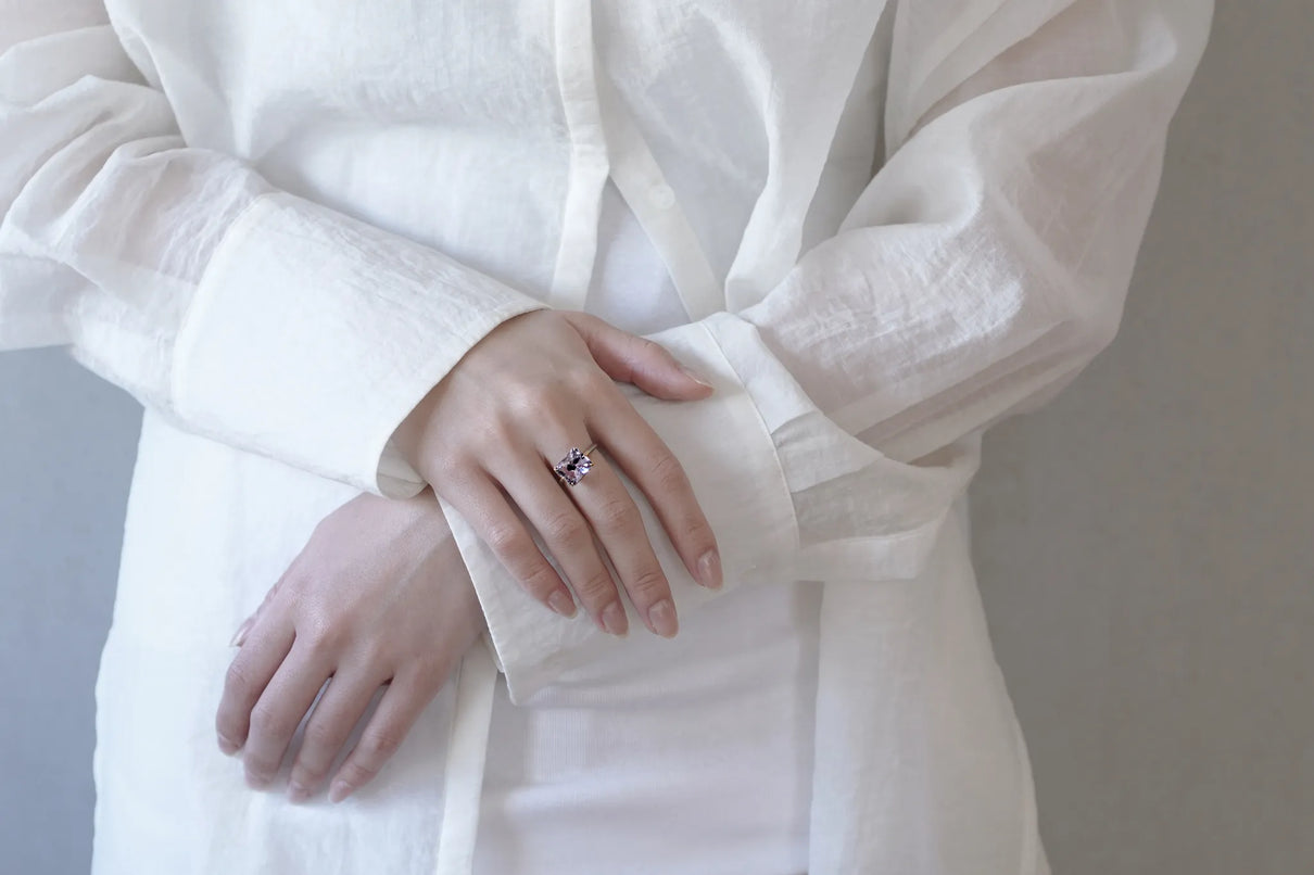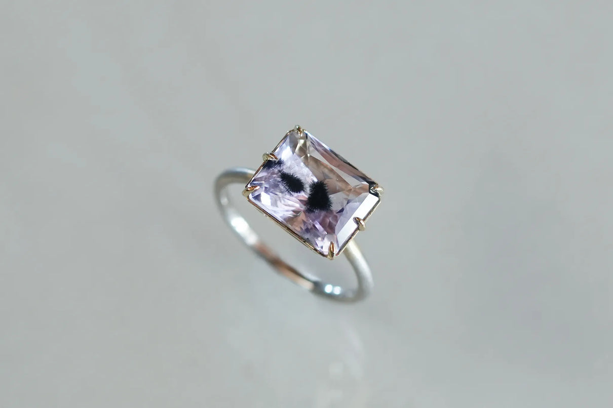 高品質で希少性の高いロマネサイトインアメジストで仕立てた一点もののリング。ロマネサイトは、"ロマネシュ鉱"と呼ばれる黒い金属光沢を持つ鉱物で、水晶などに共生することは非常に稀です。こちらのピースは、インクルージョンの姿を隅々まで観察できる淡く上品な色合いと高い透明度を有する、大変稀有な一点。ふわふわとした輪郭の細部までありありと見て取れる中央で浮遊する大きな二つのロマネサイトは、まるでひそひそと肩を寄せているかのような姿を見せる奥ゆかしさが魅力です。この希少なアメジストを支えるK18イエローゴールドの石座から続くリングアームが、なだらかな境界を描きながらK18ホワイトゴールドへと姿を変える、一目では気づきにくいそのこだわりの仕立てにもぜひご注目ください。2月の誕生石としても親しまれているアメジスト。2月生まれの方の特別なお守りとしてもお勧めです。