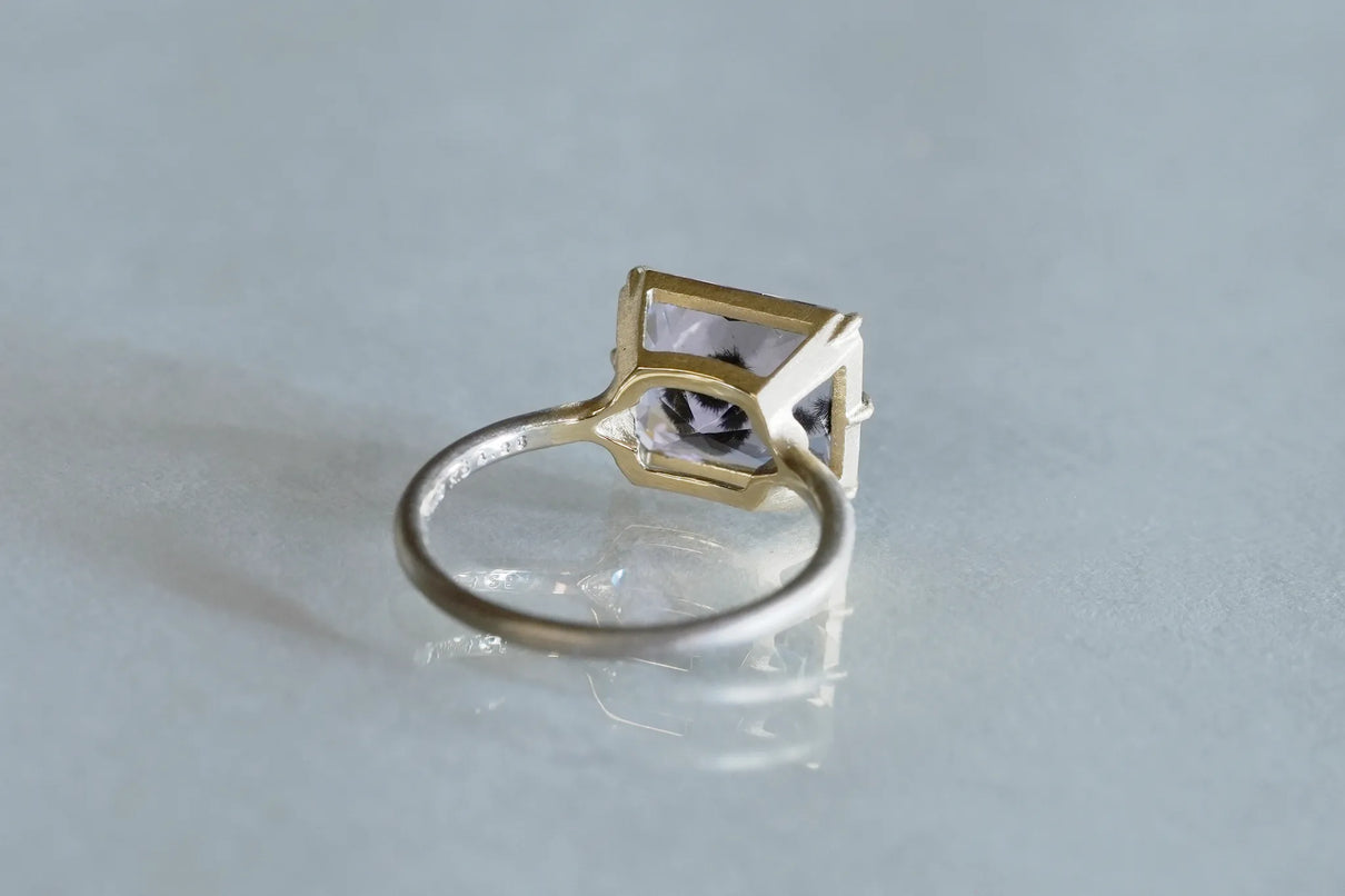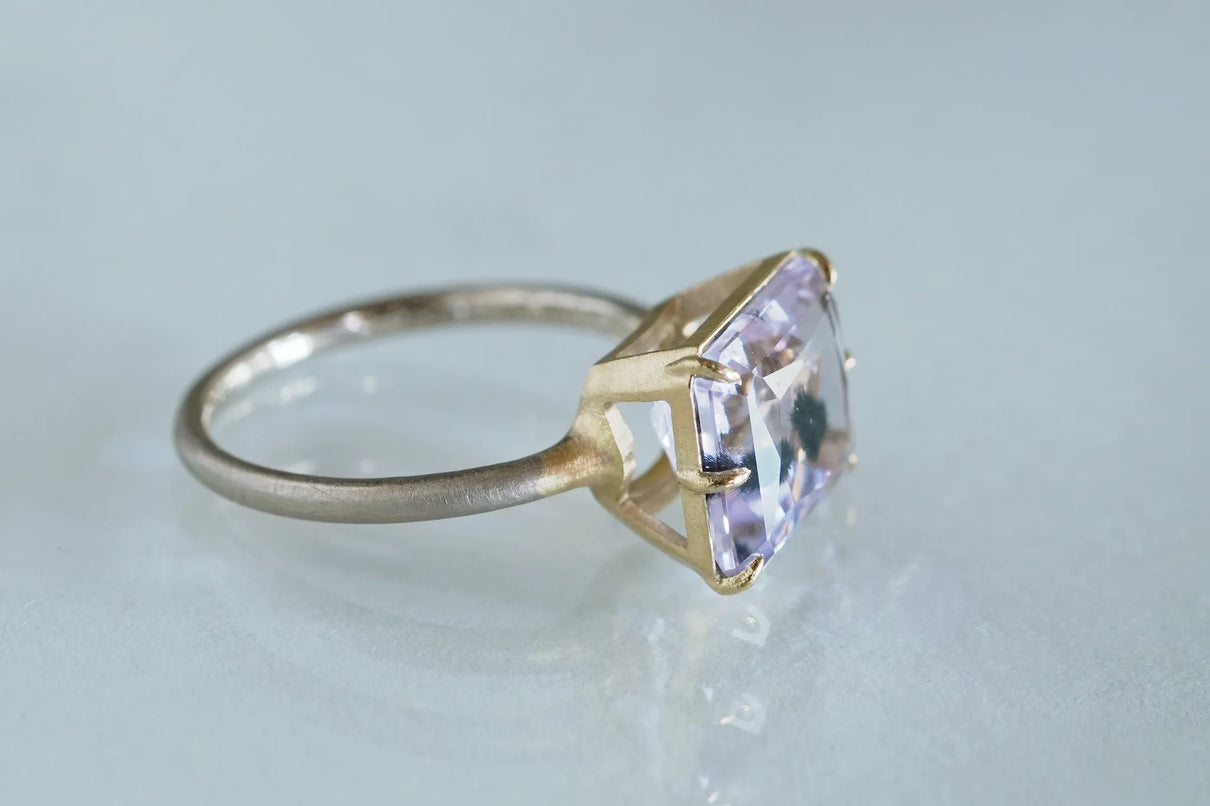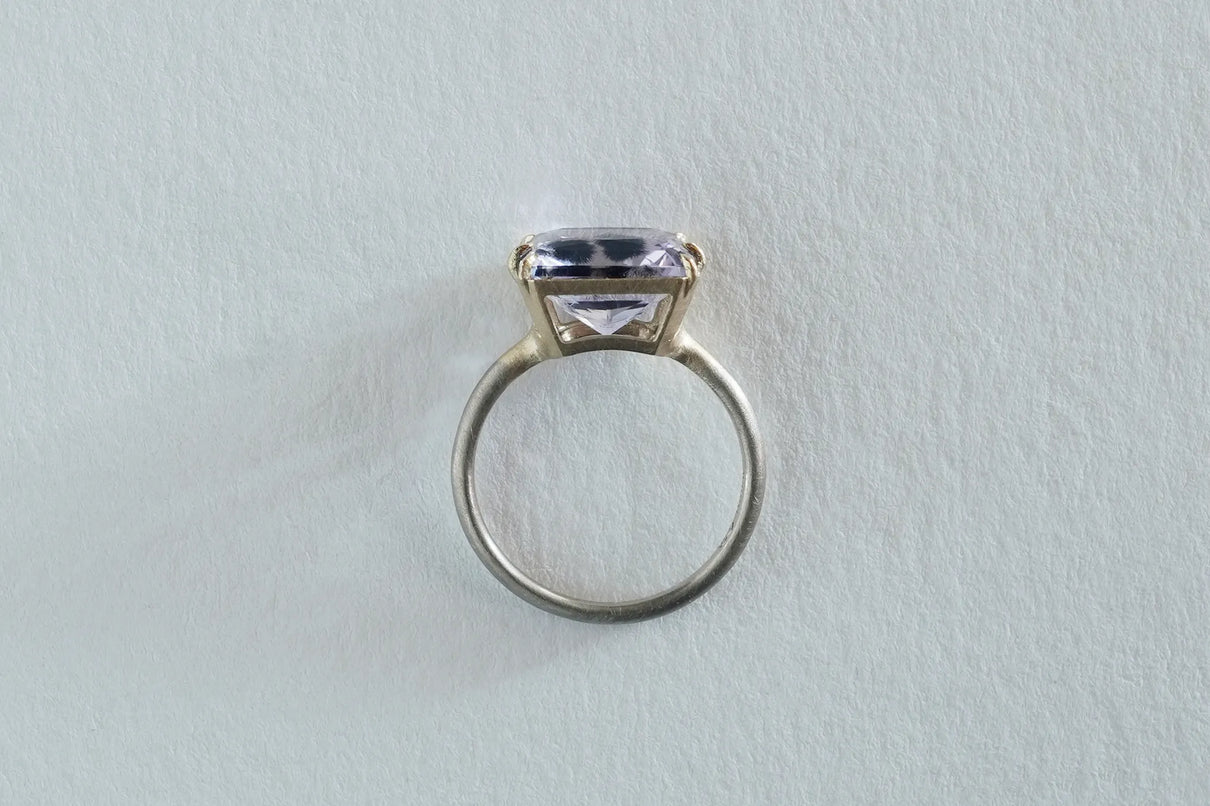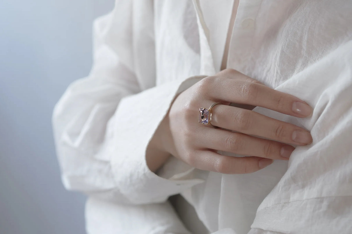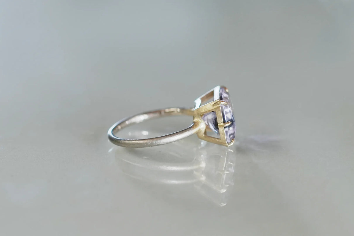 高品質で希少性の高いロマネサイトインアメジストで仕立てた一点もののリング。ロマネサイトは、"ロマネシュ鉱"と呼ばれる黒い金属光沢を持つ鉱物で、水晶などに共生することは非常に稀です。こちらのピースは、インクルージョンの姿を隅々まで観察できる淡く上品な色合いと高い透明度を有する、大変稀有な一点。ふわふわとした輪郭の細部までありありと見て取れる中央で浮遊する大きな二つのロマネサイトは、まるでひそひそと肩を寄せているかのような姿を見せる奥ゆかしさが魅力です。この希少なアメジストを支えるK18イエローゴールドの石座から続くリングアームが、なだらかな境界を描きながらK18ホワイトゴールドへと姿を変える、一目では気づきにくいそのこだわりの仕立てにもぜひご注目ください。2月の誕生石としても親しまれているアメジスト。2月生まれの方の特別なお守りとしてもお勧めです。